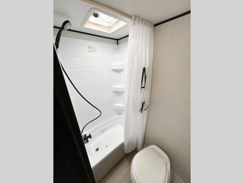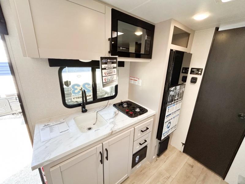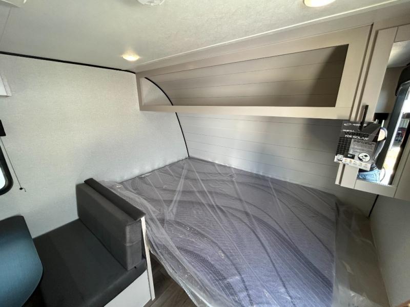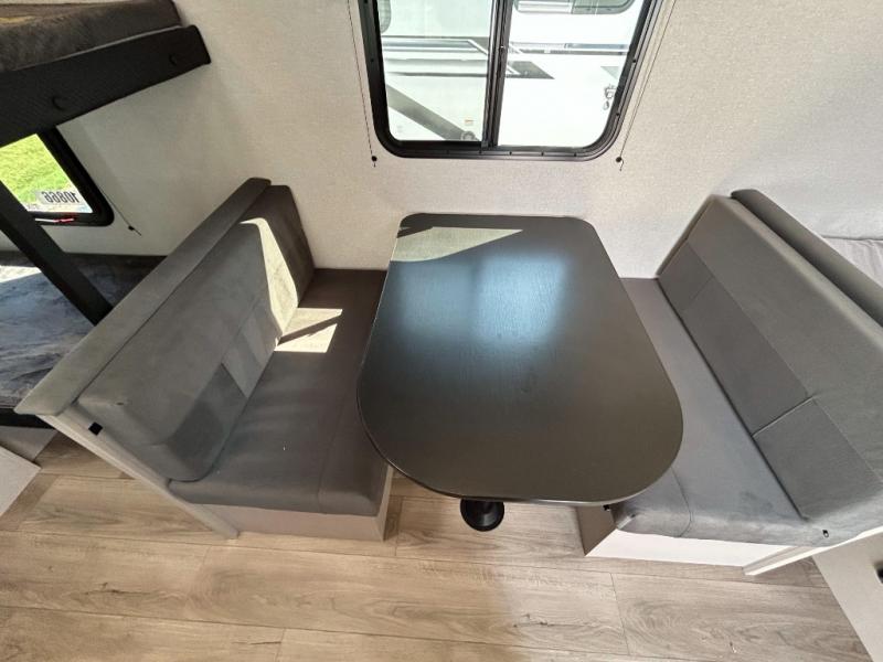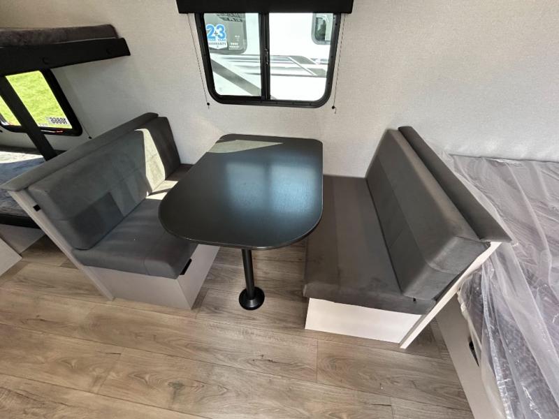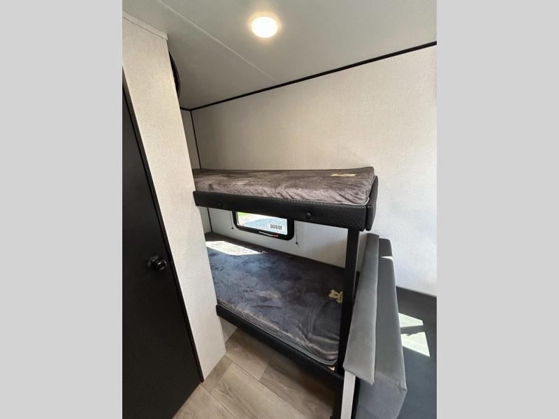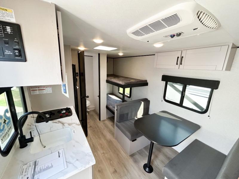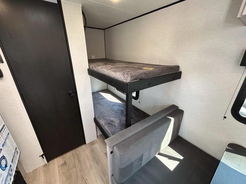This compact travel trailer has everything you need for convenient camping trips! Once you arrive at the park, you can unload the exterior storage and put out the 10' power awning. The two burner cooktop and microwave oven will let you make lunch for your crew, and there is a 5 cu. ft. 12V refrigerator to keep your cold items fresh. A booth dinette will provide dining space when you don't want to eat outdoors, and this can convert to sleeping space for one guest or two little ones. You'll appreciate the private bath with a toilet and 36" tub/shower to freshen up in each day, and the bunk beds in the back provide compact sleeping space for more campers. The front queen bed will be reserved just for you, and there is a nightstand, wardrobe, and overhead cabinet here to keep your things tidy!