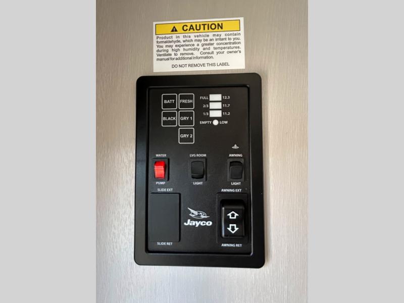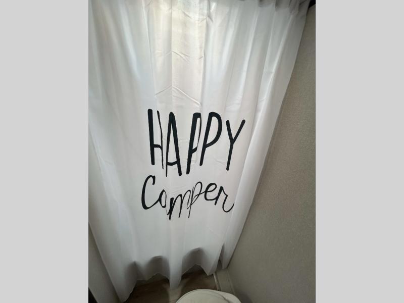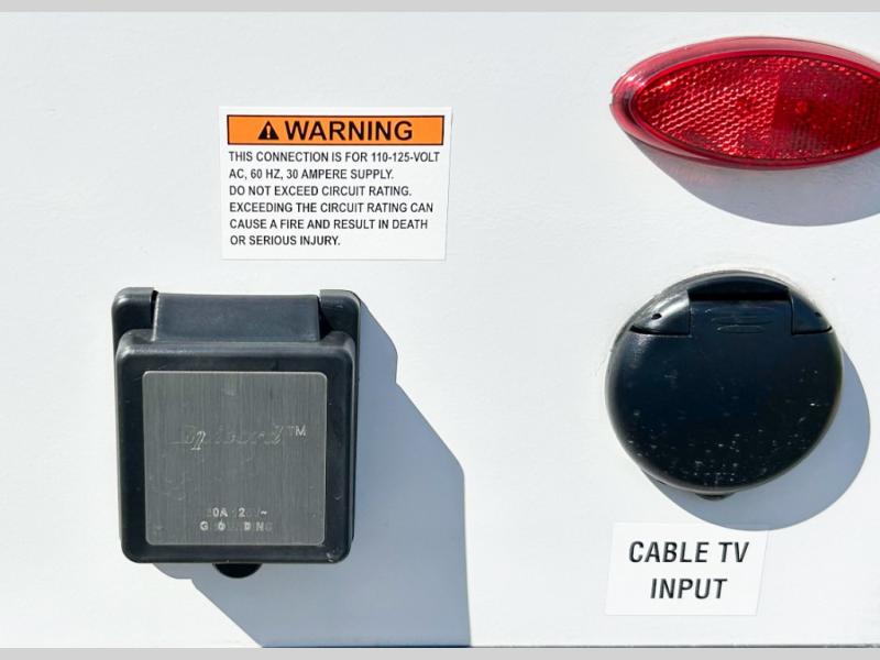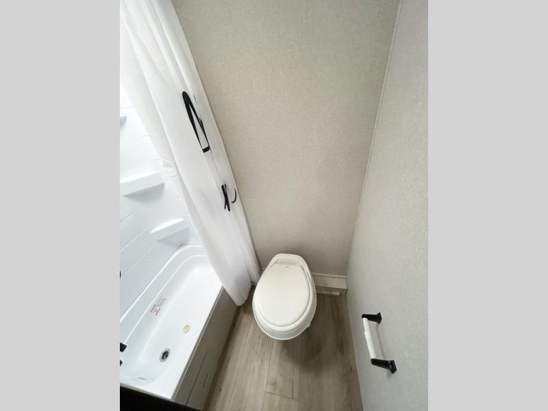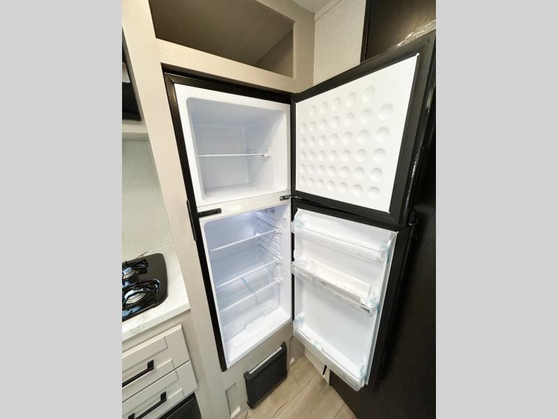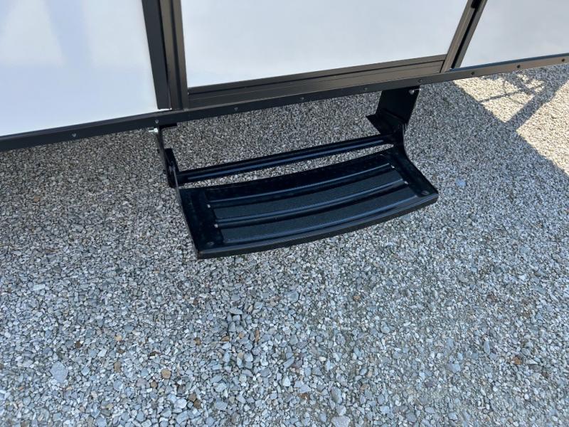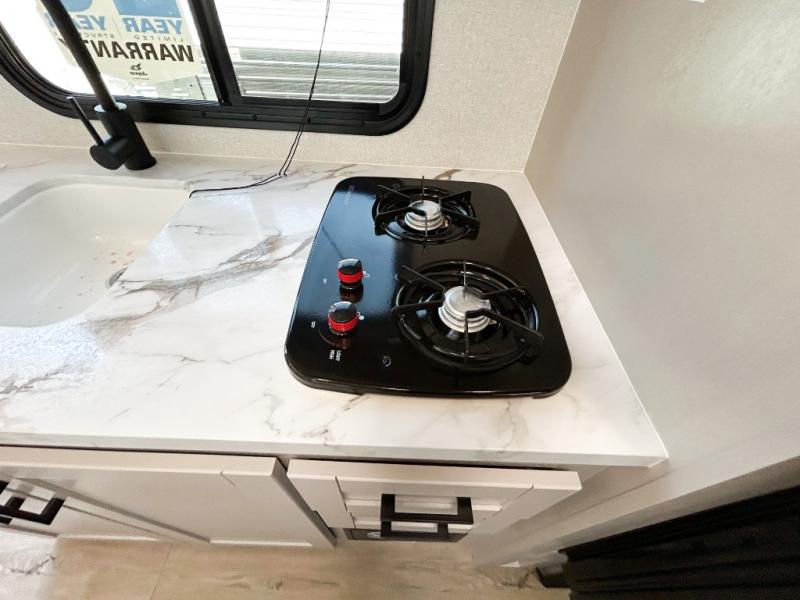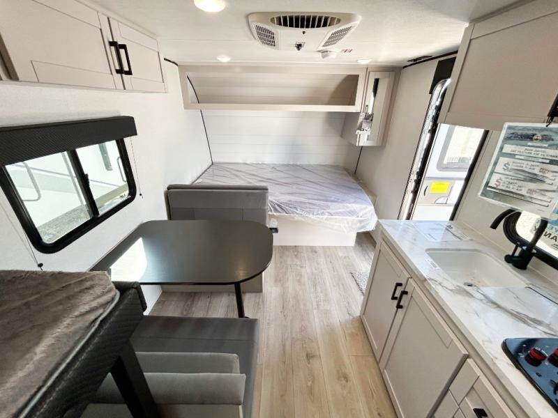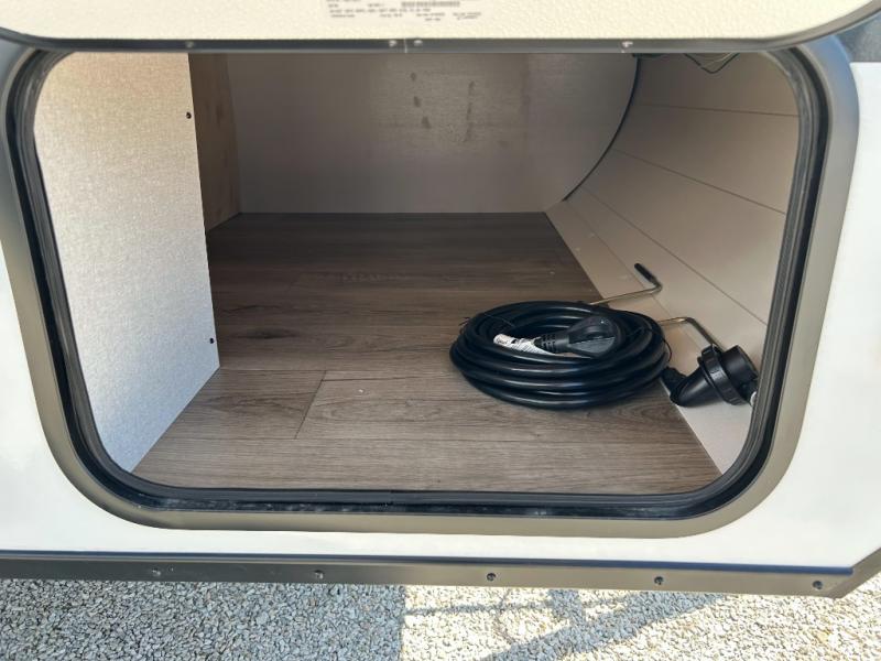 This compact travel trailer has everything you need for convenient camping trips! Once you arrive at the park, you can unload the exterior storage and put out the 10' power awning. The two burner cooktop and microwave oven will let you make lunch for your crew, and there is a 5 cu. ft. 12V refrigerator to keep your cold items fresh. A booth dinette will provide dining space when you don't want to eat outdoors, and this can convert to sleeping space for one guest or two little ones. You'll appreciate the private bath with a toilet and 36" tub/shower to freshen up in each day, and the bunk beds in the back provide compact sleeping space for more campers. The front queen bed will be reserved just for you, and there is a nightstand, wardrobe, and overhead cabinet here to keep your things tidy!