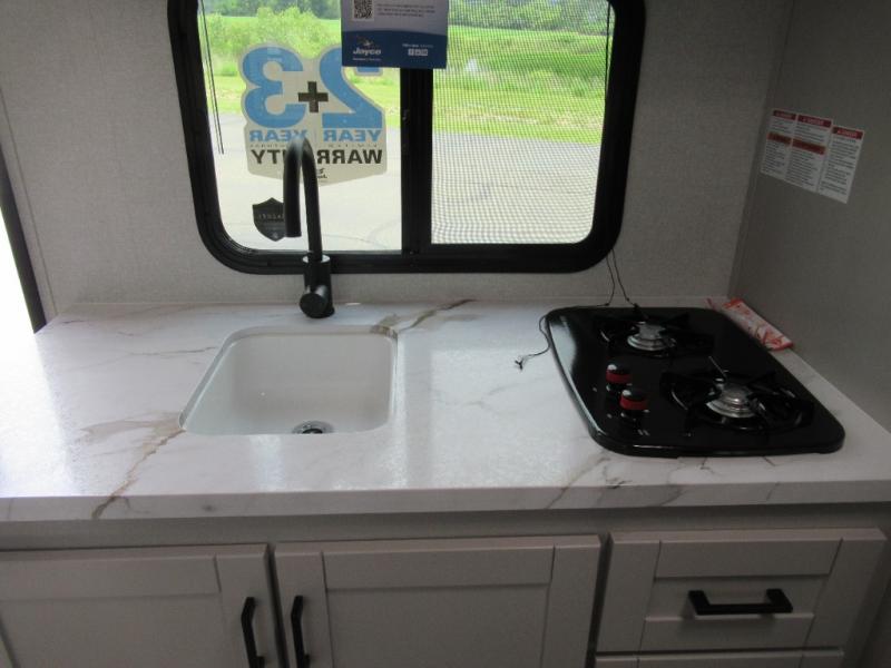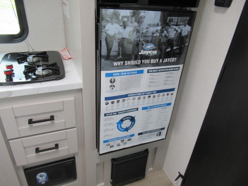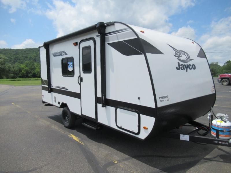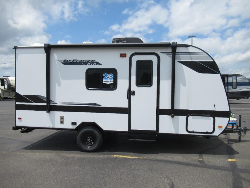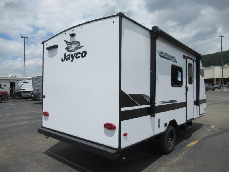 The Jay Feather Air SL travel trailer by Jayco is affordable, convenient, and lightweight for an easier tow! A Magnum Truss roof system and fully integrated A-frame provide a strong foundation to the trailer, plus there are galvanized-steel, impact resistant wheel wells for added protection. Some of the exterior conveniences you'll find include a front tongue jack and stabilizer jacks, roof mount solar prep, an exterior porch light, and G20 dark tinted privacy windows. Head inside to enjoy solid hardwood cabinet doors, residential-style kitchen countertops, a marine-grade toilet with foot flush, and vinyl flooring throughout that will be easy to keep clean. This super lite travel trailer is the perfect choice for rookie RVers and seasoned campers alike!