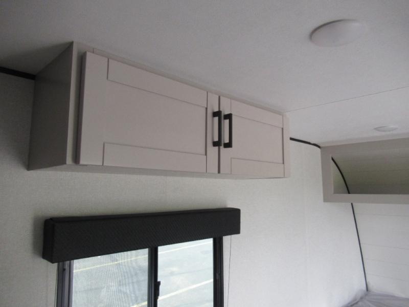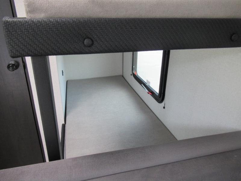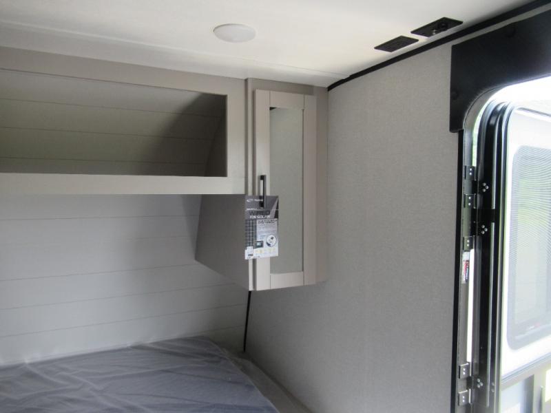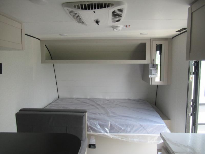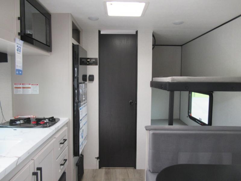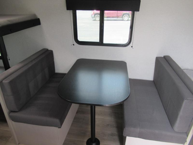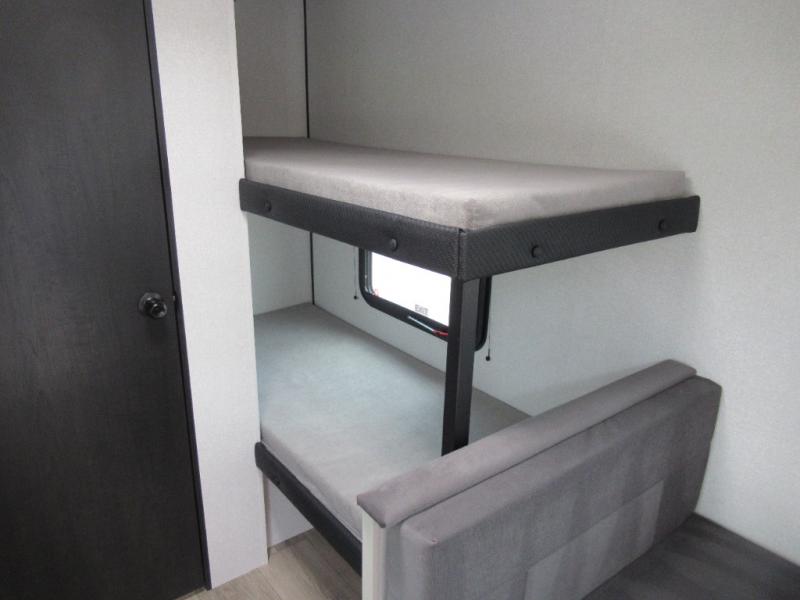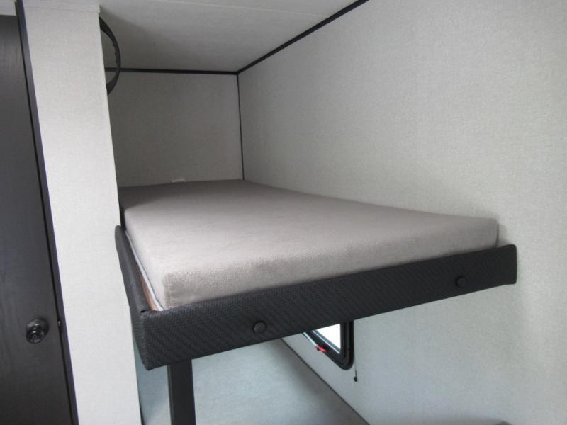 This compact travel trailer has everything you need for convenient camping trips! Once you arrive at the park, you can unload the exterior storage and put out the 10' power awning. The two burner cooktop and microwave oven will let you make lunch for your crew, and there is a 5 cu. ft. 12V refrigerator to keep your cold items fresh. A booth dinette will provide dining space when you don't want to eat outdoors, and this can convert to sleeping space for one guest or two little ones. You'll appreciate the private bath with a toilet and 36" tub/shower to freshen up in each day, and the bunk beds in the back provide compact sleeping space for more campers. The front queen bed will be reserved just for you, and there is a nightstand, wardrobe, and overhead cabinet here to keep your things tidy!