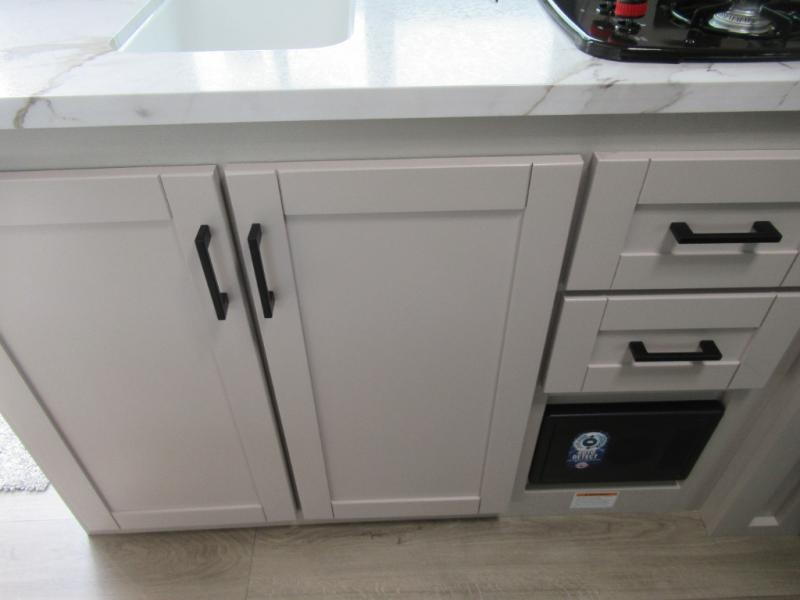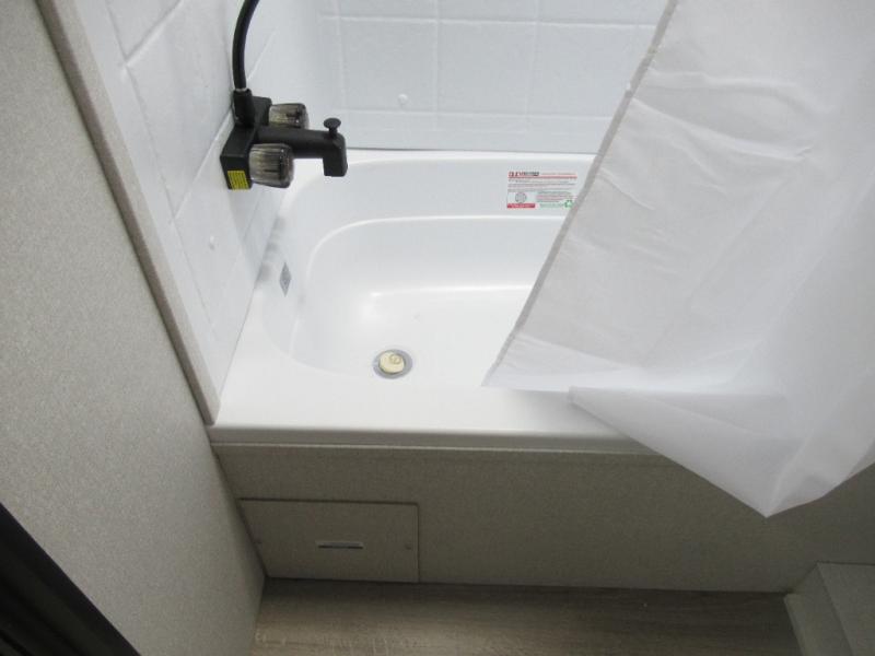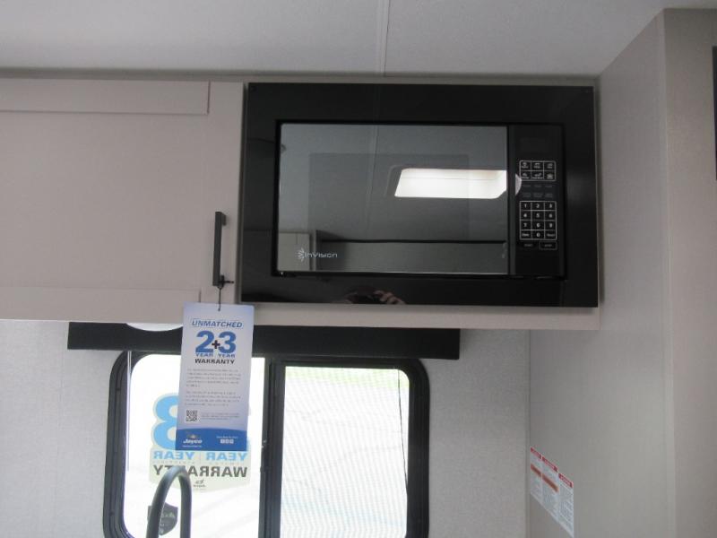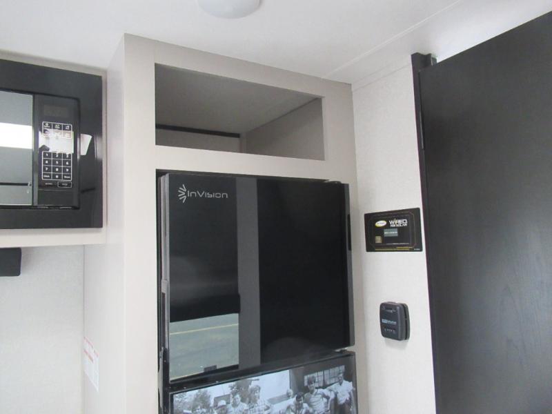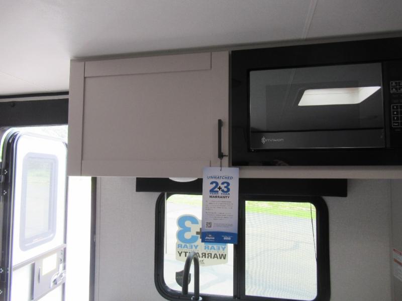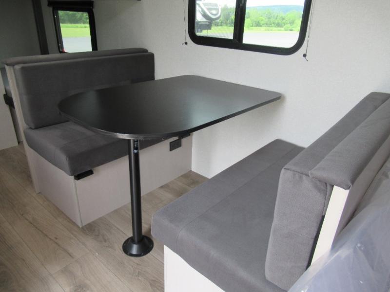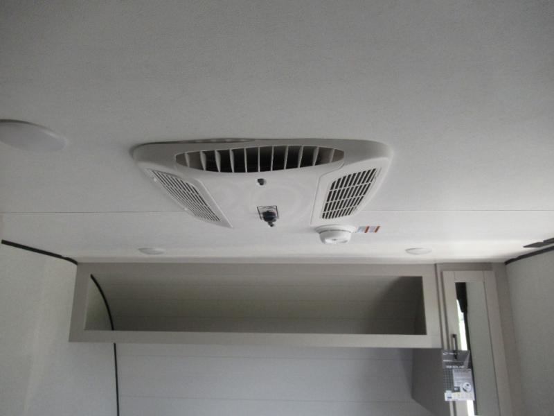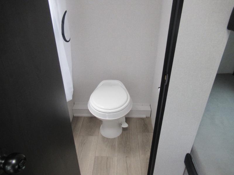 This compact travel trailer has everything you need for convenient camping trips! Once you arrive at the park, you can unload the exterior storage and put out the 10' power awning. The two burner cooktop and microwave oven will let you make lunch for your crew, and there is a 5 cu. ft. 12V refrigerator to keep your cold items fresh. A booth dinette will provide dining space when you don't want to eat outdoors, and this can convert to sleeping space for one guest or two little ones. You'll appreciate the private bath with a toilet and 36" tub/shower to freshen up in each day, and the bunk beds in the back provide compact sleeping space for more campers. The front queen bed will be reserved just for you, and there is a nightstand, wardrobe, and overhead cabinet here to keep your things tidy!