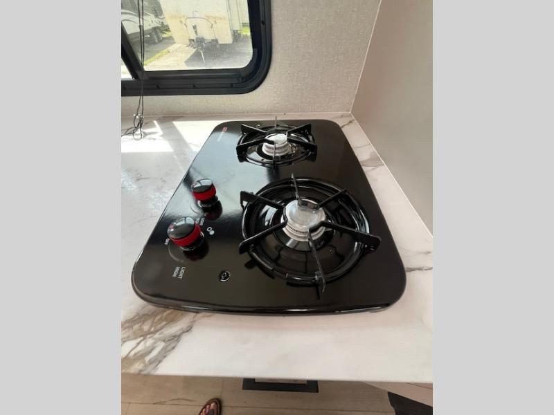 This compact travel trailer has everything you need for convenient camping trips! Once you arrive at the park, you can unload the exterior storage and put out the 10' power awning. The two burner cooktop and microwave oven will let you make lunch for your crew, and there is a 5 cu. ft. 12V refrigerator to keep your cold items fresh. A booth dinette will provide dining space when you don't want to eat outdoors, and this can convert to sleeping space for one guest or two little ones. You'll appreciate the private bath with a toilet and 36" tub/shower to freshen up in each day, and the bunk beds in the back provide compact sleeping space for more campers. The front queen bed will be reserved just for you, and there is a nightstand, wardrobe, and overhead cabinet here to keep your things tidy!
