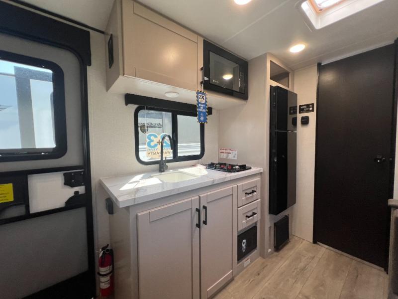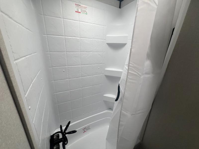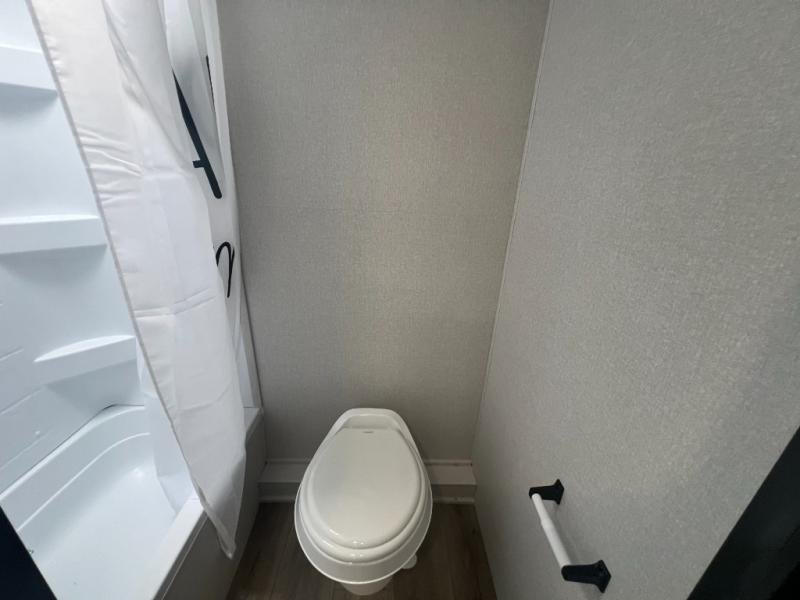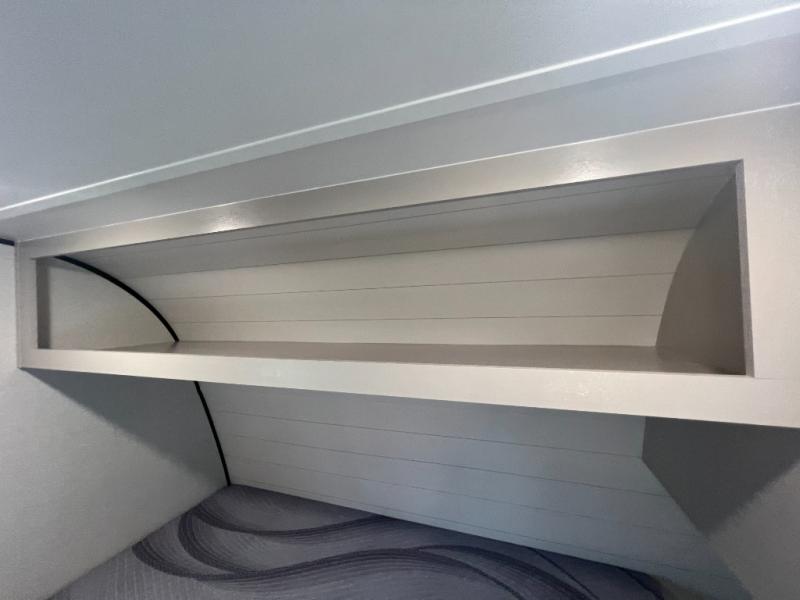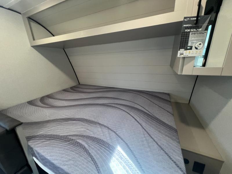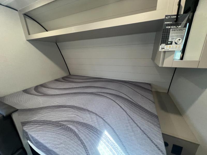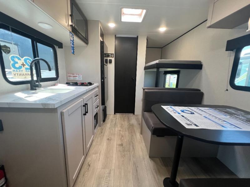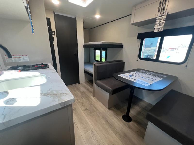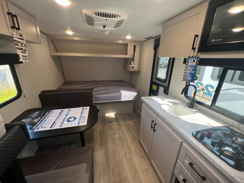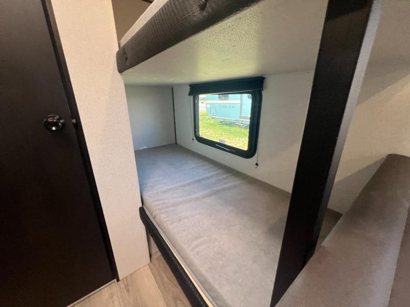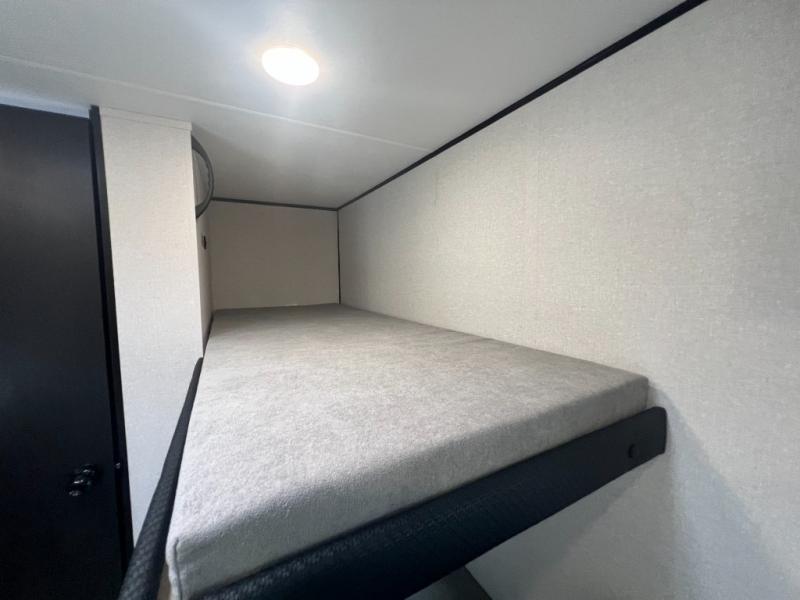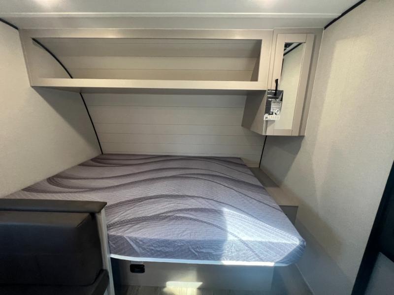 This compact travel trailer has everything you need for convenient camping trips! Once you arrive at the park, you can unload the exterior storage and put out the 10' power awning. The two burner cooktop and microwave oven will let you make lunch for your crew, and there is a 5 cu. ft. 12V refrigerator to keep your cold items fresh. A booth dinette will provide dining space when you don't want to eat outdoors, and this can convert to sleeping space for one guest or two little ones. You'll appreciate the private bath with a toilet and 36" tub/shower to freshen up in each day, and the bunk beds in the back provide compact sleeping space for more campers. The front queen bed will be reserved just for you, and there is a nightstand, wardrobe, and overhead cabinet here to keep your things tidy!