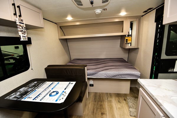 This compact travel trailer has everything you need for convenient camping trips! Once you arrive at the park, you can unload the exterior storage and put out the 10' power awning. The two burner cooktop and microwave oven will let you make lunch for your crew, and there is a 5 cu. ft. 12V refrigerator to keep your cold items fresh. A booth dinette will provide dining space when you don't want to eat outdoors, and this can convert to sleeping space for one guest or two little ones. You'll appreciate the private bath with a toilet and 36" tub/shower to freshen up in each day, and the bunk beds in the back provide compact sleeping space for more campers. The front queen bed will be reserved just for you, and there is a nightstand, wardrobe, and overhead cabinet here to keep your things tidy!