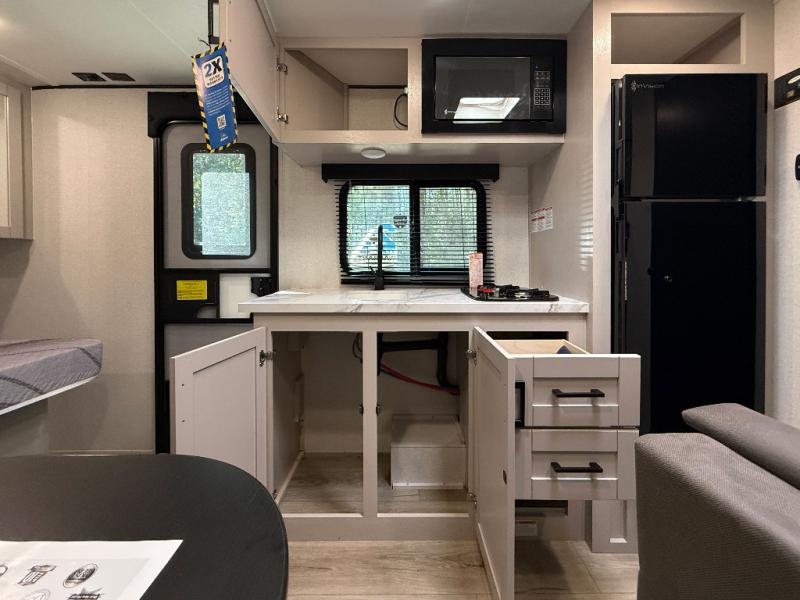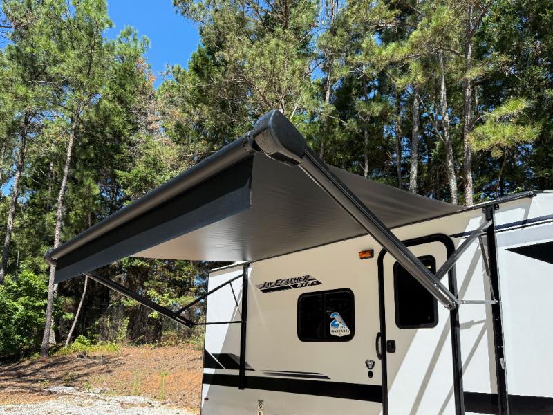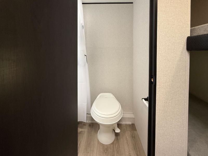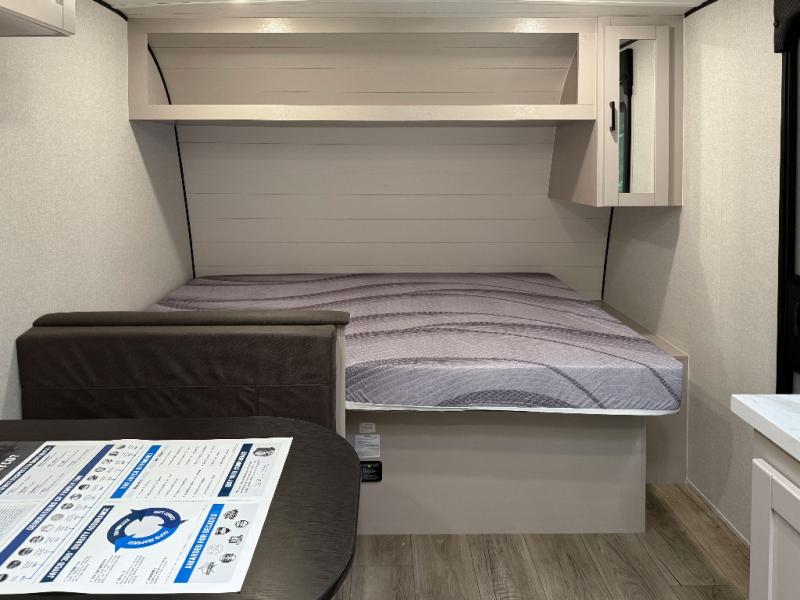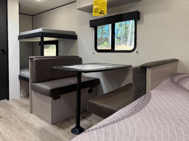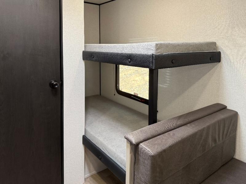 This compact travel trailer has everything you need for convenient camping trips! Once you arrive at the park, you can unload the exterior storage and put out the 10' power awning. The two burner cooktop and microwave oven will let you make lunch for your crew, and there is a 5 cu. ft. 12V refrigerator to keep your cold items fresh. A booth dinette will provide dining space when you don't want to eat outdoors, and this can convert to sleeping space for one guest or two little ones. You'll appreciate the private bath with a toilet and 36" tub/shower to freshen up in each day, and the bunk beds in the back provide compact sleeping space for more campers. The front queen bed will be reserved just for you, and there is a nightstand, wardrobe, and overhead cabinet here to keep your things tidy!