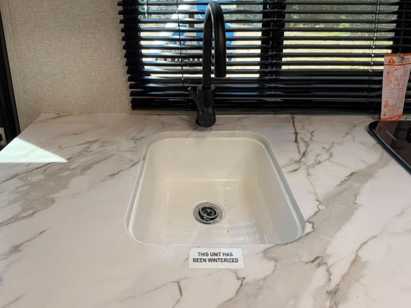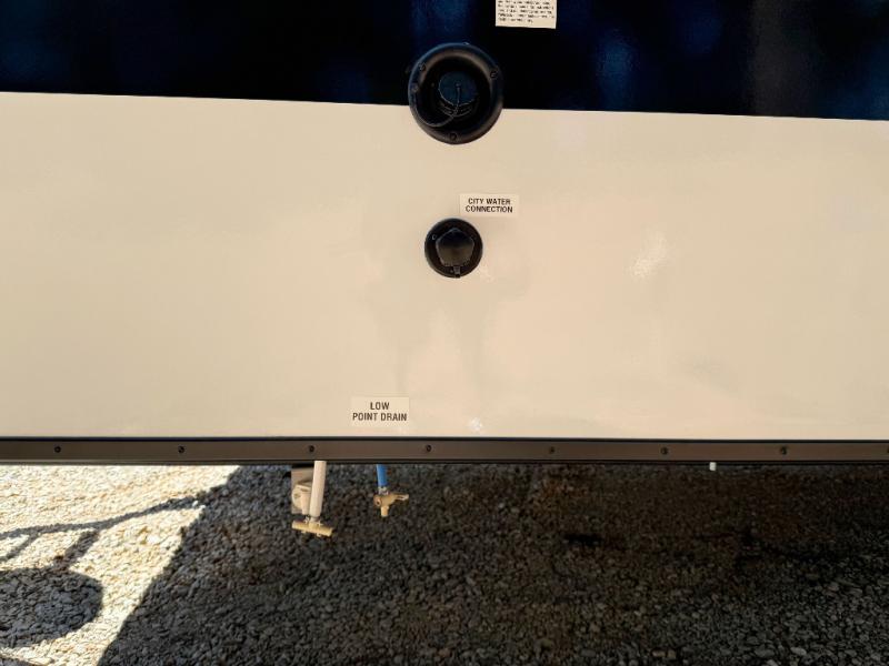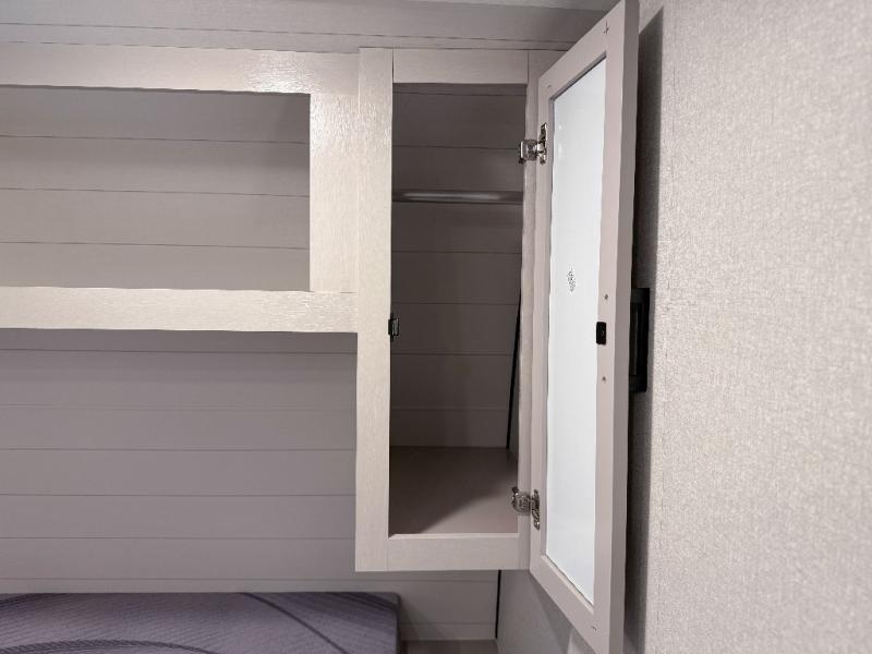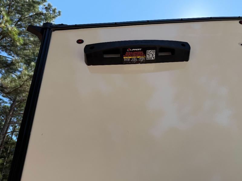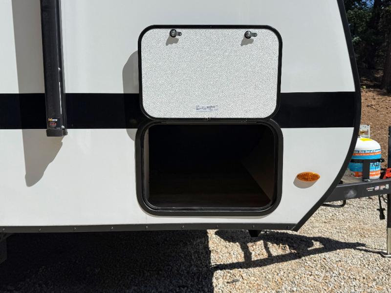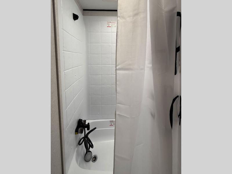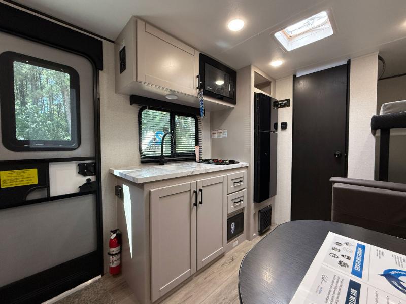 This compact travel trailer has everything you need for convenient camping trips! Once you arrive at the park, you can unload the exterior storage and put out the 10' power awning. The two burner cooktop and microwave oven will let you make lunch for your crew, and there is a 5 cu. ft. 12V refrigerator to keep your cold items fresh. A booth dinette will provide dining space when you don't want to eat outdoors, and this can convert to sleeping space for one guest or two little ones. You'll appreciate the private bath with a toilet and 36" tub/shower to freshen up in each day, and the bunk beds in the back provide compact sleeping space for more campers. The front queen bed will be reserved just for you, and there is a nightstand, wardrobe, and overhead cabinet here to keep your things tidy!