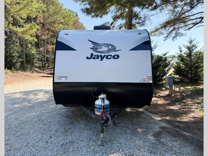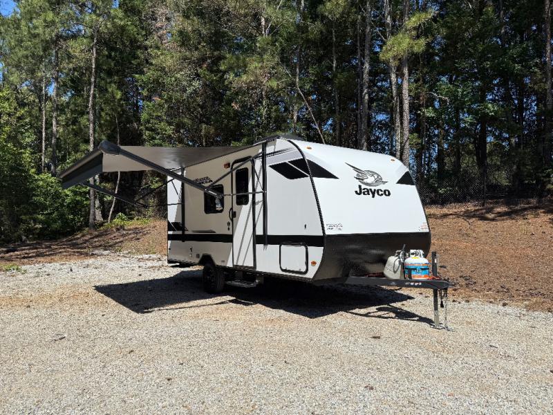 The Jay Feather Air SL travel trailer by Jayco is affordable, convenient, and lightweight for an easier tow! A Magnum Truss roof system and fully integrated A-frame provide a strong foundation to the trailer, plus there are galvanized-steel, impact resistant wheel wells for added protection. Some of the exterior conveniences you'll find include a front tongue jack and stabilizer jacks, roof mount solar prep, an exterior porch light, and G20 dark tinted privacy windows. Head inside to enjoy solid hardwood cabinet doors, residential-style kitchen countertops, a marine-grade toilet with foot flush, and vinyl flooring throughout that will be easy to keep clean. This super lite travel trailer is the perfect choice for rookie RVers and seasoned campers alike!