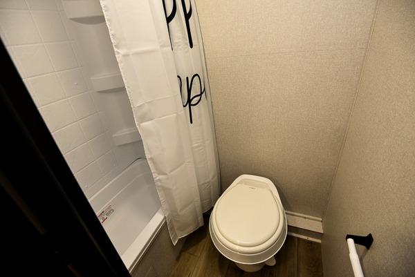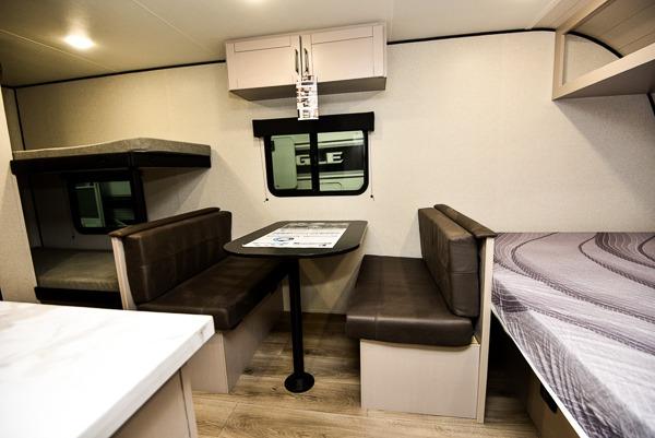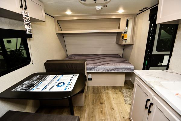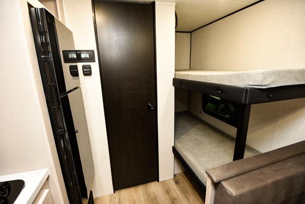 This compact travel trailer has everything you need for convenient camping trips! Once you arrive at the park, you can unload the exterior storage and put out the 10' power awning. The two burner cooktop and microwave oven will let you make lunch for your crew, and there is a 5 cu. ft. 12V refrigerator to keep your cold items fresh. A booth dinette will provide dining space when you don't want to eat outdoors, and this can convert to sleeping space for one guest or two little ones. You'll appreciate the private bath with a toilet and 36" tub/shower to freshen up in each day, and the bunk beds in the back provide compact sleeping space for more campers. The front queen bed will be reserved just for you, and there is a nightstand, wardrobe, and overhead cabinet here to keep your things tidy!