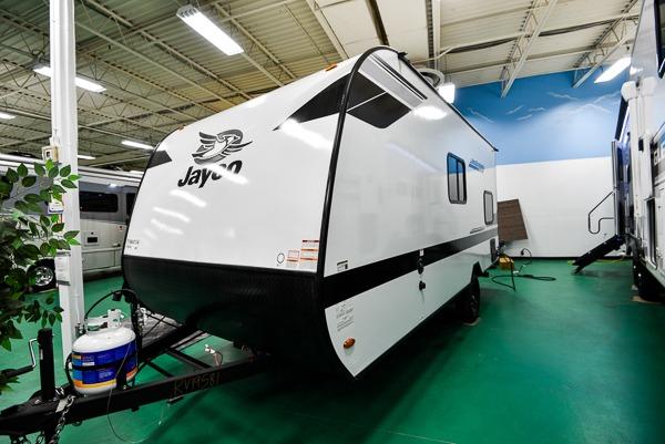 The Jay Feather Air SL travel trailer by Jayco is affordable, convenient, and lightweight for an easier tow! A Magnum Truss roof system and fully integrated A-frame provide a strong foundation to the trailer, plus there are galvanized-steel, impact resistant wheel wells for added protection. Some of the exterior conveniences you'll find include a front tongue jack and stabilizer jacks, roof mount solar prep, an exterior porch light, and G20 dark tinted privacy windows. Head inside to enjoy solid hardwood cabinet doors, residential-style kitchen countertops, a marine-grade toilet with foot flush, and vinyl flooring throughout that will be easy to keep clean. This super lite travel trailer is the perfect choice for rookie RVers and seasoned campers alike!