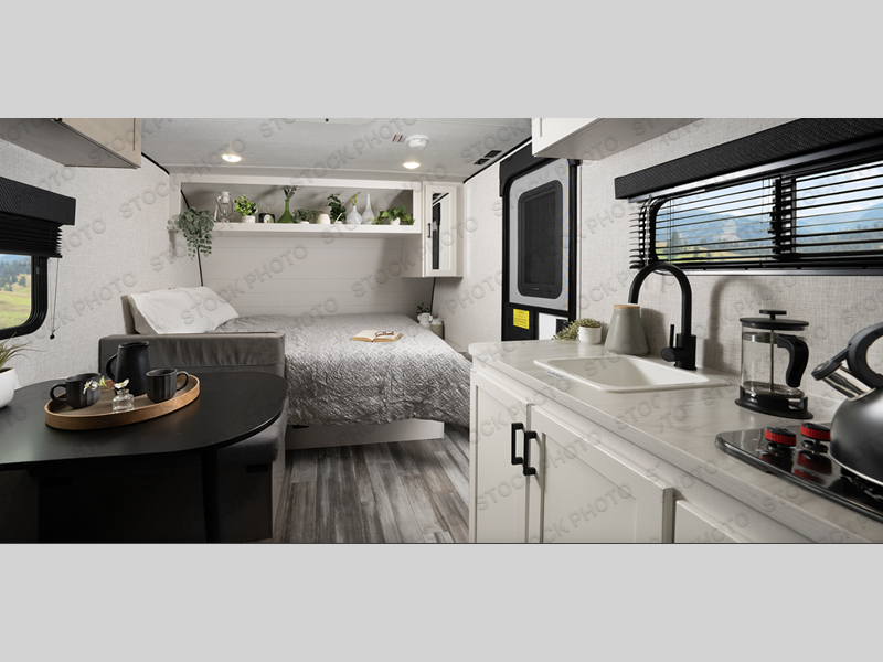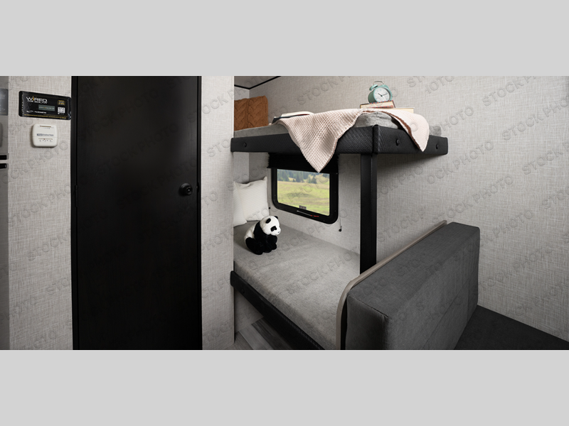 This compact travel trailer has everything you need for convenient camping trips! Once you arrive at the park, you can unload the exterior storage and put out the 10' power awning. The two burner cooktop and microwave oven will let you make lunch for your crew, and there is a 5 cu. ft. 12V refrigerator to keep your cold items fresh. A booth dinette will provide dining space when you don't want to eat outdoors, and this can convert to sleeping space for one guest or two little ones. You'll appreciate the private bath with a toilet and 36" tub/shower to freshen up in each day, and the bunk beds in the back provide compact sleeping space for more campers. The front queen bed will be reserved just for you, and there is a nightstand, wardrobe, and overhead cabinet here to keep your things tidy!