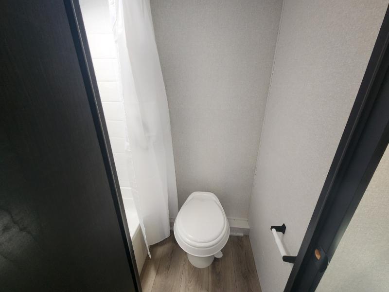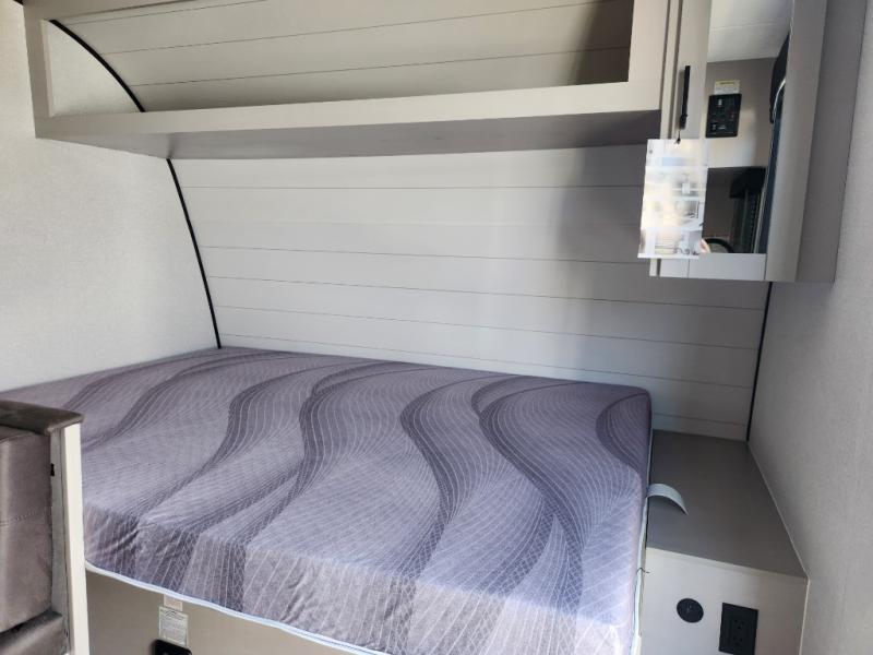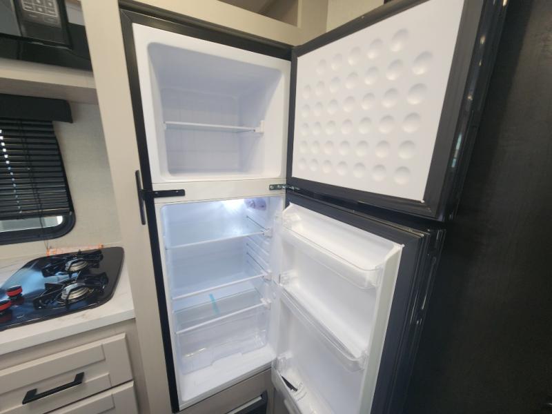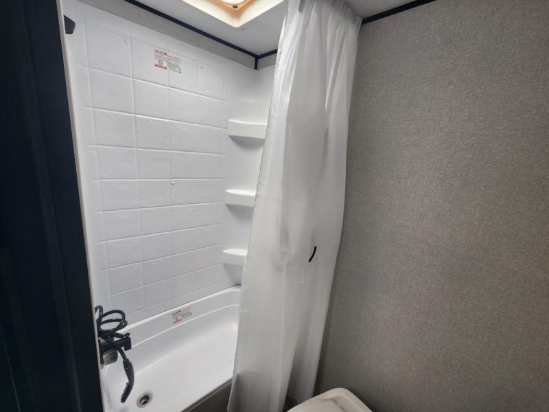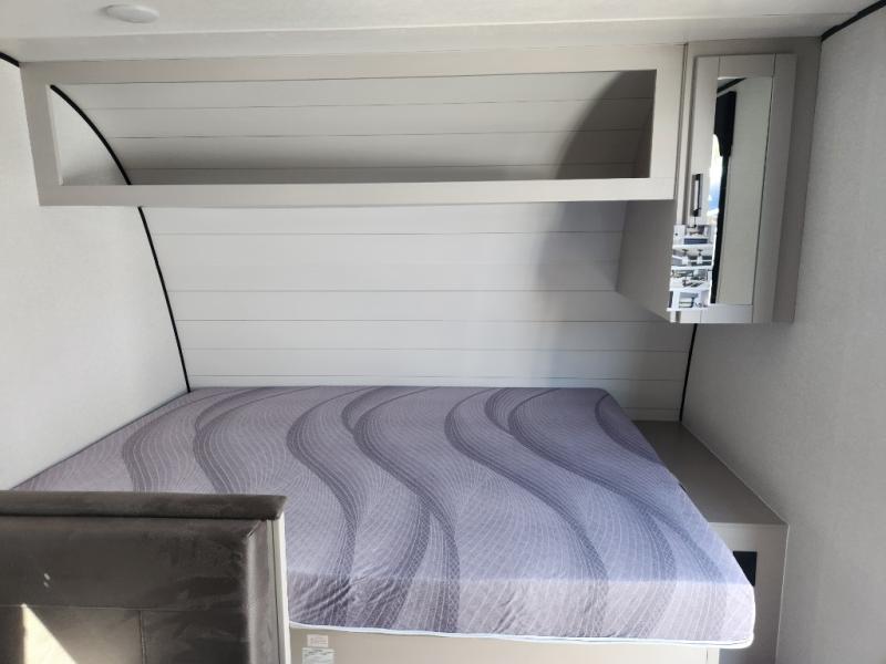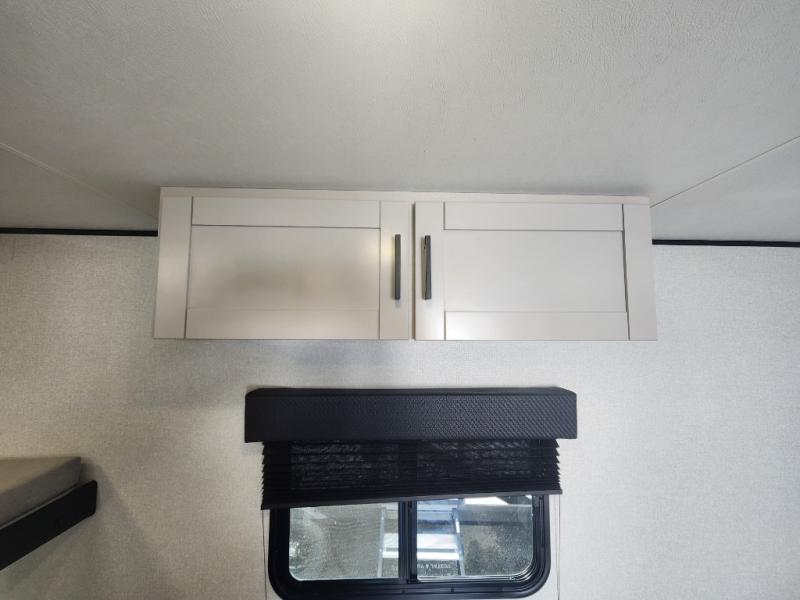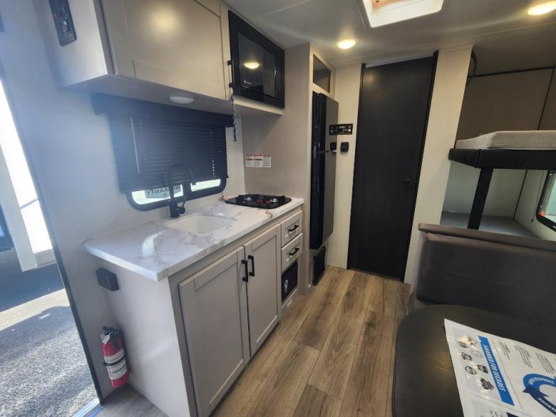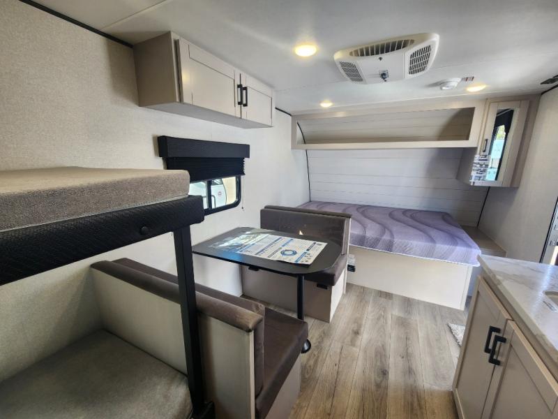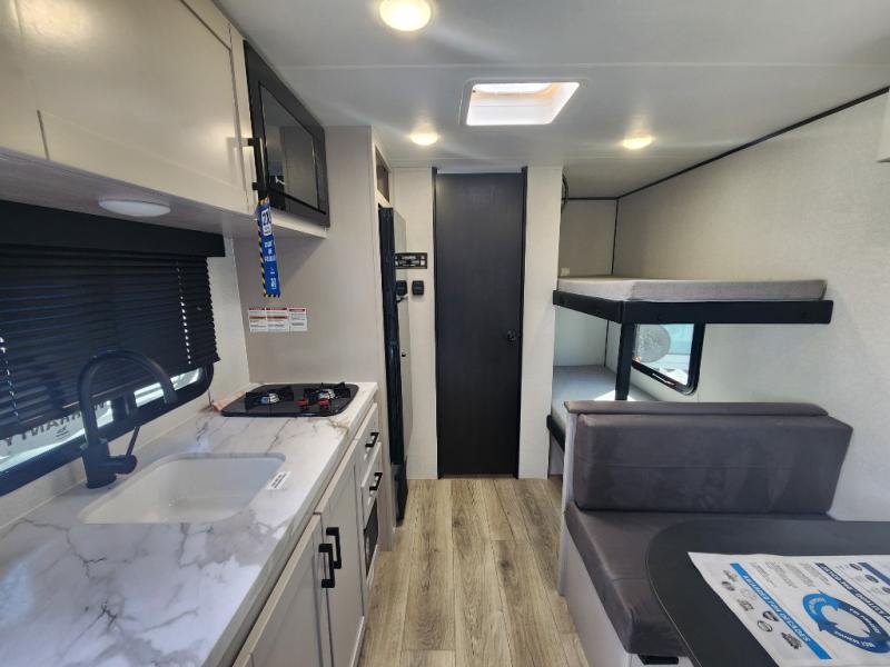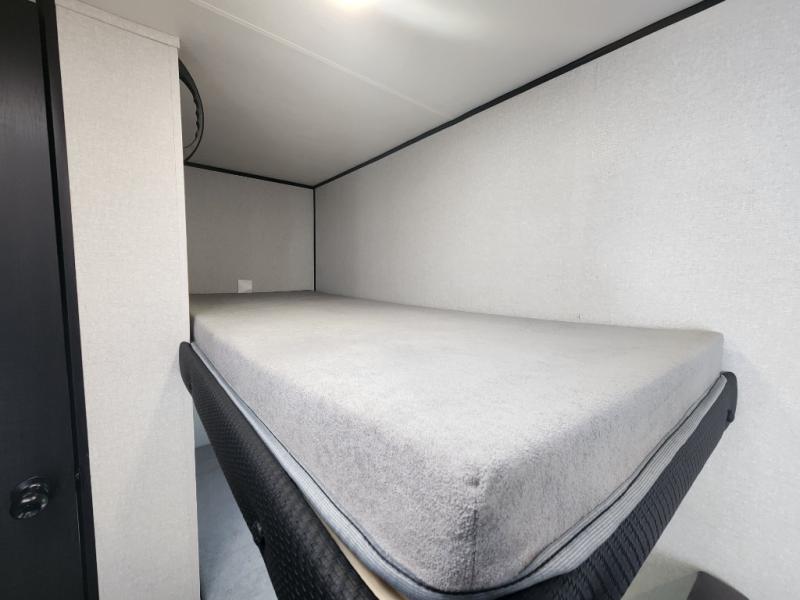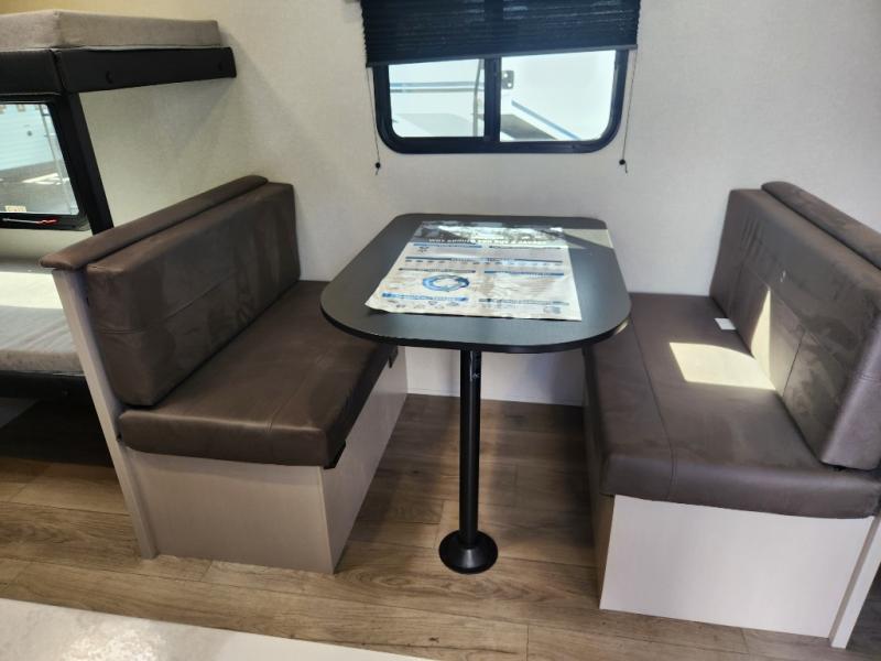 This compact travel trailer has everything you need for convenient camping trips! Once you arrive at the park, you can unload the exterior storage and put out the 10' power awning. The two burner cooktop and microwave oven will let you make lunch for your crew, and there is a 5 cu. ft. 12V refrigerator to keep your cold items fresh. A booth dinette will provide dining space when you don't want to eat outdoors, and this can convert to sleeping space for one guest or two little ones. You'll appreciate the private bath with a toilet and 36" tub/shower to freshen up in each day, and the bunk beds in the back provide compact sleeping space for more campers. The front queen bed will be reserved just for you, and there is a nightstand, wardrobe, and overhead cabinet here to keep your things tidy!