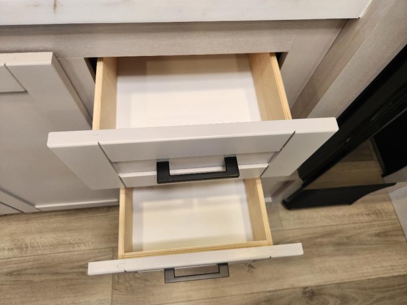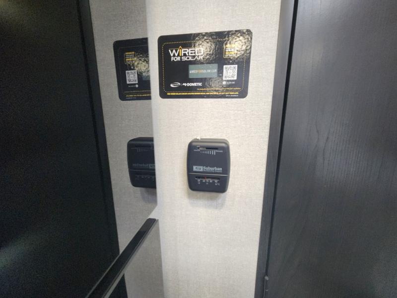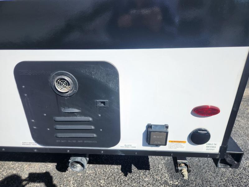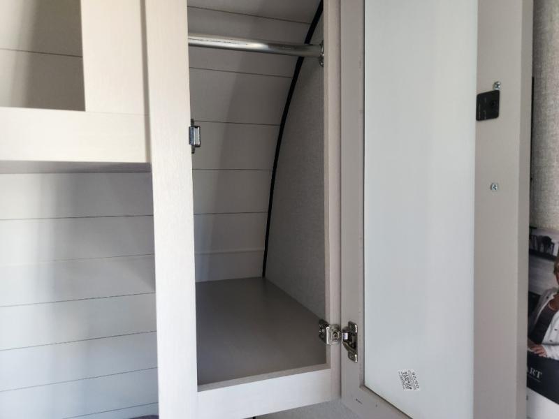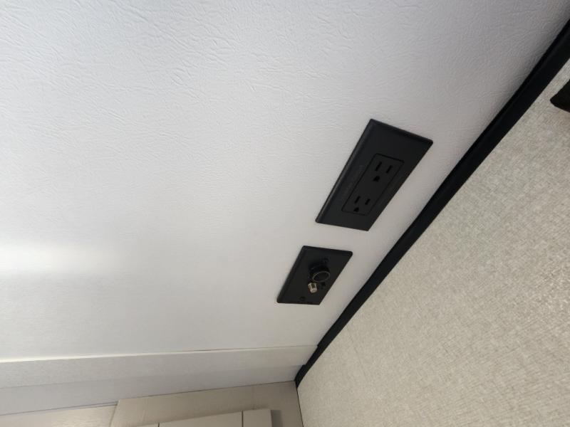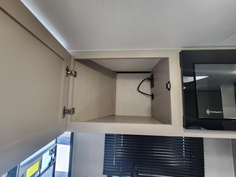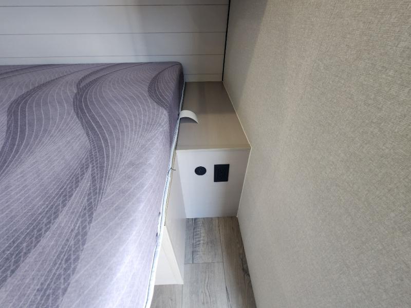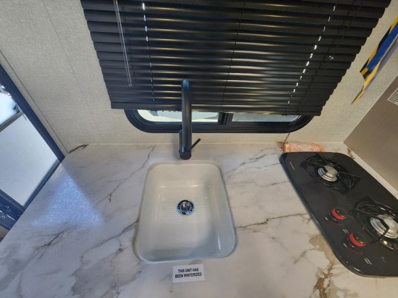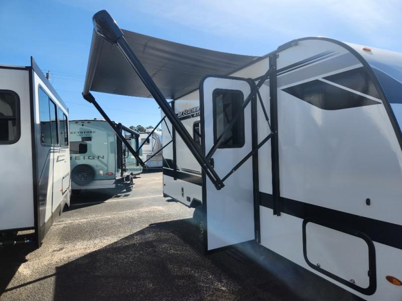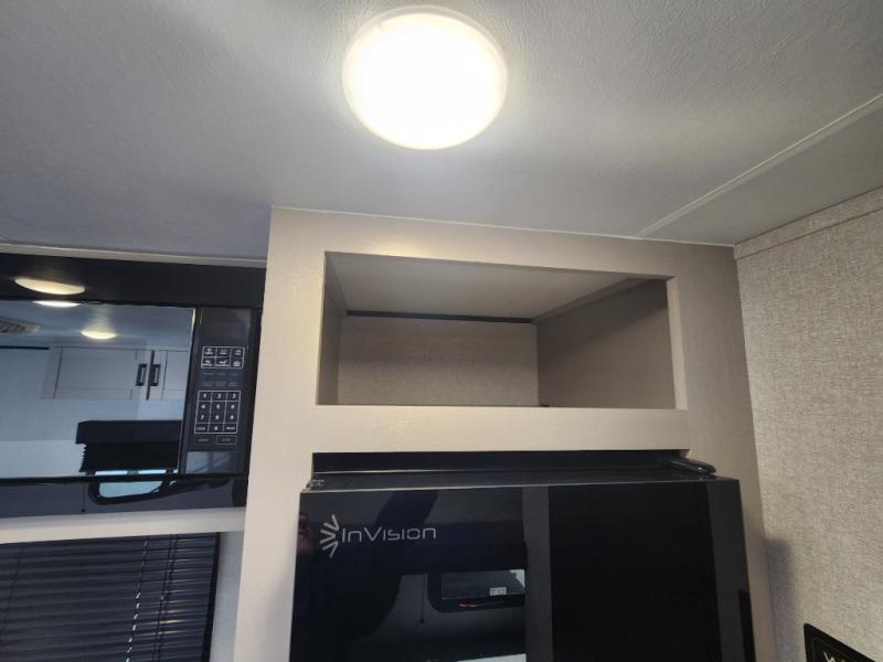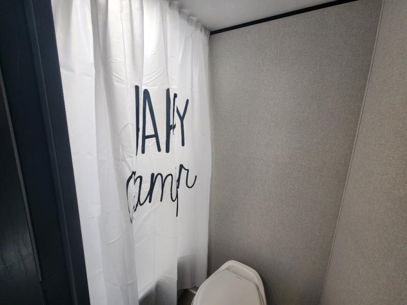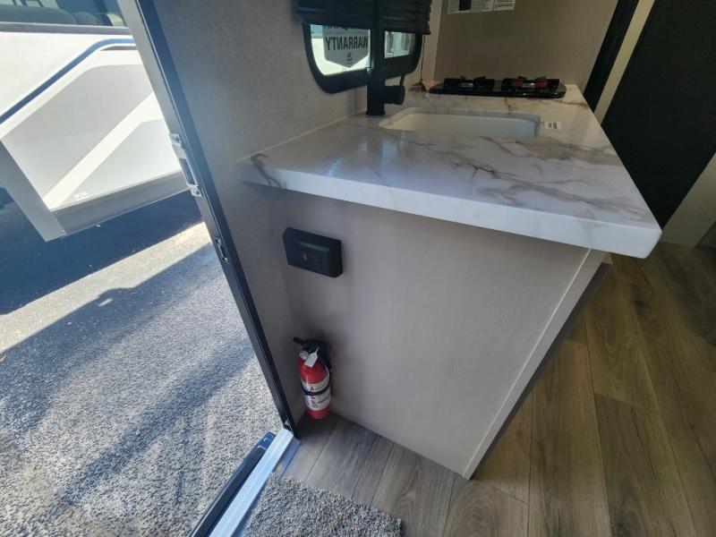 This compact travel trailer has everything you need for convenient camping trips! Once you arrive at the park, you can unload the exterior storage and put out the 10' power awning. The two burner cooktop and microwave oven will let you make lunch for your crew, and there is a 5 cu. ft. 12V refrigerator to keep your cold items fresh. A booth dinette will provide dining space when you don't want to eat outdoors, and this can convert to sleeping space for one guest or two little ones. You'll appreciate the private bath with a toilet and 36" tub/shower to freshen up in each day, and the bunk beds in the back provide compact sleeping space for more campers. The front queen bed will be reserved just for you, and there is a nightstand, wardrobe, and overhead cabinet here to keep your things tidy!