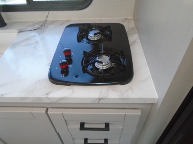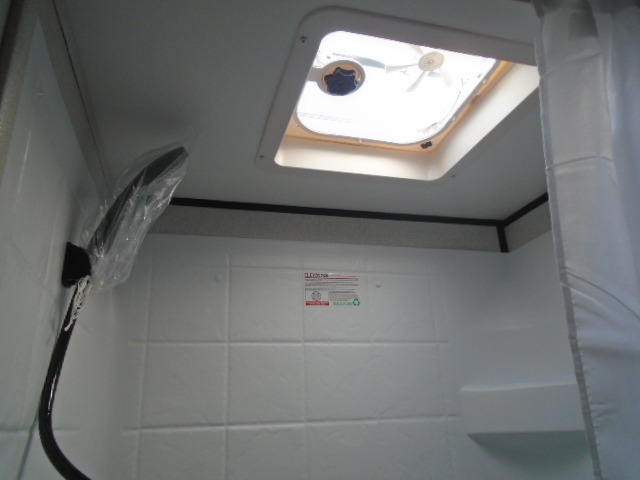 This compact travel trailer has everything you need for convenient camping trips! Once you arrive at the park, you can unload the exterior storage and put out the 10' power awning. The two burner cooktop and microwave oven will let you make lunch for your crew, and there is a 5 cu. ft. 12V refrigerator to keep your cold items fresh. A booth dinette will provide dining space when you don't want to eat outdoors, and this can convert to sleeping space for one guest or two little ones. You'll appreciate the private bath with a toilet and 36" tub/shower to freshen up in each day, and the bunk beds in the back provide compact sleeping space for more campers. The front queen bed will be reserved just for you, and there is a nightstand, wardrobe, and overhead cabinet here to keep your things tidy!