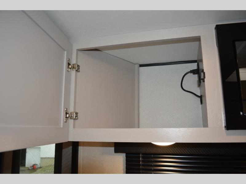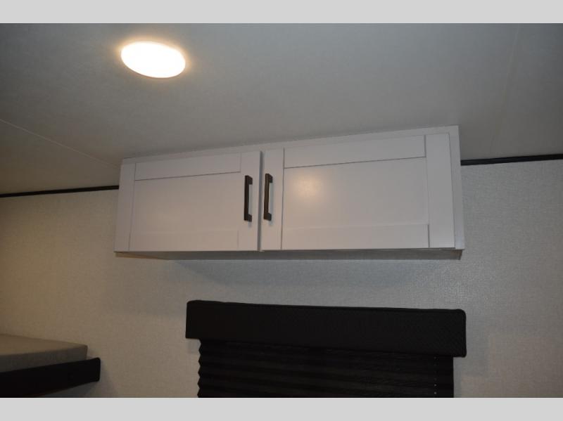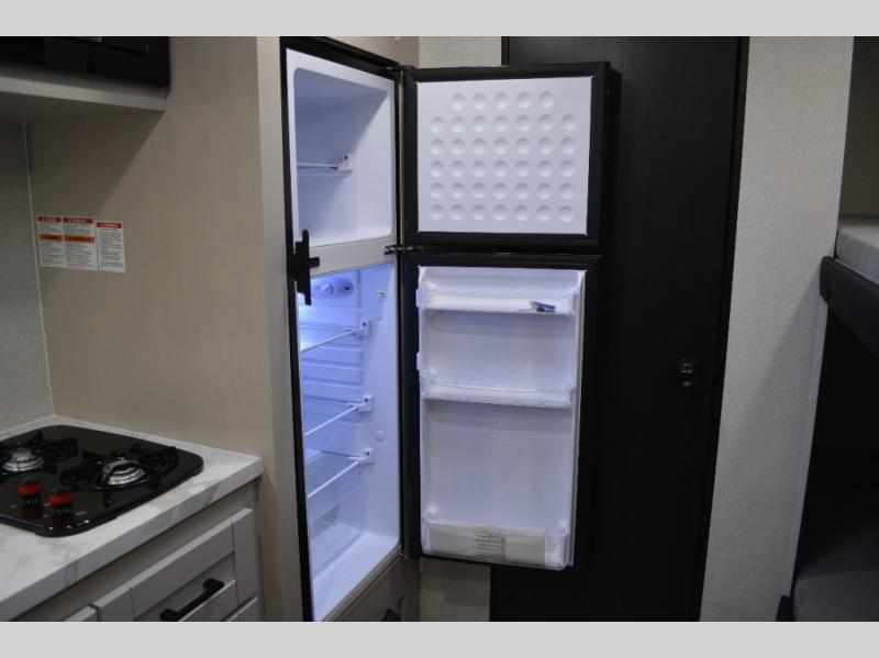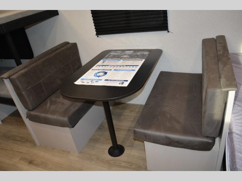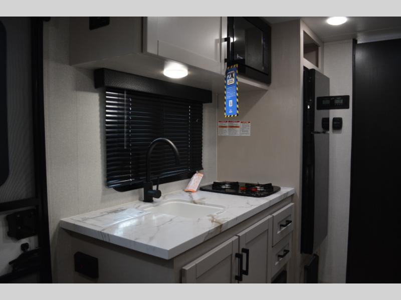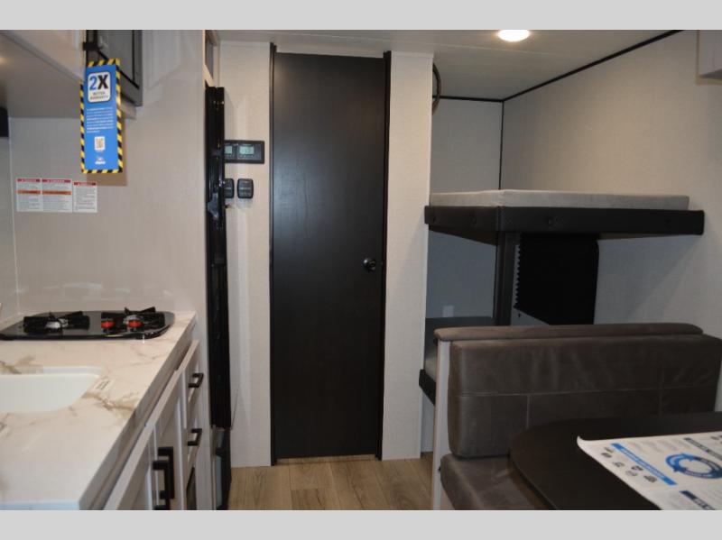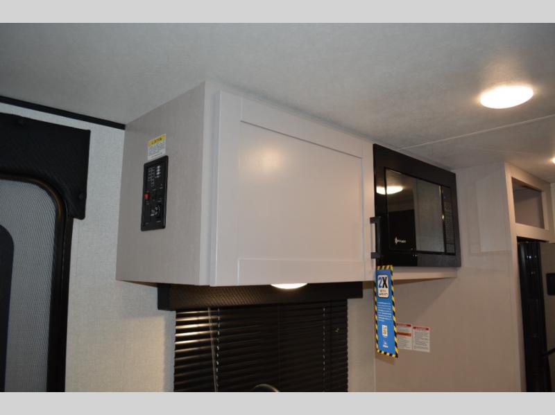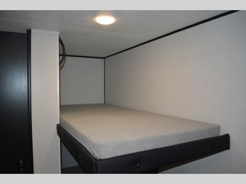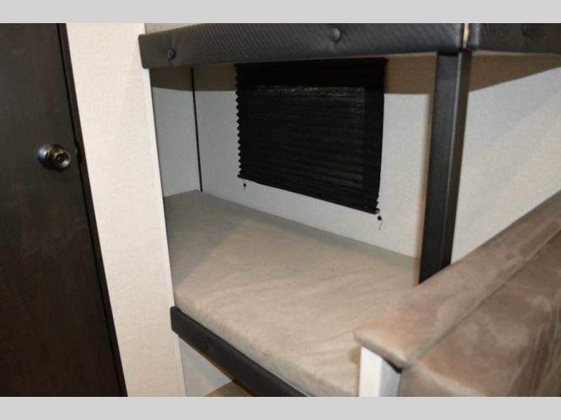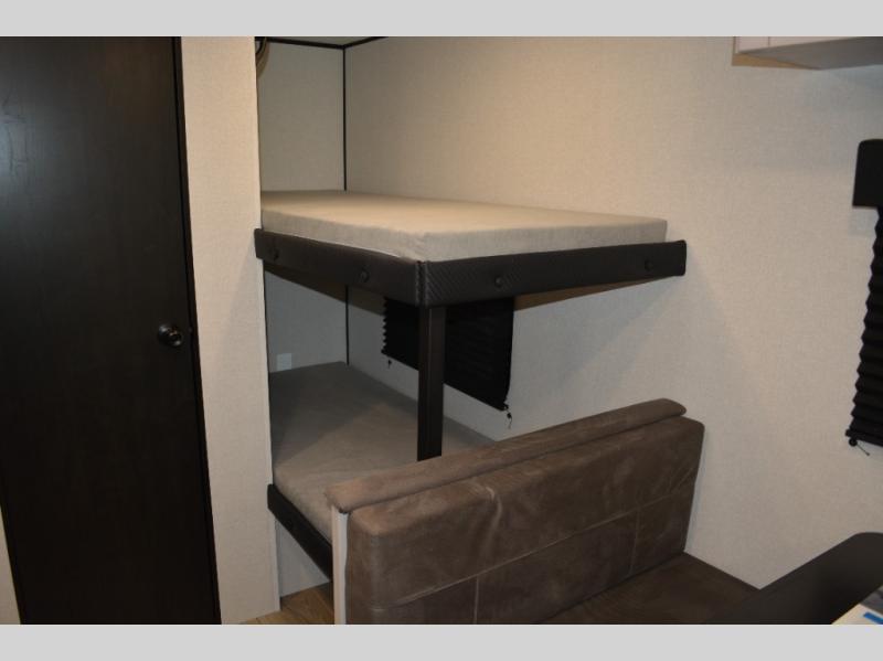 This compact travel trailer has everything you need for convenient camping trips! Once you arrive at the park, you can unload the exterior storage and put out the 10' power awning. The two burner cooktop and microwave oven will let you make lunch for your crew, and there is a 5 cu. ft. 12V refrigerator to keep your cold items fresh. A booth dinette will provide dining space when you don't want to eat outdoors, and this can convert to sleeping space for one guest or two little ones. You'll appreciate the private bath with a toilet and 36" tub/shower to freshen up in each day, and the bunk beds in the back provide compact sleeping space for more campers. The front queen bed will be reserved just for you, and there is a nightstand, wardrobe, and overhead cabinet here to keep your things tidy!