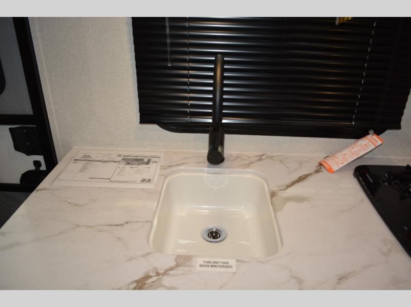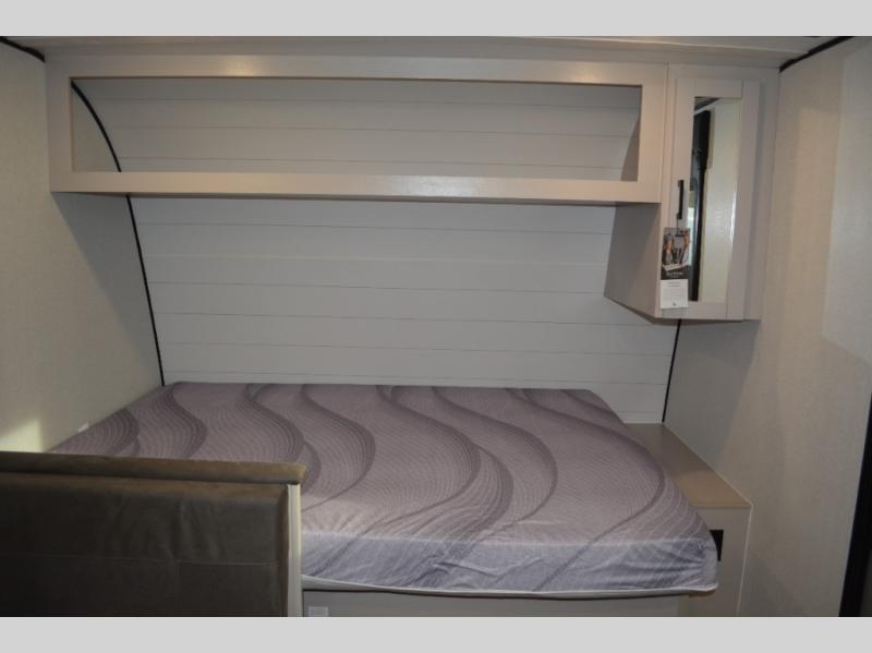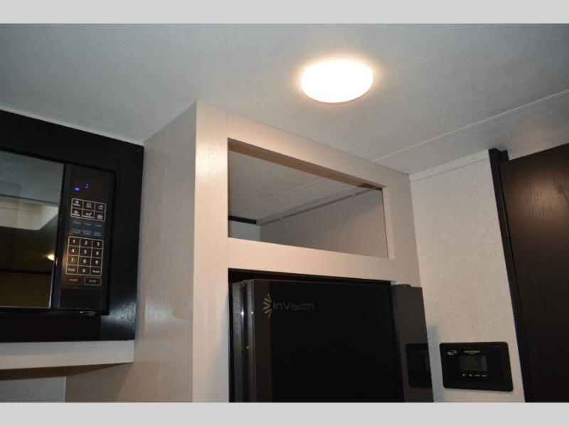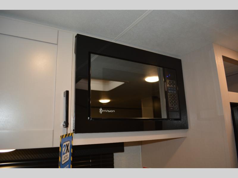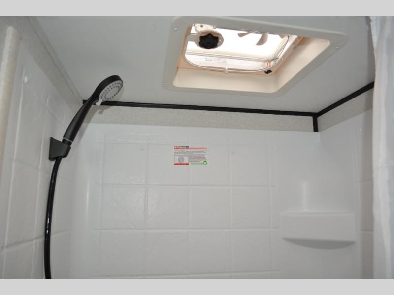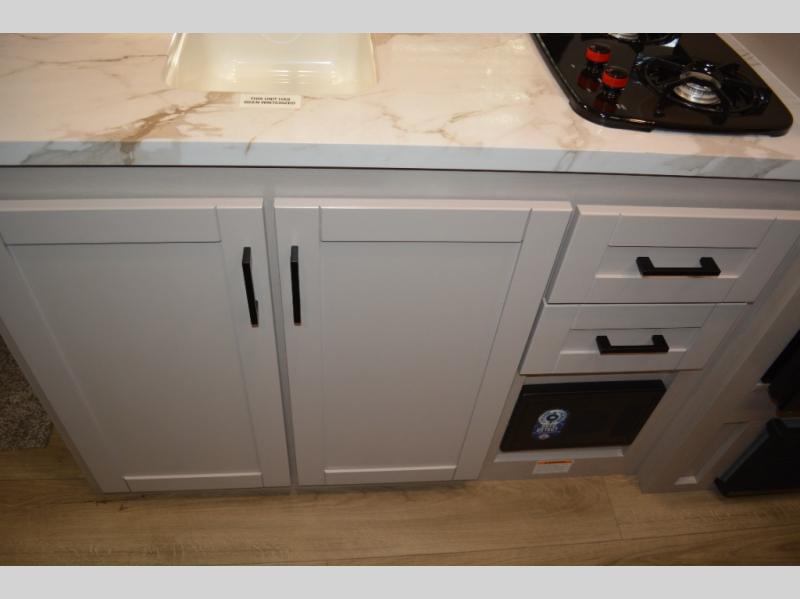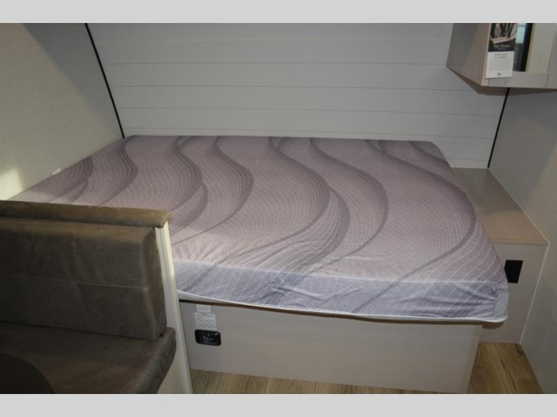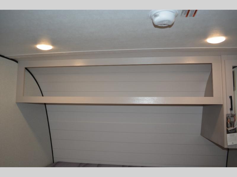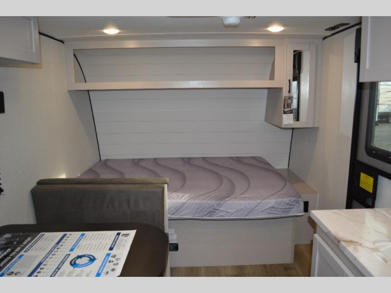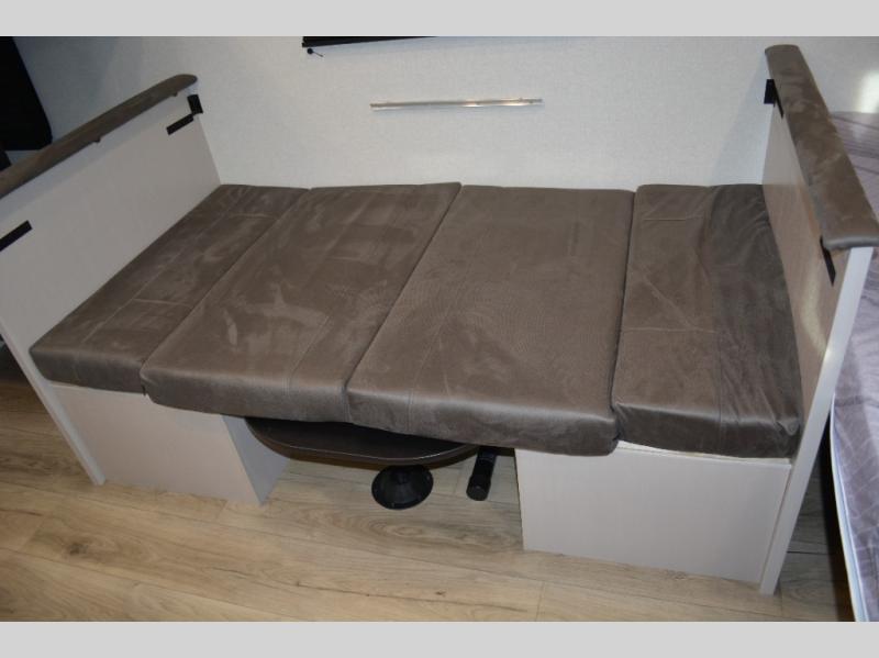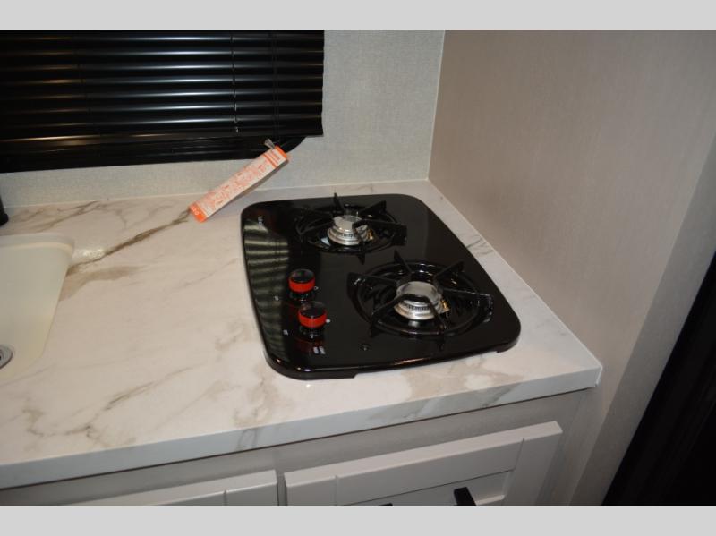 This compact travel trailer has everything you need for convenient camping trips! Once you arrive at the park, you can unload the exterior storage and put out the 10' power awning. The two burner cooktop and microwave oven will let you make lunch for your crew, and there is a 5 cu. ft. 12V refrigerator to keep your cold items fresh. A booth dinette will provide dining space when you don't want to eat outdoors, and this can convert to sleeping space for one guest or two little ones. You'll appreciate the private bath with a toilet and 36" tub/shower to freshen up in each day, and the bunk beds in the back provide compact sleeping space for more campers. The front queen bed will be reserved just for you, and there is a nightstand, wardrobe, and overhead cabinet here to keep your things tidy!