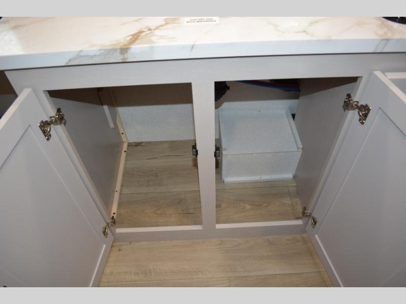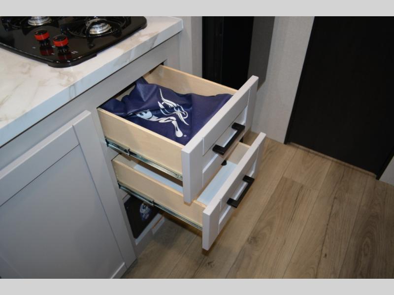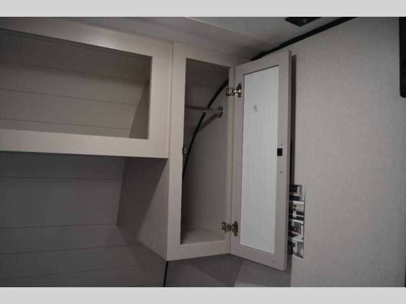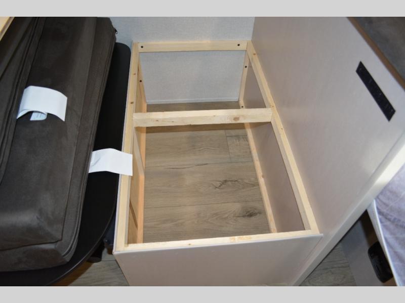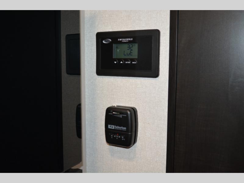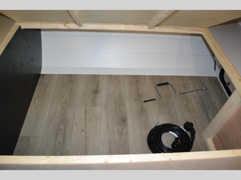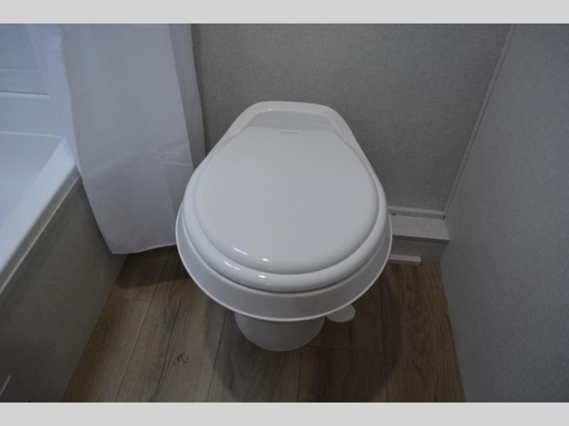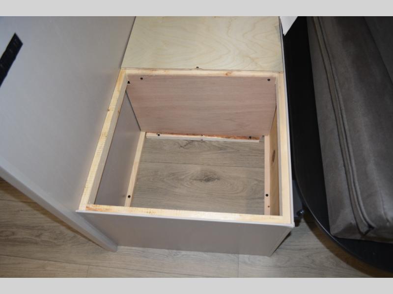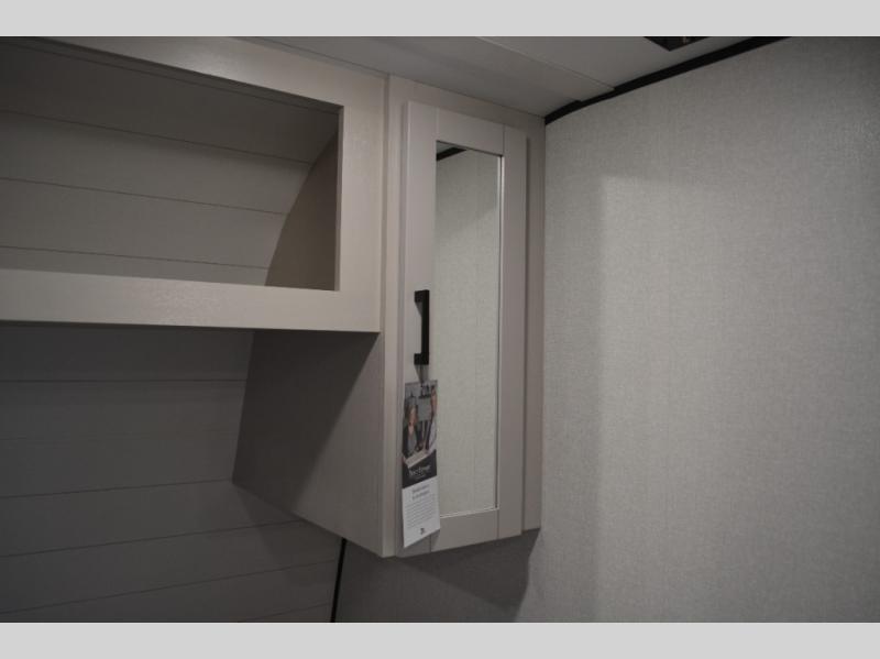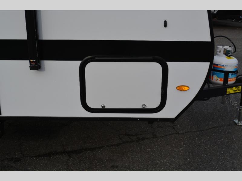 This compact travel trailer has everything you need for convenient camping trips! Once you arrive at the park, you can unload the exterior storage and put out the 10' power awning. The two burner cooktop and microwave oven will let you make lunch for your crew, and there is a 5 cu. ft. 12V refrigerator to keep your cold items fresh. A booth dinette will provide dining space when you don't want to eat outdoors, and this can convert to sleeping space for one guest or two little ones. You'll appreciate the private bath with a toilet and 36" tub/shower to freshen up in each day, and the bunk beds in the back provide compact sleeping space for more campers. The front queen bed will be reserved just for you, and there is a nightstand, wardrobe, and overhead cabinet here to keep your things tidy!