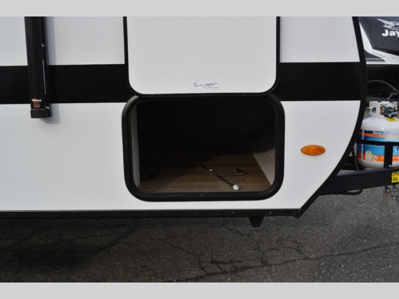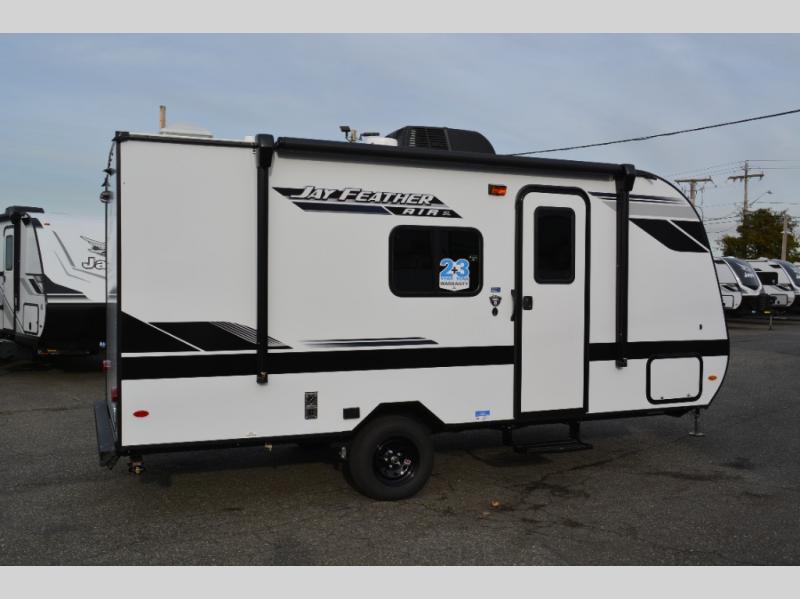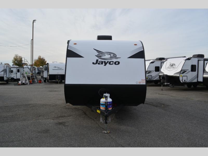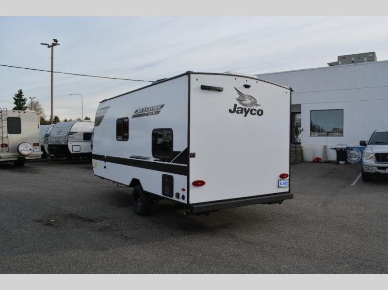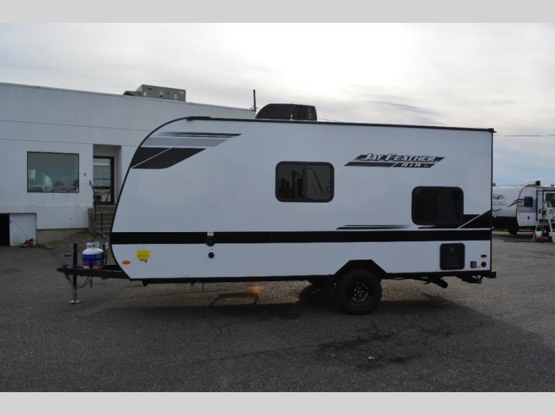 The Jay Feather Air SL travel trailer by Jayco is affordable, convenient, and lightweight for an easier tow! A Magnum Truss roof system and fully integrated A-frame provide a strong foundation to the trailer, plus there are galvanized-steel, impact resistant wheel wells for added protection. Some of the exterior conveniences you'll find include a front tongue jack and stabilizer jacks, roof mount solar prep, an exterior porch light, and G20 dark tinted privacy windows. Head inside to enjoy solid hardwood cabinet doors, residential-style kitchen countertops, a marine-grade toilet with foot flush, and vinyl flooring throughout that will be easy to keep clean. This super lite travel trailer is the perfect choice for rookie RVers and seasoned campers alike!