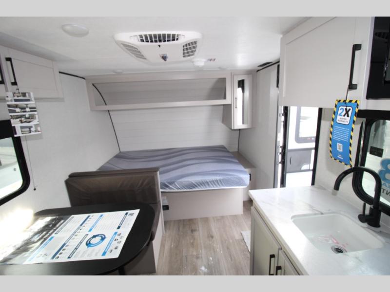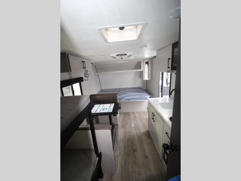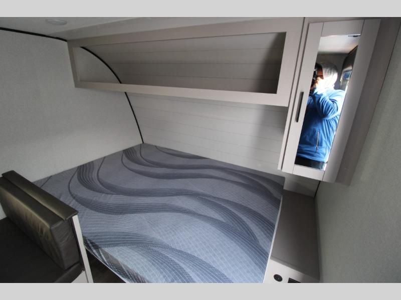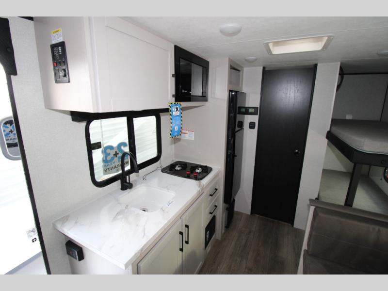 This compact travel trailer has everything you need for convenient camping trips! Once you arrive at the park, you can unload the exterior storage and put out the 10' power awning. The two burner cooktop and microwave oven will let you make lunch for your crew, and there is a 5 cu. ft. 12V refrigerator to keep your cold items fresh. A booth dinette will provide dining space when you don't want to eat outdoors, and this can convert to sleeping space for one guest or two little ones. You'll appreciate the private bath with a toilet and 36" tub/shower to freshen up in each day, and the bunk beds in the back provide compact sleeping space for more campers. The front queen bed will be reserved just for you, and there is a nightstand, wardrobe, and overhead cabinet here to keep your things tidy!
