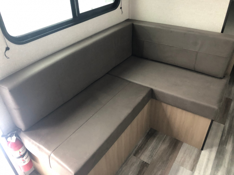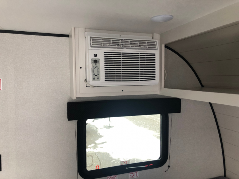 This compact travel trailer has everything you need for convenient camping trips! Once you arrive at the park, you can unload the exterior storage and put out the 10' power awning. The two burner cooktop and microwave oven will let you make lunch for your crew, and there is a 5 cu. ft. 12V refrigerator to keep your cold items fresh. A booth dinette will provide dining space when you don't want to eat outdoors, and this can convert to sleeping space for one guest or two little ones. You'll appreciate the private bath with a toilet and 36" tub/shower to freshen up in each day, and the bunk beds in the back provide compact sleeping space for more campers. The front queen bed will be reserved just for you, and there is a nightstand, wardrobe, and overhead cabinet here to keep your things tidy!