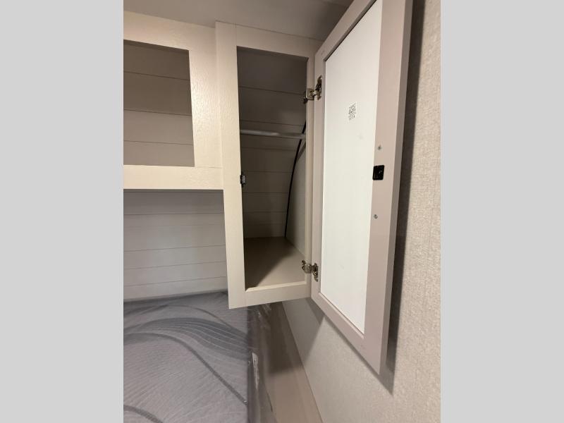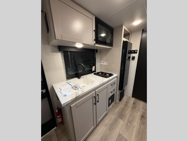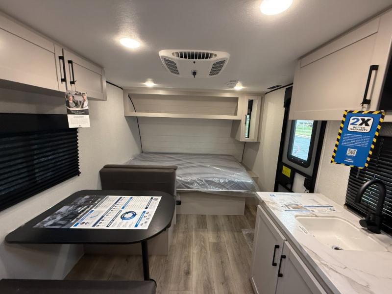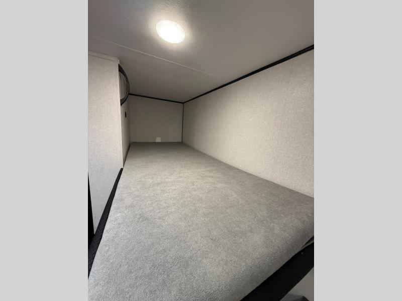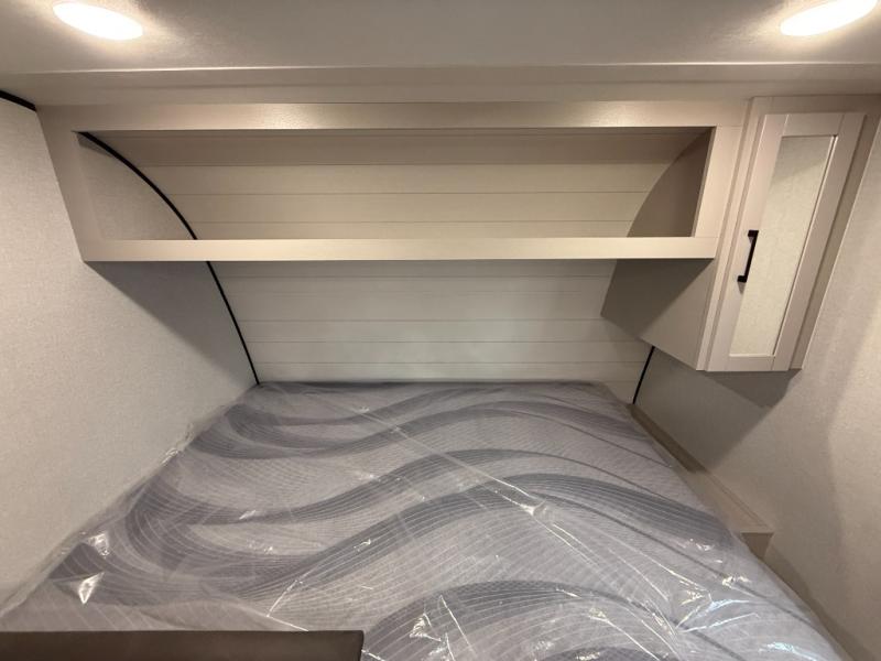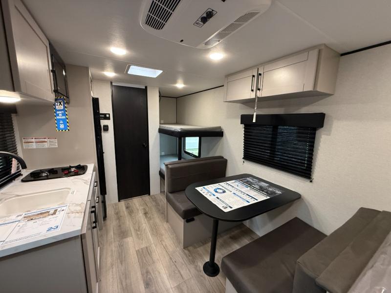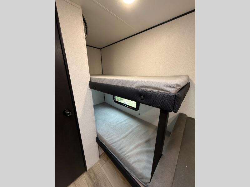 This compact travel trailer has everything you need for convenient camping trips! Once you arrive at the park, you can unload the exterior storage and put out the 10' power awning. The two burner cooktop and microwave oven will let you make lunch for your crew, and there is a 5 cu. ft. 12V refrigerator to keep your cold items fresh. A booth dinette will provide dining space when you don't want to eat outdoors, and this can convert to sleeping space for one guest or two little ones. You'll appreciate the private bath with a toilet and 36" tub/shower to freshen up in each day, and the bunk beds in the back provide compact sleeping space for more campers. The front queen bed will be reserved just for you, and there is a nightstand, wardrobe, and overhead cabinet here to keep your things tidy!