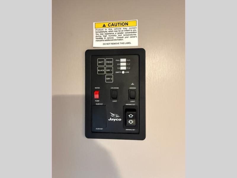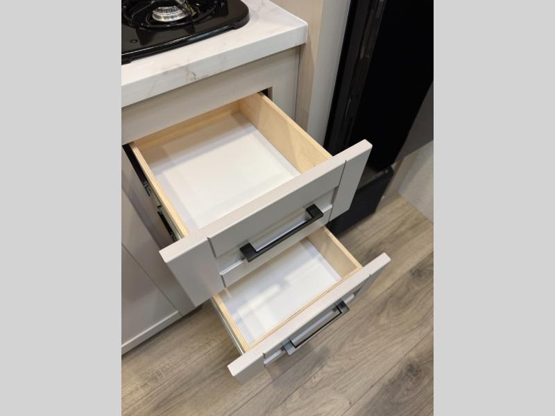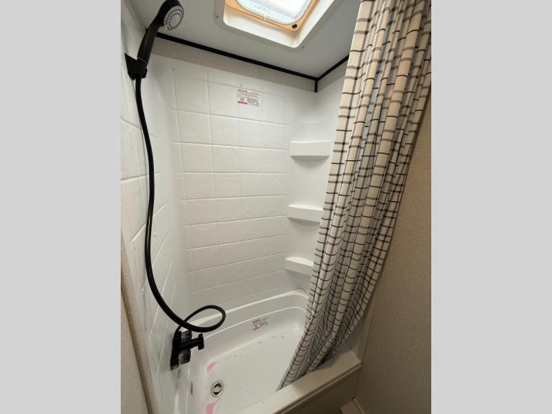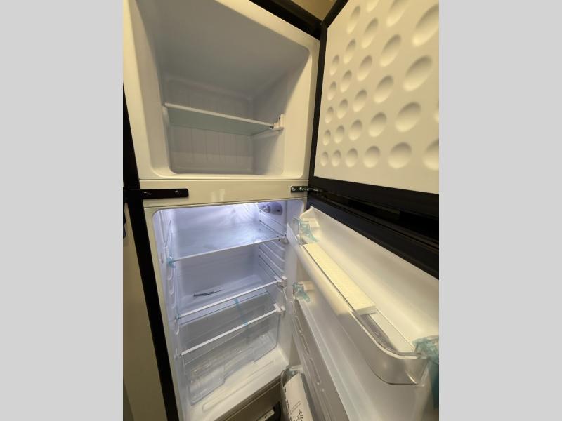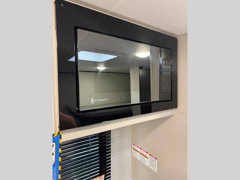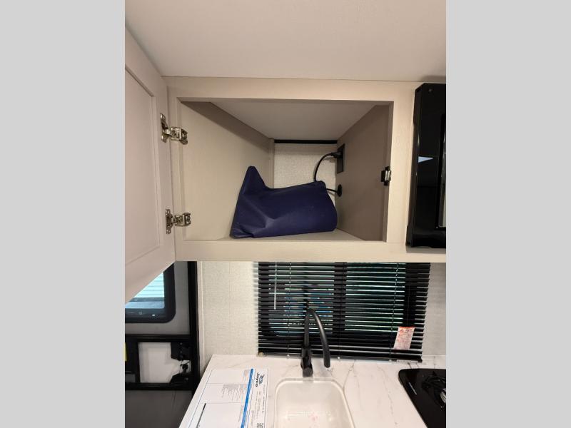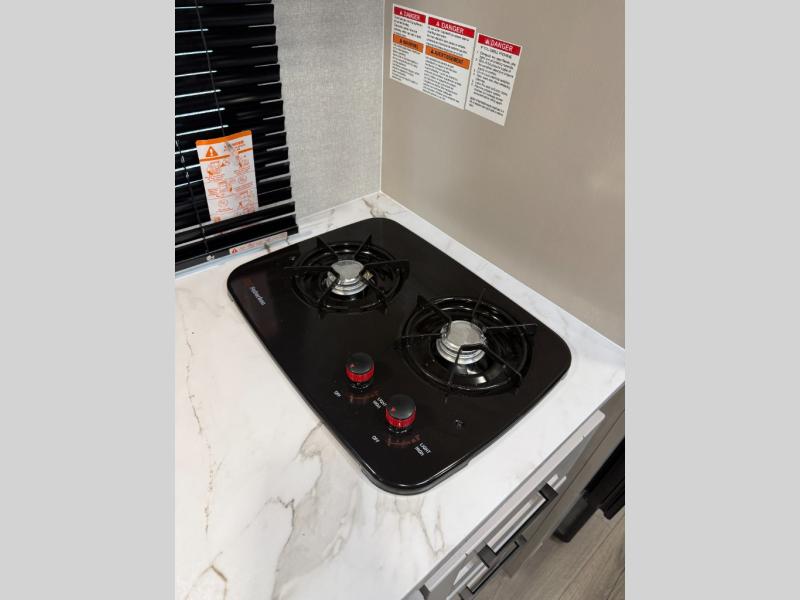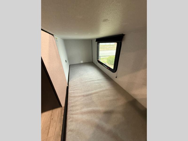 This compact travel trailer has everything you need for convenient camping trips! Once you arrive at the park, you can unload the exterior storage and put out the 10' power awning. The two burner cooktop and microwave oven will let you make lunch for your crew, and there is a 5 cu. ft. 12V refrigerator to keep your cold items fresh. A booth dinette will provide dining space when you don't want to eat outdoors, and this can convert to sleeping space for one guest or two little ones. You'll appreciate the private bath with a toilet and 36" tub/shower to freshen up in each day, and the bunk beds in the back provide compact sleeping space for more campers. The front queen bed will be reserved just for you, and there is a nightstand, wardrobe, and overhead cabinet here to keep your things tidy!