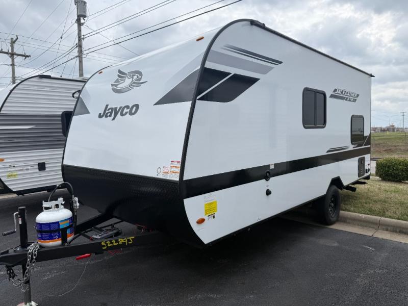The Jay Feather Air SL travel trailer by Jayco is affordable, convenient, and lightweight for an easier tow! A Magnum Truss roof system and fully integrated A-frame provide a strong foundation to the trailer, plus there are galvanized-steel, impact resistant wheel wells for added protection. Some of the exterior conveniences you'll find include a front tongue jack and stabilizer jacks, roof mount solar prep, an exterior porch light, and G20 dark tinted privacy windows. Head inside to enjoy solid hardwood cabinet doors, residential-style kitchen countertops, a marine-grade toilet with foot flush, and vinyl flooring throughout that will be easy to keep clean. This super lite travel trailer is the perfect choice for rookie RVers and seasoned campers alike!