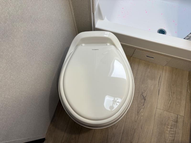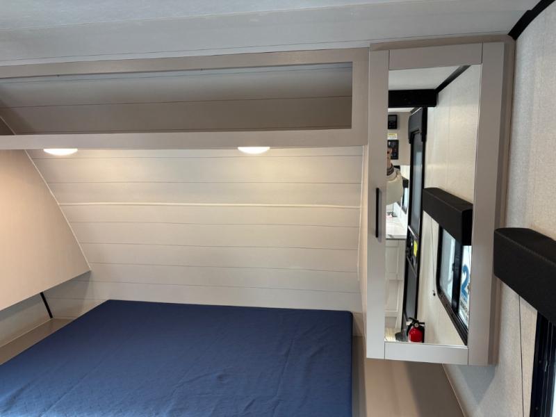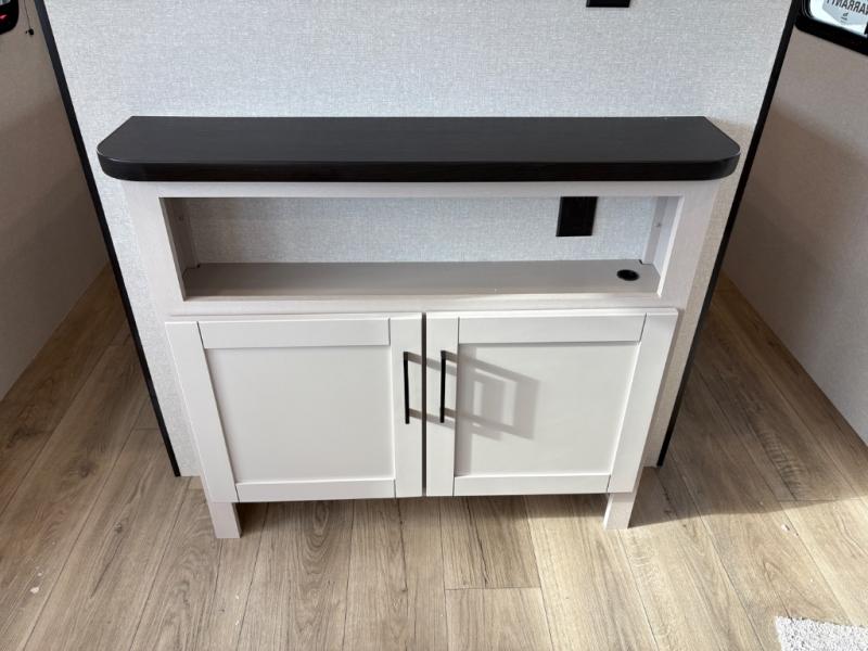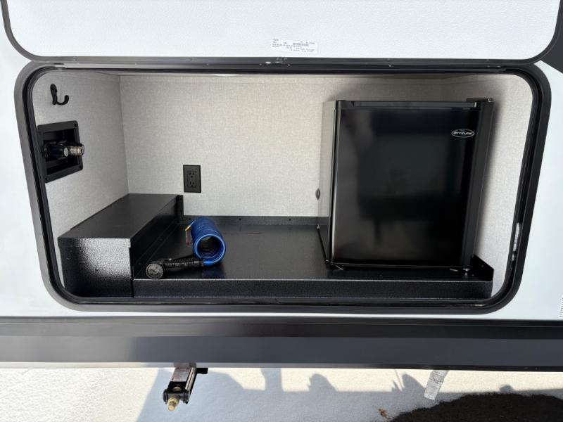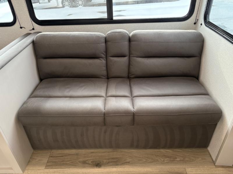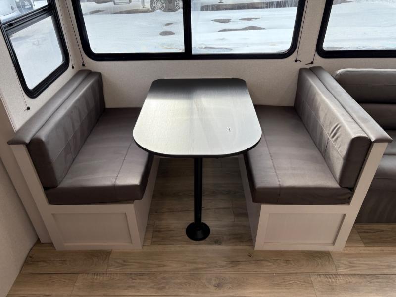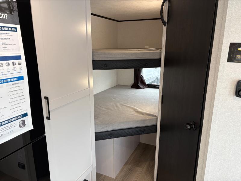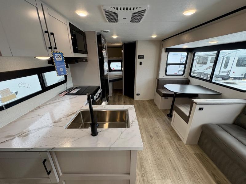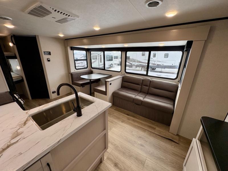 Camping with a larger group just got easier in this spacious travel trailer for eight! You'll have the front bedroom to yourselves which includes a walk-around queen bed with dual wardrobes and nightstands to keep your things tidy. The double-size bunks with storage below will be perfect for your guests or little ones, and the full bath adjacent to the bunks will let everyone freshen up each day. A booth dinette and jack-knife sofa within the large slide out provides a place to dine, play games, and convert to more sleeping space. And the chef of your group will find a full kitchen, complete with microwave oven, cooktop, pantry and 11 cu. ft. 12V refrigerator!
