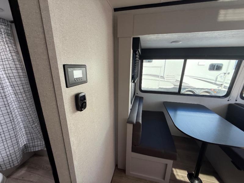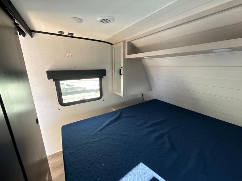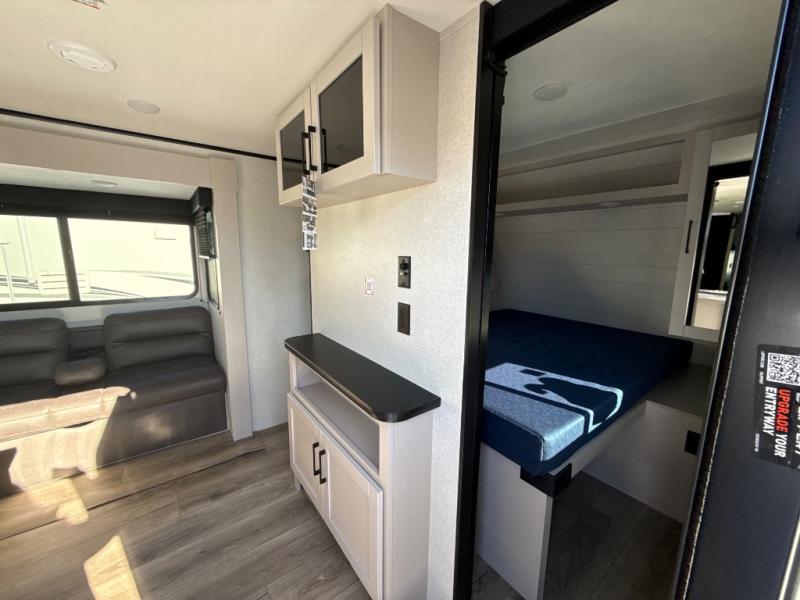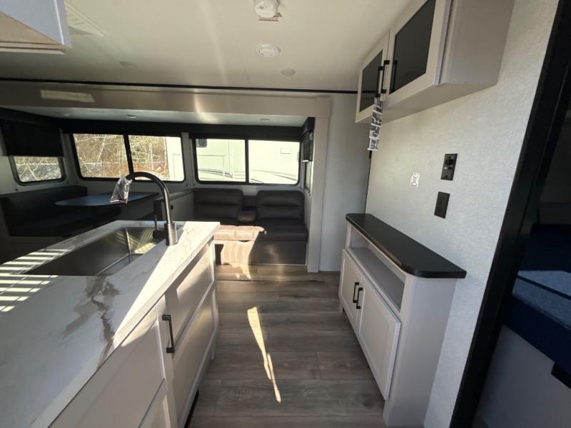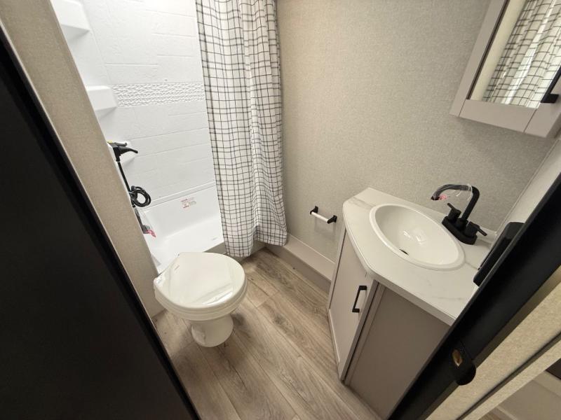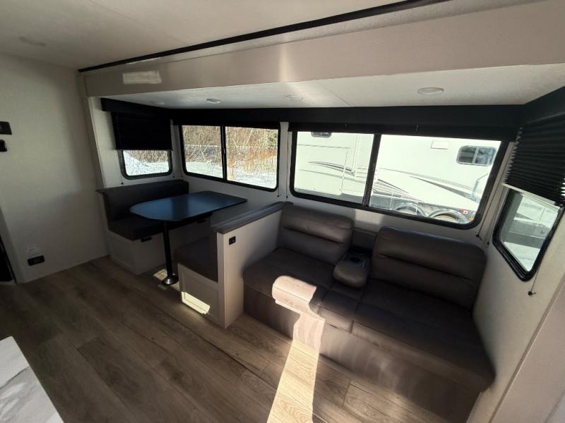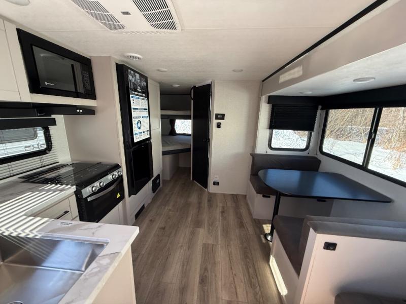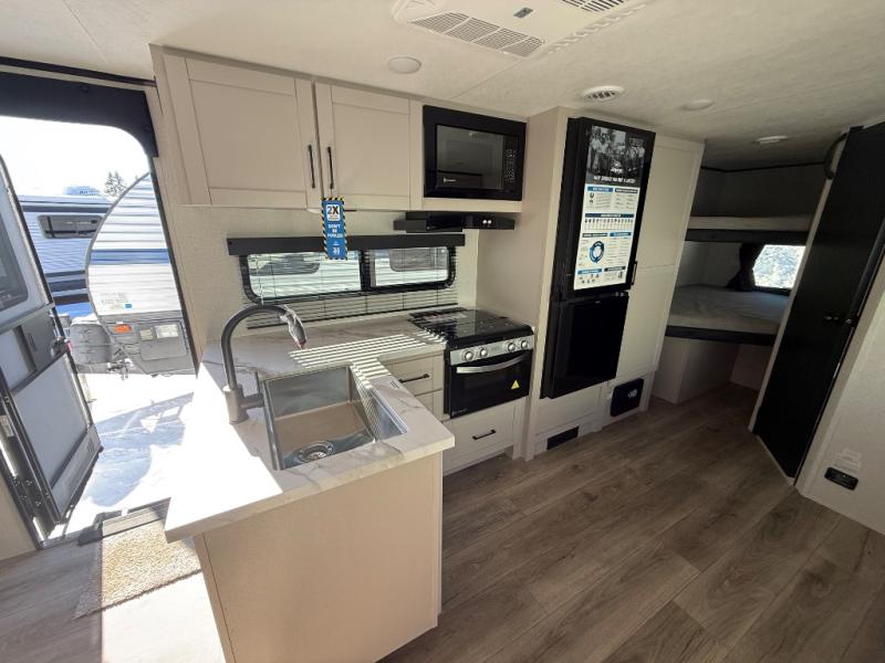 Camping with a larger group just got easier in this spacious travel trailer for eight! You'll have the front bedroom to yourselves which includes a walk-around queen bed with dual wardrobes and nightstands to keep your things tidy. The double-size bunks with storage below will be perfect for your guests or little ones, and the full bath adjacent to the bunks will let everyone freshen up each day. A booth dinette and jack-knife sofa within the large slide out provides a place to dine, play games, and convert to more sleeping space. And the chef of your group will find a full kitchen, complete with microwave oven, cooktop, pantry and 11 cu. ft. 12V refrigerator!