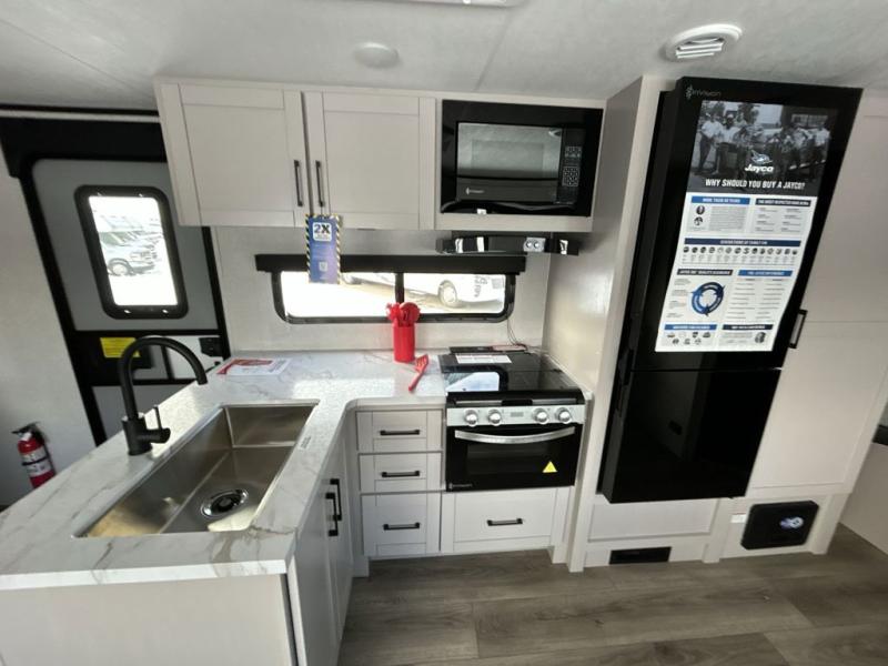 Camp light and camp convenient in a Jay Feather SL by Jayco! This lightweight travel trailer is constructed with a Magnum Truss roof system, a fully integrated A-frame, and exterior Azdel composite panels for added durability. There are also nitrogen-filled radial tires outside, along with large downspouts, MORryde Step Above entry steps, a power awning with LED lights, and a power tongue jack to name a few conveniences. Head inside to enjoy the vinyl flooring throughout, solid hardwood cabinet doors, a shower surround, and residential-style kitchen countertops to make your space feel a little more like home!