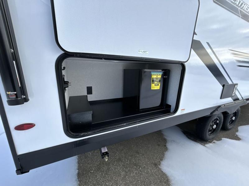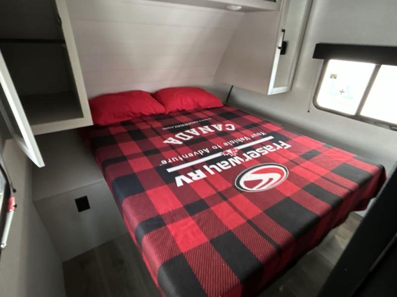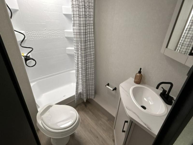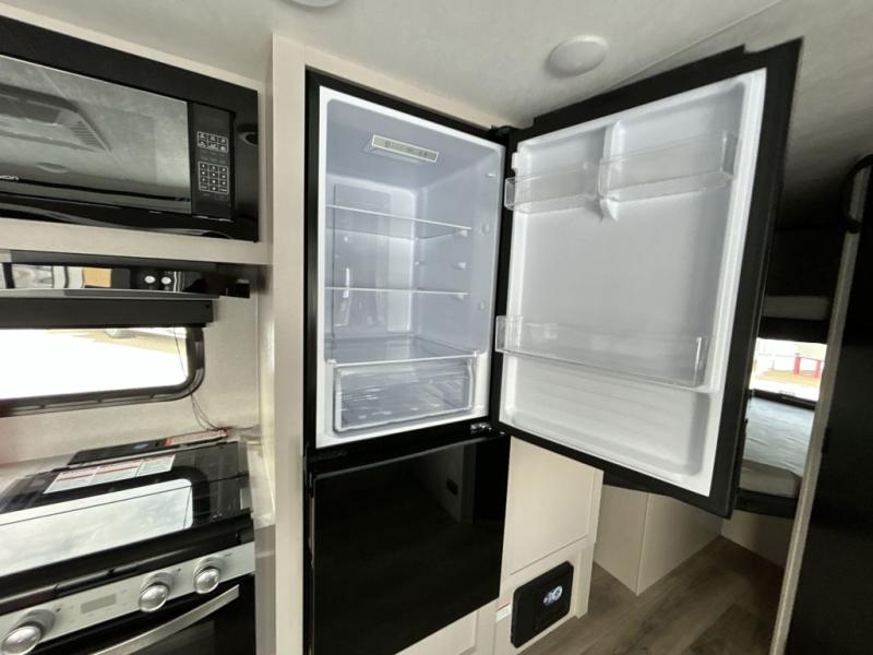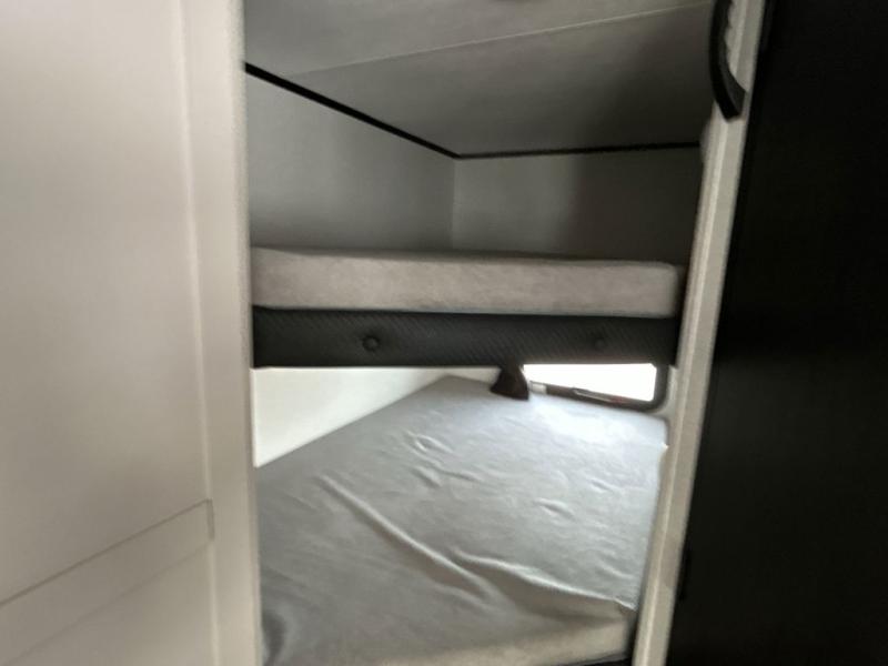 Camping with a larger group just got easier in this spacious travel trailer for eight! You'll have the front bedroom to yourselves which includes a walk-around queen bed with dual wardrobes and nightstands to keep your things tidy. The double-size bunks with storage below will be perfect for your guests or little ones, and the full bath adjacent to the bunks will let everyone freshen up each day. A booth dinette and jack-knife sofa within the large slide out provides a place to dine, play games, and convert to more sleeping space. And the chef of your group will find a full kitchen, complete with microwave oven, cooktop, pantry and 11 cu. ft. 12V refrigerator!