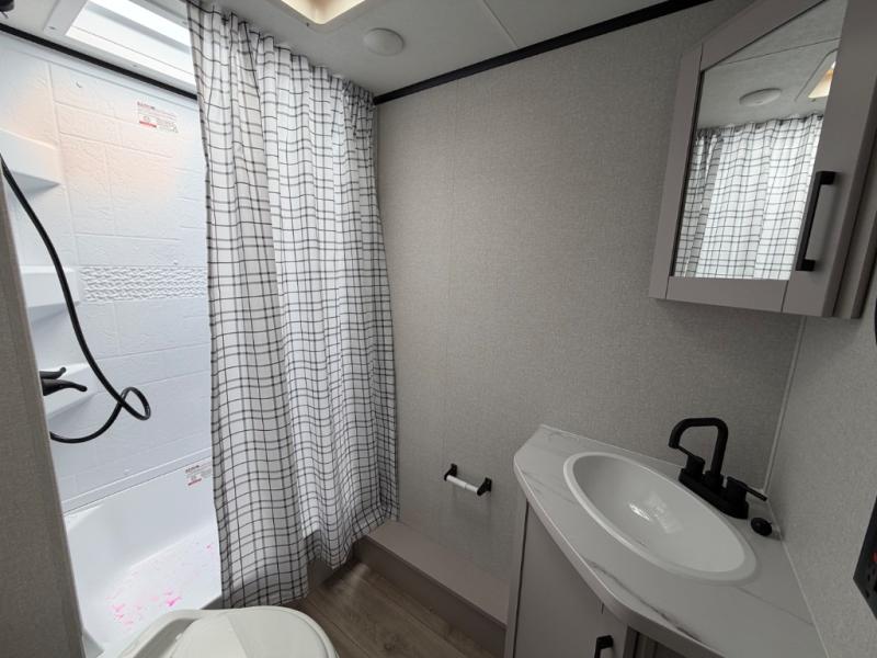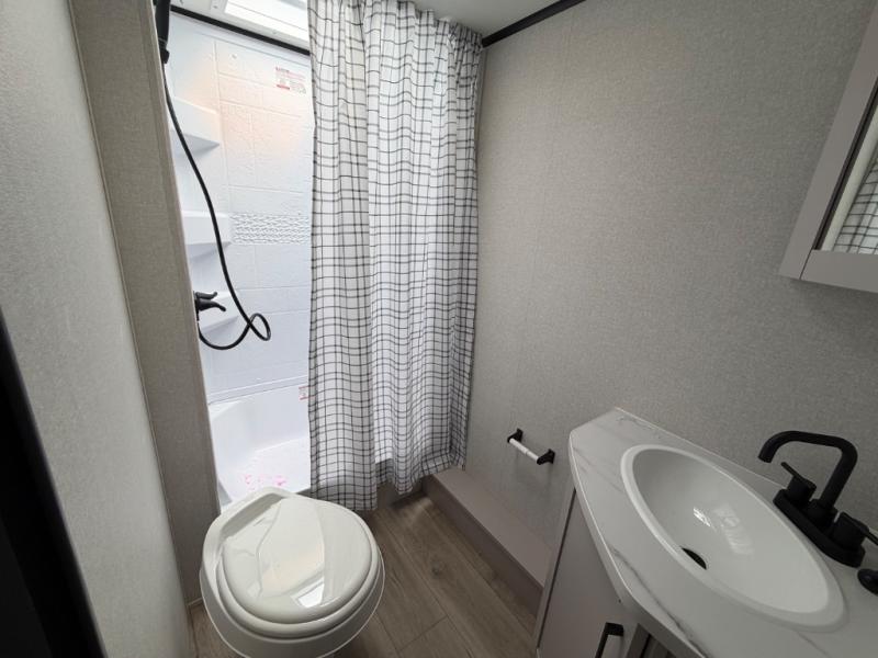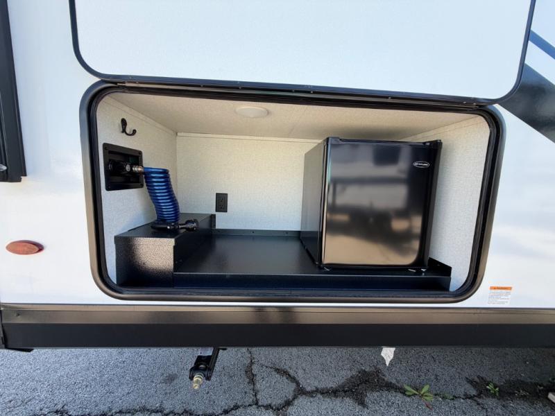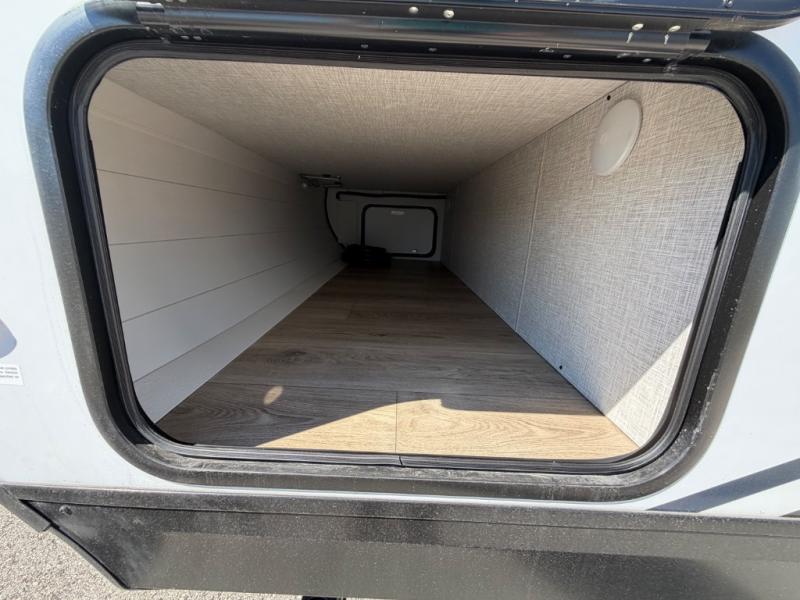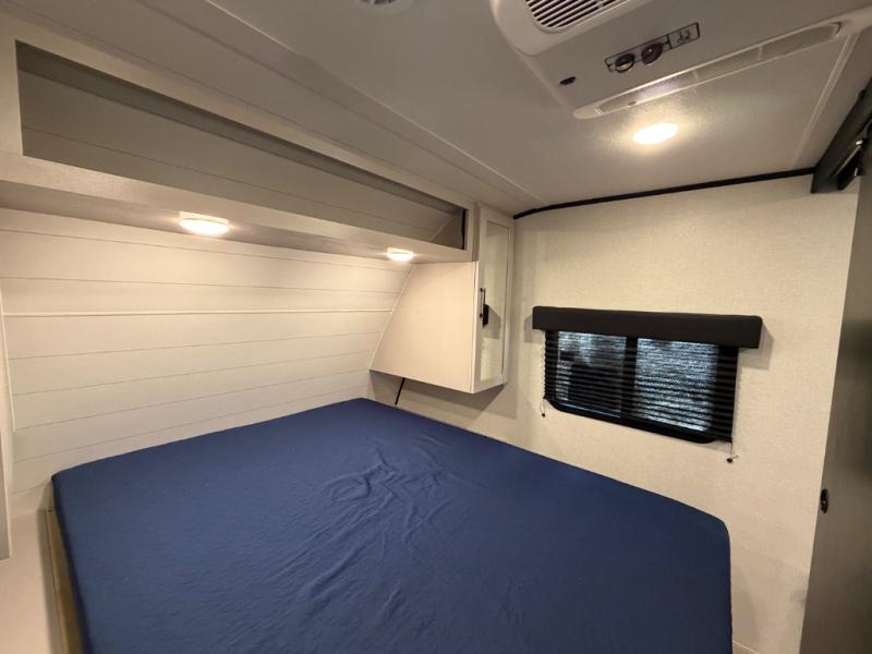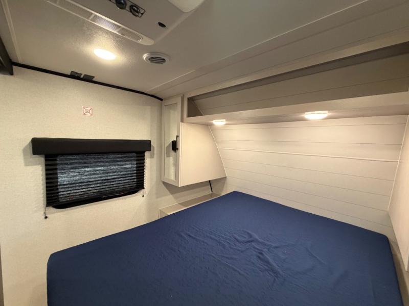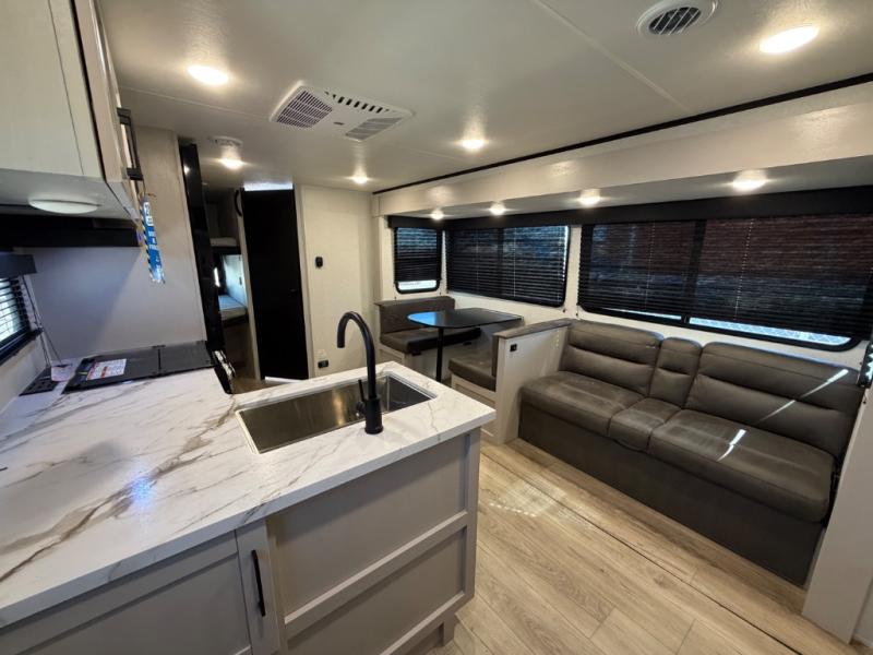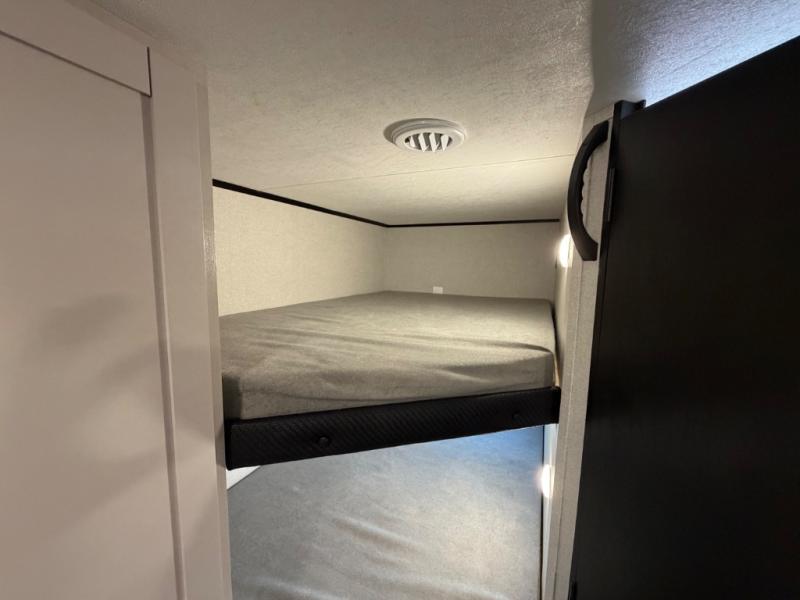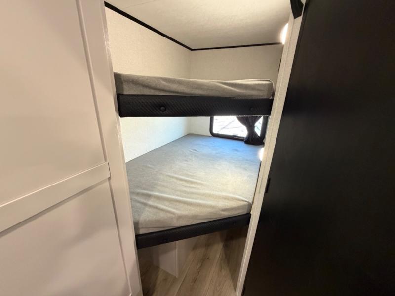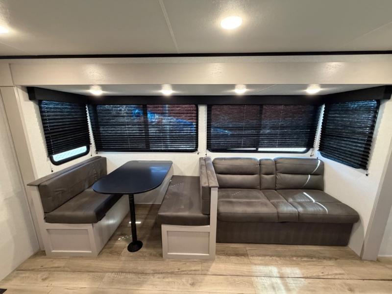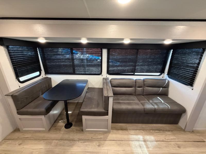 Camping with a larger group just got easier in this spacious travel trailer for eight! You'll have the front bedroom to yourselves which includes a walk-around queen bed with dual wardrobes and nightstands to keep your things tidy. The double-size bunks with storage below will be perfect for your guests or little ones, and the full bath adjacent to the bunks will let everyone freshen up each day. A booth dinette and jack-knife sofa within the large slide out provides a place to dine, play games, and convert to more sleeping space. And the chef of your group will find a full kitchen, complete with microwave oven, cooktop, pantry and 11 cu. ft. 12V refrigerator!