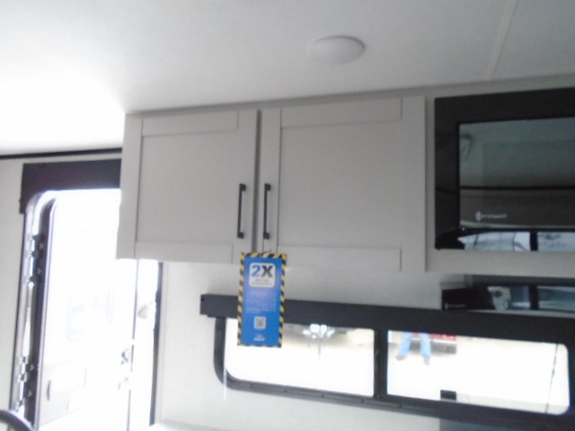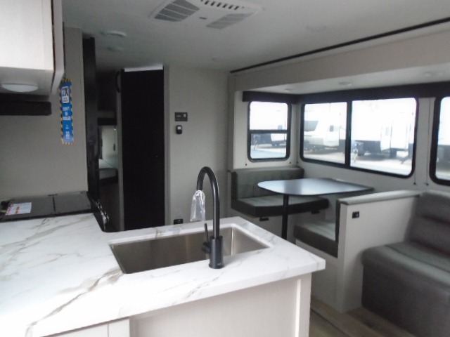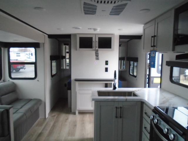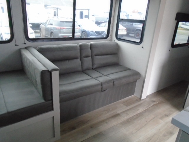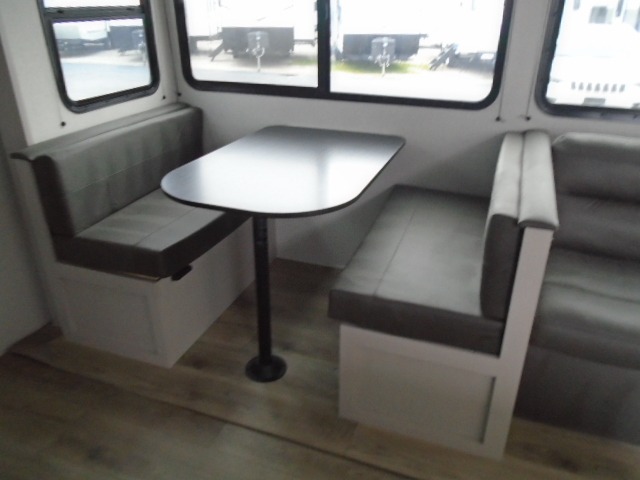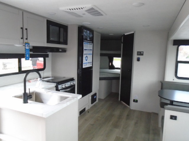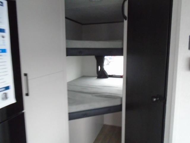 Camping with a larger group just got easier in this spacious travel trailer for eight! You'll have the front bedroom to yourselves which includes a walk-around queen bed with dual wardrobes and nightstands to keep your things tidy. The double-size bunks with storage below will be perfect for your guests or little ones, and the full bath adjacent to the bunks will let everyone freshen up each day. A booth dinette and jack-knife sofa within the large slide out provides a place to dine, play games, and convert to more sleeping space. And the chef of your group will find a full kitchen, complete with microwave oven, cooktop, pantry and 11 cu. ft. 12V refrigerator!