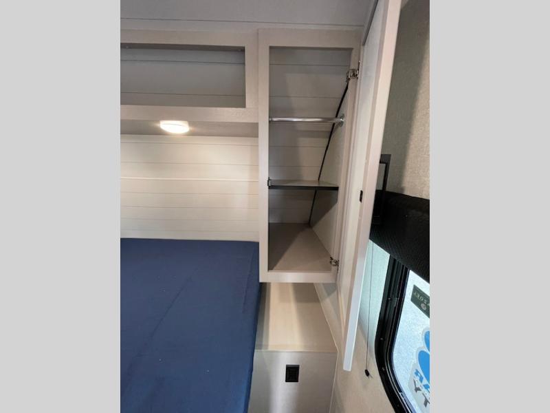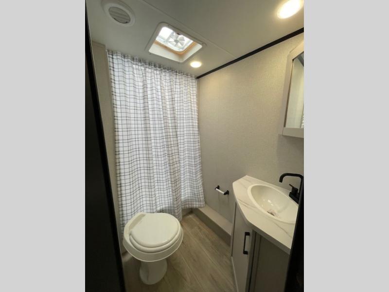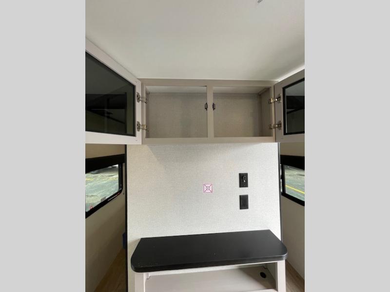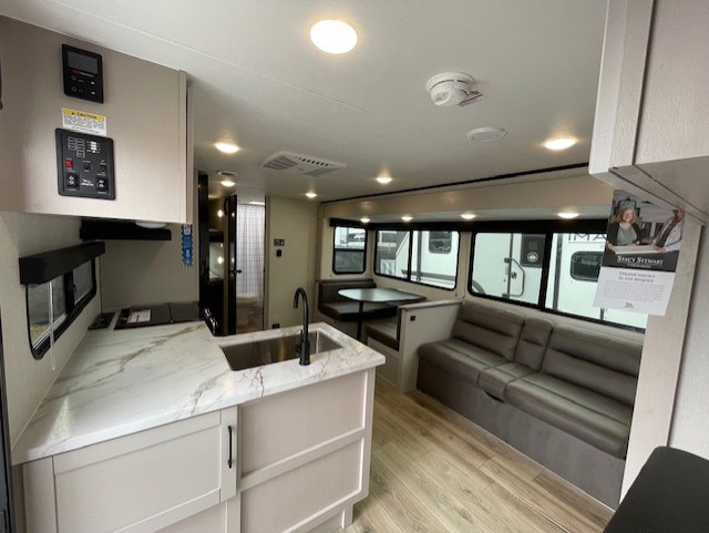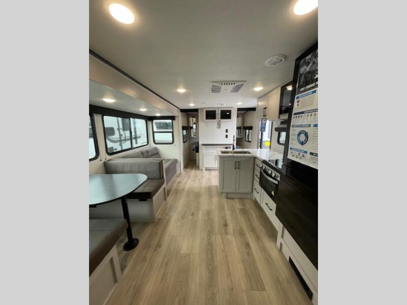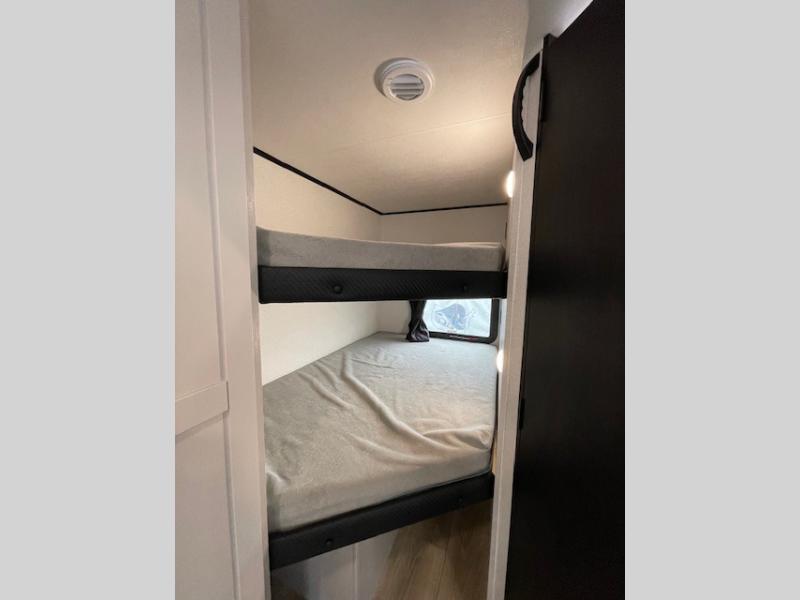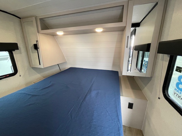 Camping with a larger group just got easier in this spacious travel trailer for eight! You'll have the front bedroom to yourselves which includes a walk-around queen bed with dual wardrobes and nightstands to keep your things tidy. The double-size bunks with storage below will be perfect for your guests or little ones, and the full bath adjacent to the bunks will let everyone freshen up each day. A booth dinette and jack-knife sofa within the large slide out provides a place to dine, play games, and convert to more sleeping space. And the chef of your group will find a full kitchen, complete with microwave oven, cooktop, pantry and 11 cu. ft. 12V refrigerator!