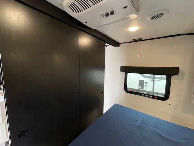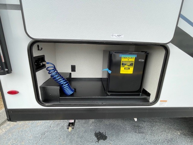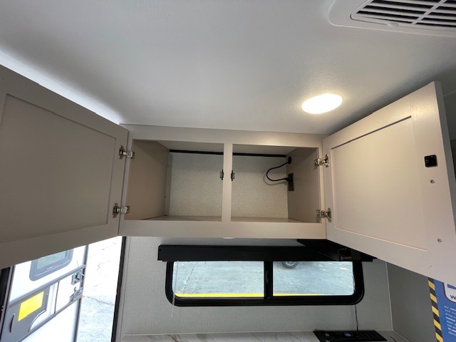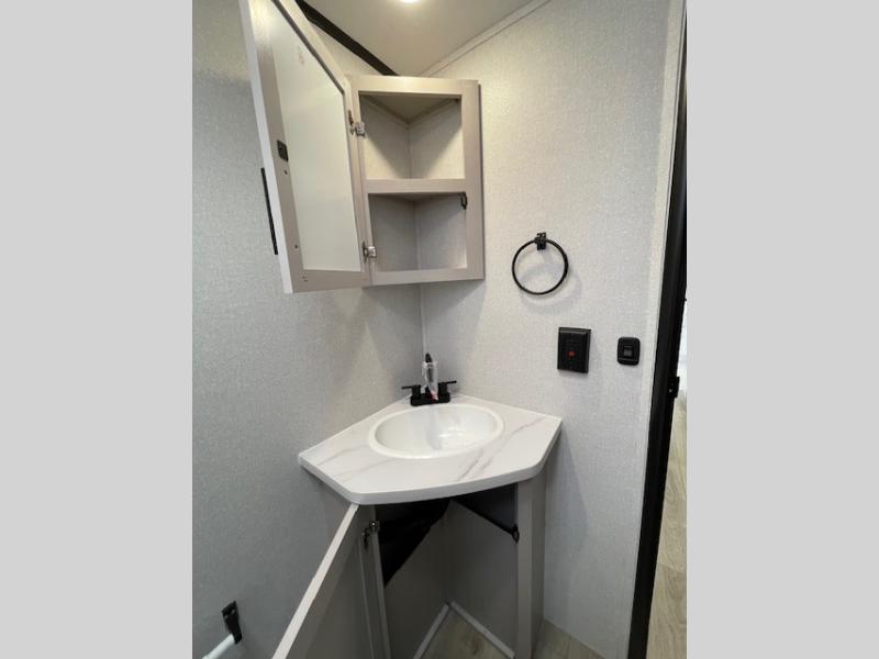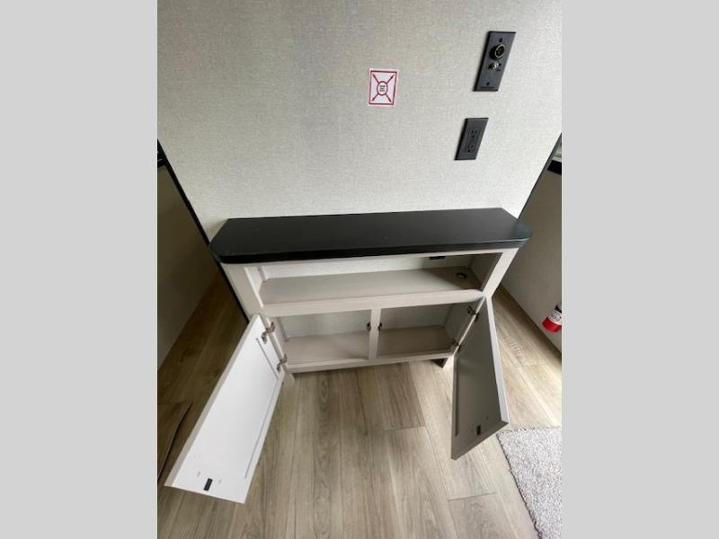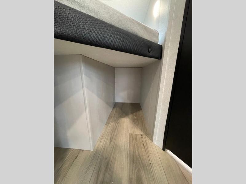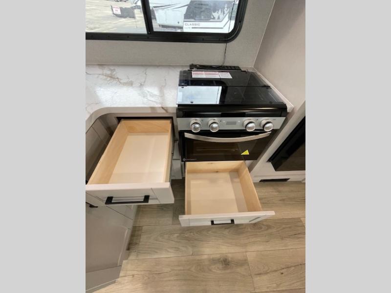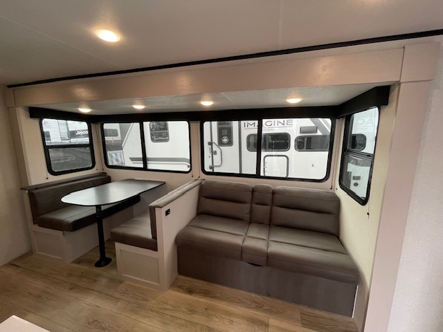 Camping with a larger group just got easier in this spacious travel trailer for eight! You'll have the front bedroom to yourselves which includes a walk-around queen bed with dual wardrobes and nightstands to keep your things tidy. The double-size bunks with storage below will be perfect for your guests or little ones, and the full bath adjacent to the bunks will let everyone freshen up each day. A booth dinette and jack-knife sofa within the large slide out provides a place to dine, play games, and convert to more sleeping space. And the chef of your group will find a full kitchen, complete with microwave oven, cooktop, pantry and 11 cu. ft. 12V refrigerator!