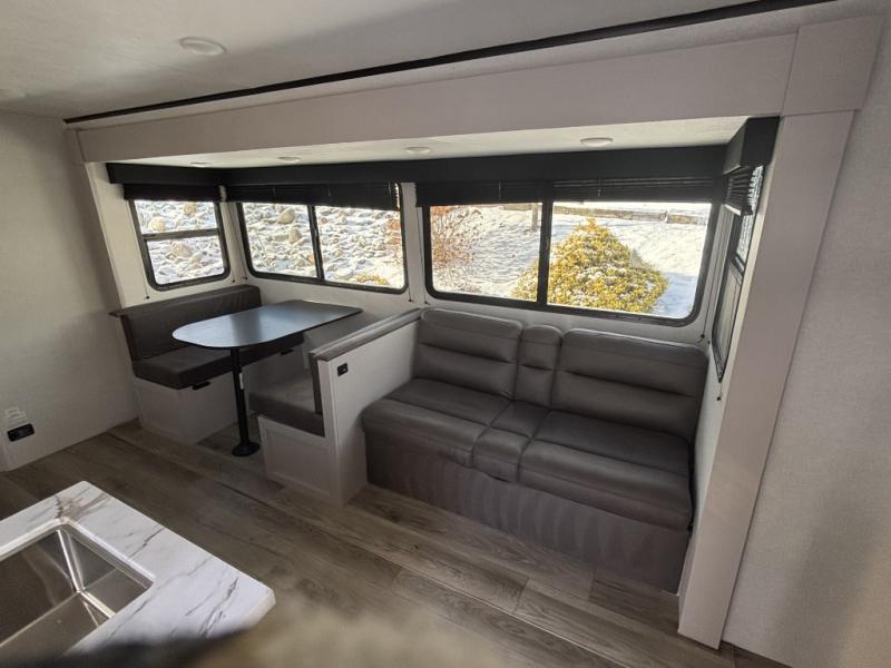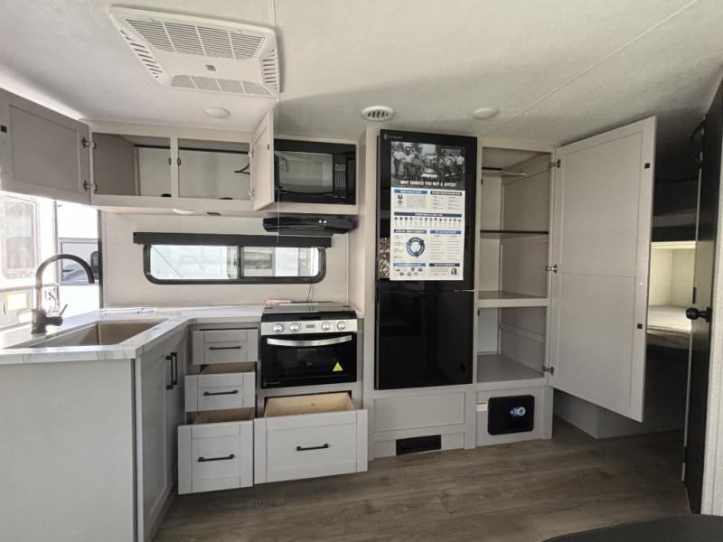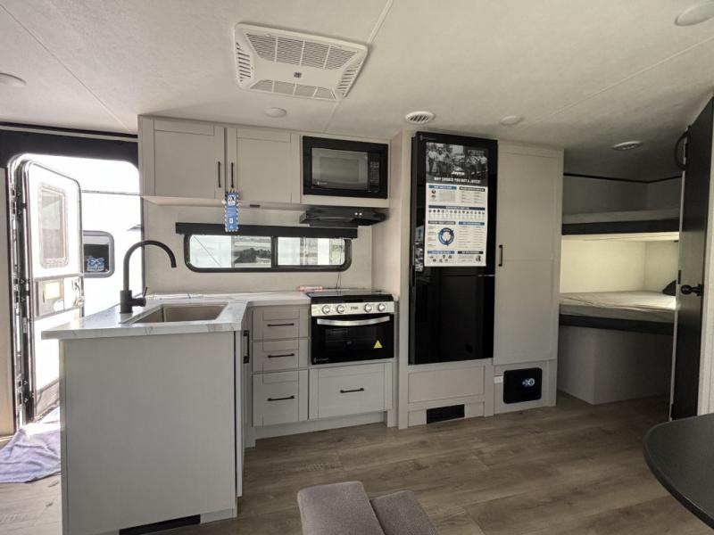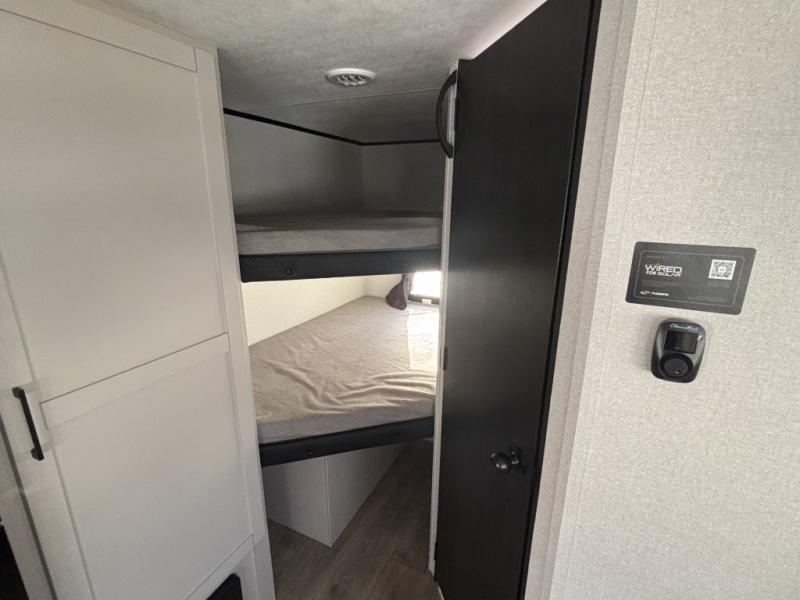 Camping with a larger group just got easier in this spacious travel trailer for eight! You'll have the front bedroom to yourselves which includes a walk-around queen bed with dual wardrobes and nightstands to keep your things tidy. The double-size bunks with storage below will be perfect for your guests or little ones, and the full bath adjacent to the bunks will let everyone freshen up each day. A booth dinette and jack-knife sofa within the large slide out provides a place to dine, play games, and convert to more sleeping space. And the chef of your group will find a full kitchen, complete with microwave oven, cooktop, pantry and 11 cu. ft. 12V refrigerator!