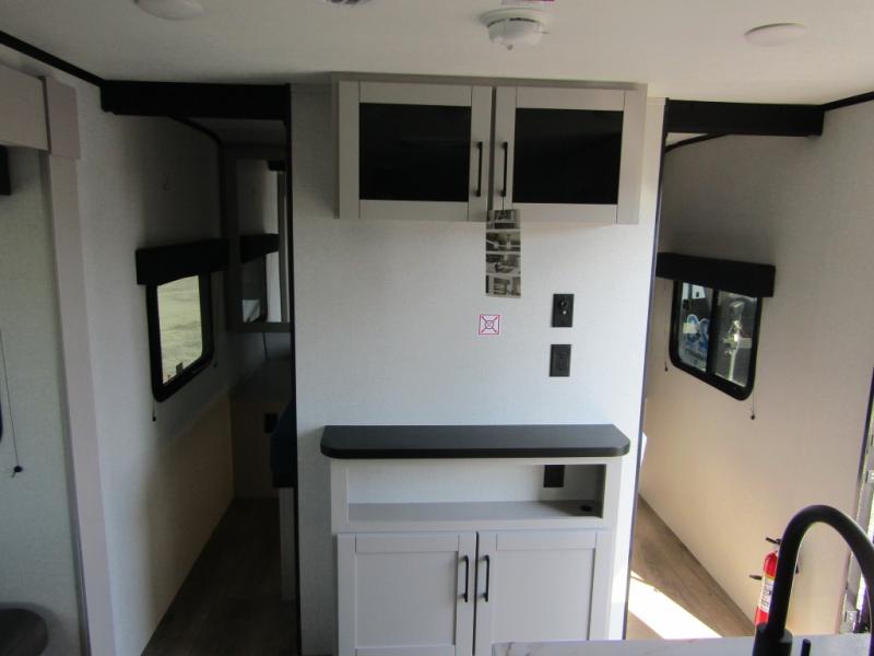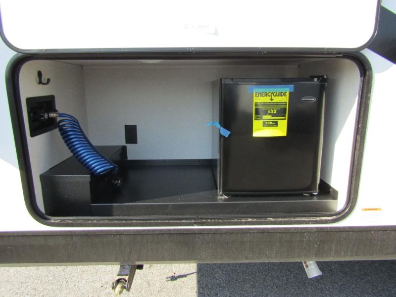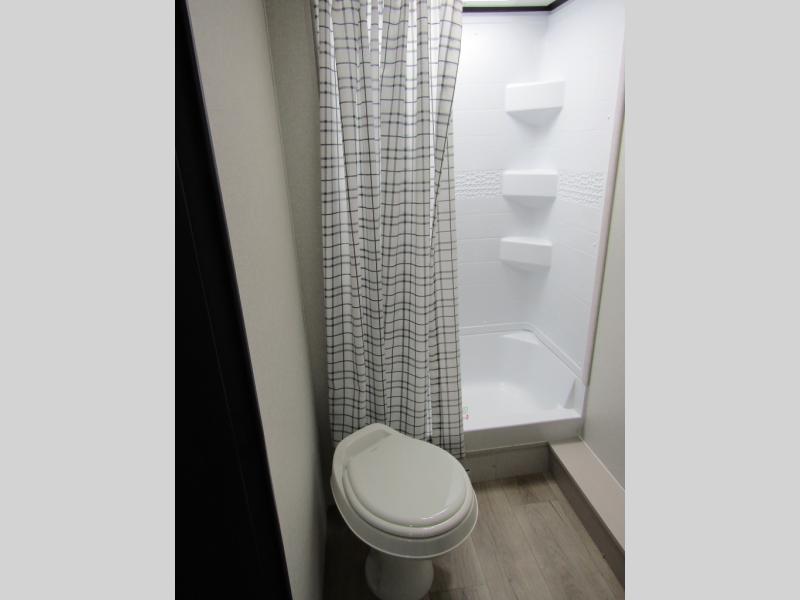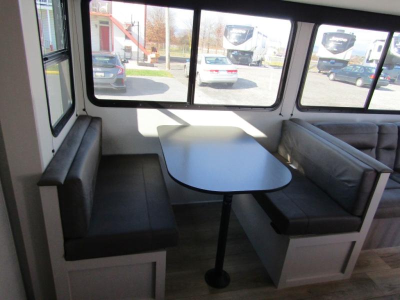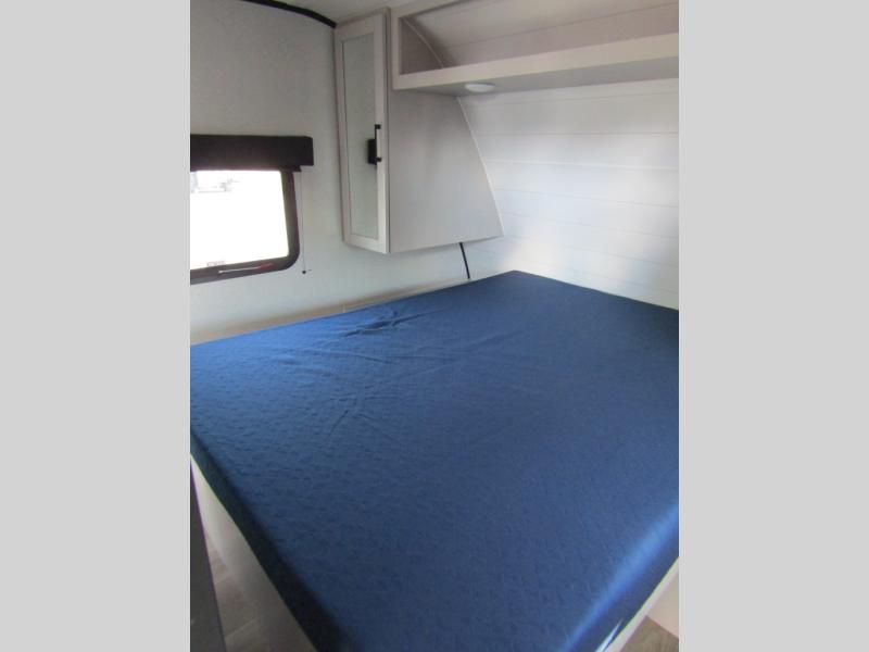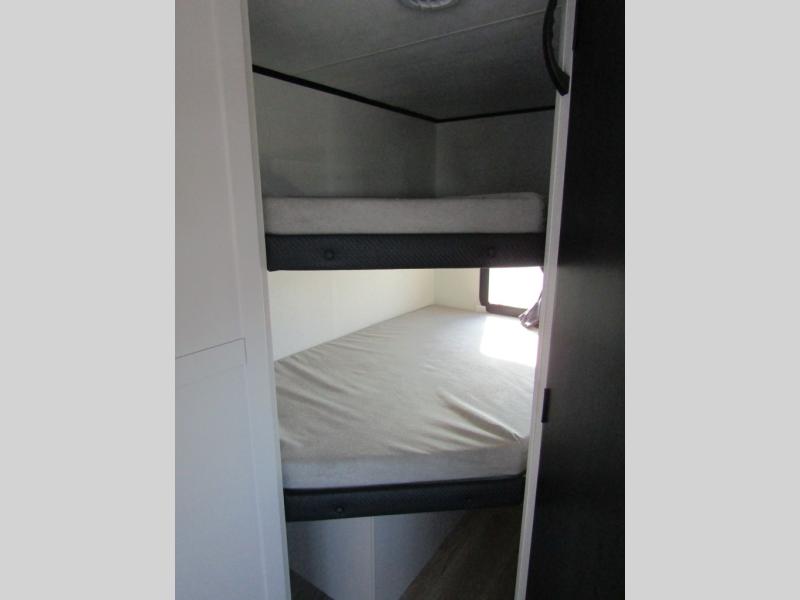 Camping with a larger group just got easier in this spacious travel trailer for eight! You'll have the front bedroom to yourselves which includes a walk-around queen bed with dual wardrobes and nightstands to keep your things tidy. The double-size bunks with storage below will be perfect for your guests or little ones, and the full bath adjacent to the bunks will let everyone freshen up each day. A booth dinette and jack-knife sofa within the large slide out provides a place to dine, play games, and convert to more sleeping space. And the chef of your group will find a full kitchen, complete with microwave oven, cooktop, pantry and 11 cu. ft. 12V refrigerator!