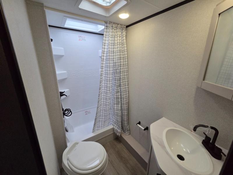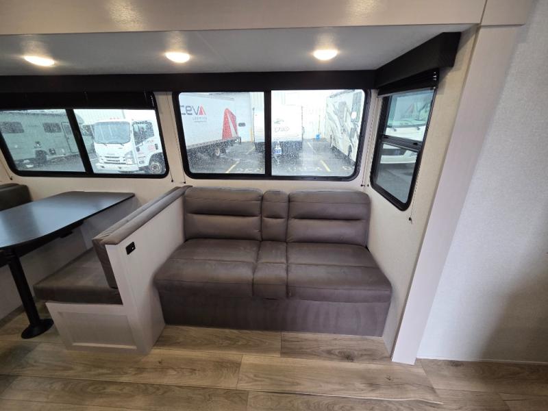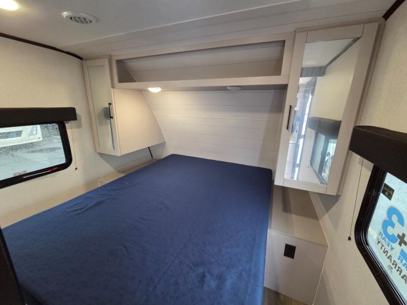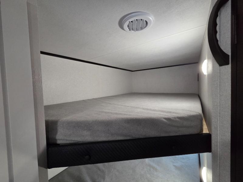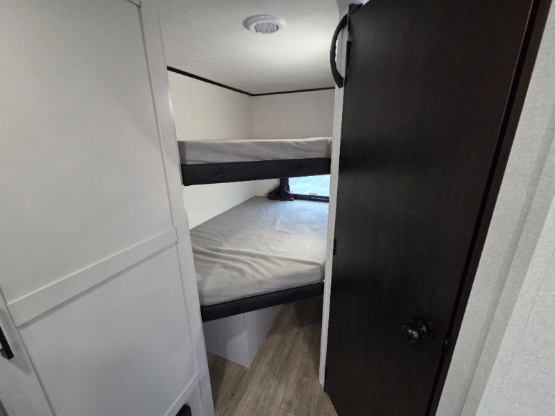 Camping with a larger group just got easier in this spacious travel trailer for eight! You'll have the front bedroom to yourselves which includes a walk-around queen bed with dual wardrobes and nightstands to keep your things tidy. The double-size bunks with storage below will be perfect for your guests or little ones, and the full bath adjacent to the bunks will let everyone freshen up each day. A booth dinette and jack-knife sofa within the large slide out provides a place to dine, play games, and convert to more sleeping space. And the chef of your group will find a full kitchen, complete with microwave oven, cooktop, pantry and 11 cu. ft. 12V refrigerator!