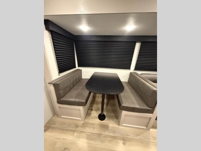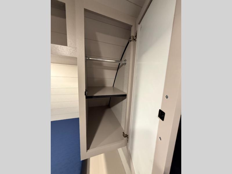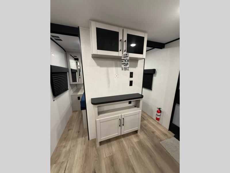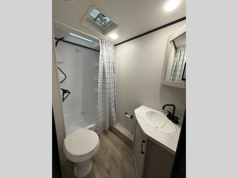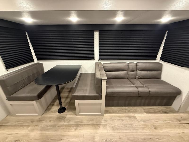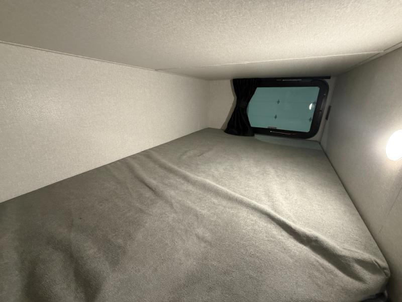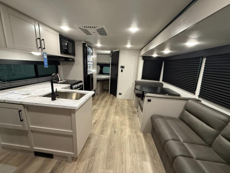 Camping with a larger group just got easier in this spacious travel trailer for eight! You'll have the front bedroom to yourselves which includes a walk-around queen bed with dual wardrobes and nightstands to keep your things tidy. The double-size bunks with storage below will be perfect for your guests or little ones, and the full bath adjacent to the bunks will let everyone freshen up each day. A booth dinette and jack-knife sofa within the large slide out provides a place to dine, play games, and convert to more sleeping space. And the chef of your group will find a full kitchen, complete with microwave oven, cooktop, pantry and 11 cu. ft. 12V refrigerator!