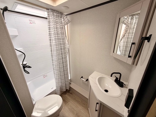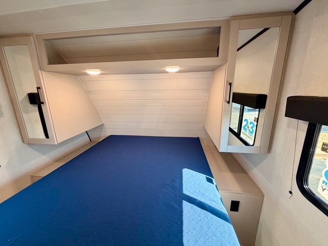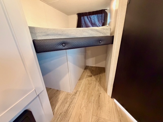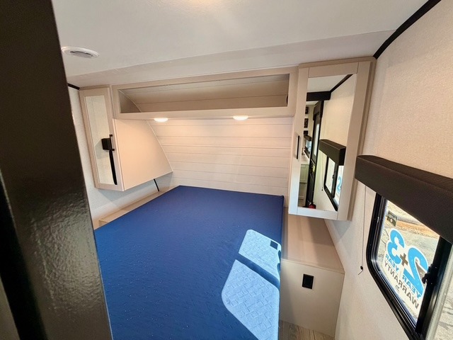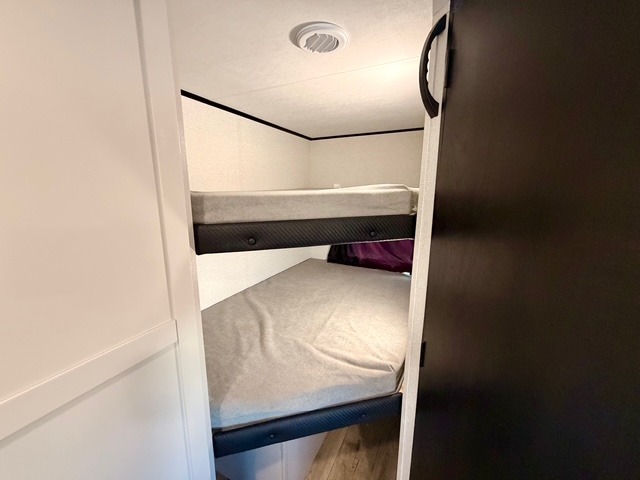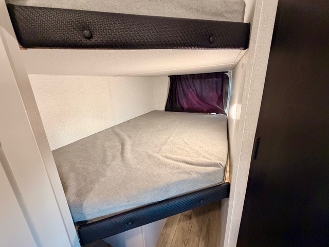 Camping with a larger group is a breeze in this Jayco Jay Feather SL 26BHSL travel trailer, which comfortably sleeps up to eight people. The front private bedroom features a walk-around queen bed with dual wardrobes and nightstands, providing plenty of storage for your personal items. The rear double-size bunks include storage below for extra convenience, making them ideal for kids or guests. The adjacent full bath features a 24" x 40" shower, sink, and toilet, ensuring everyone can freshen up easily.