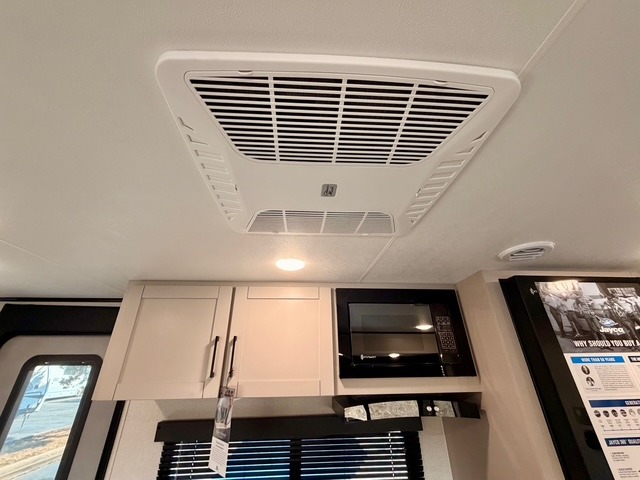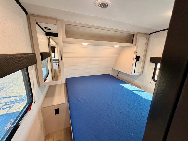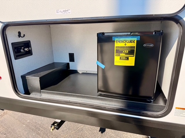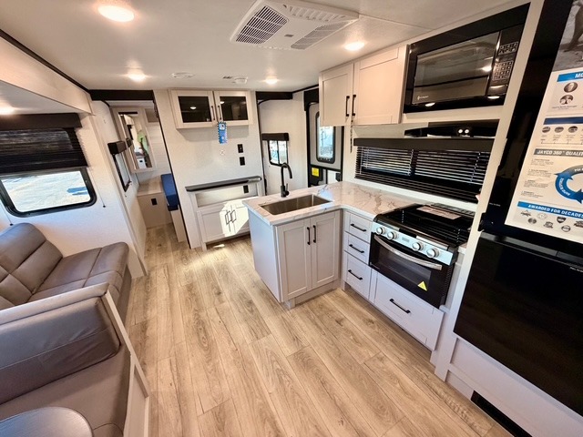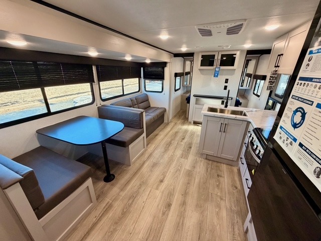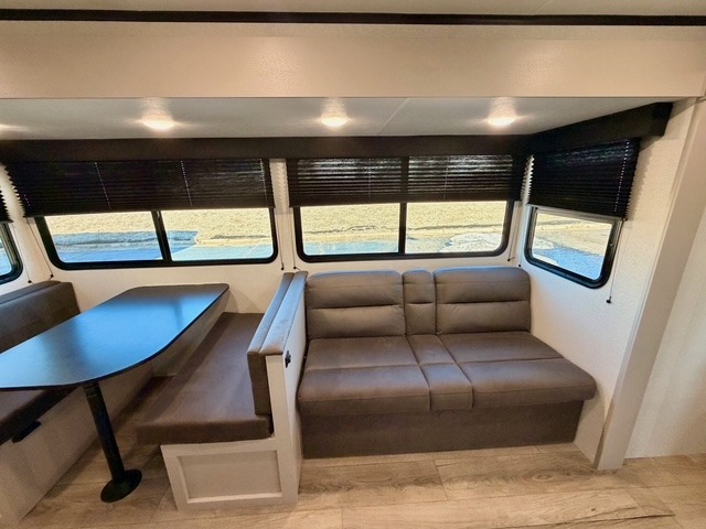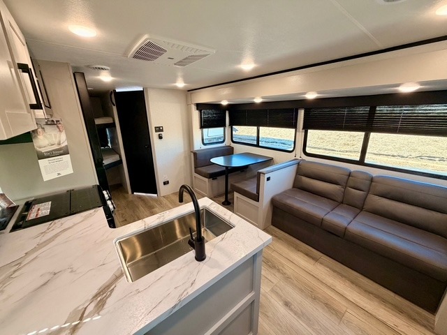 The large slide out houses a booth dinette and a jack-knife sofa, offering ample space to dine, play games, or convert to additional sleeping areas. The fully equipped kitchen includes a microwave, cooktop, pantry, and an 11 cu. ft. 12V refrigerator, so preparing meals while on the road is simple and convenient. An exterior refrigerator adds even more functionality for drinks or quick snacks outdoors.