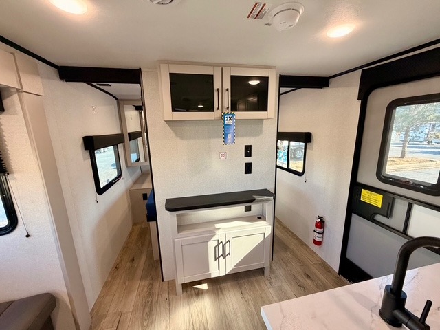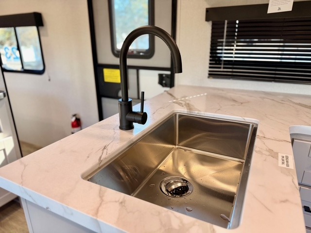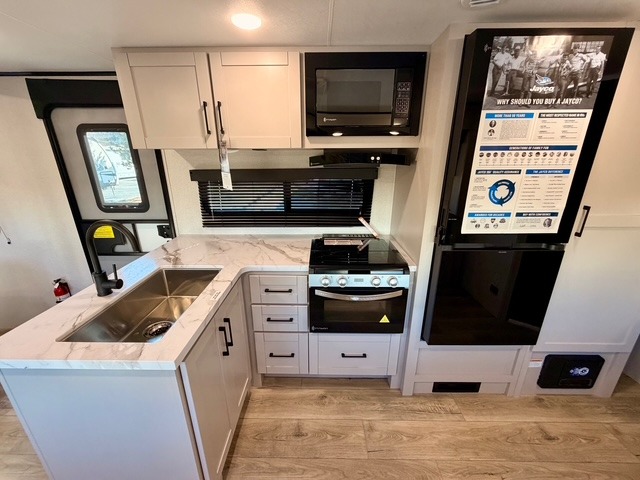 This Jay Feather SL model is built for lightweight towing and long-lasting durability. Key construction features include a Magnum Truss roof system, fully integrated A-frame, and exterior Azdel composite panels. Comfort and convenience continue with nitrogen-filled radial tires, MORryde Step Above entry steps, a power awning with LED lights, and a power tongue jack. Inside, enjoy vinyl flooring throughout, solid hardwood cabinet doors, a residential-style kitchen countertop, and a shower surround that elevates the feel of your mobile living space.