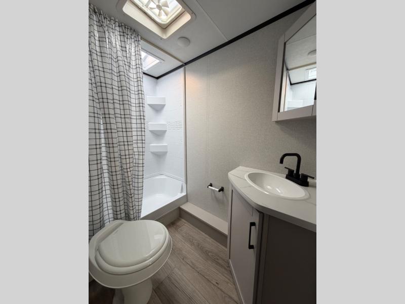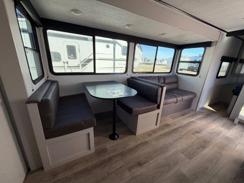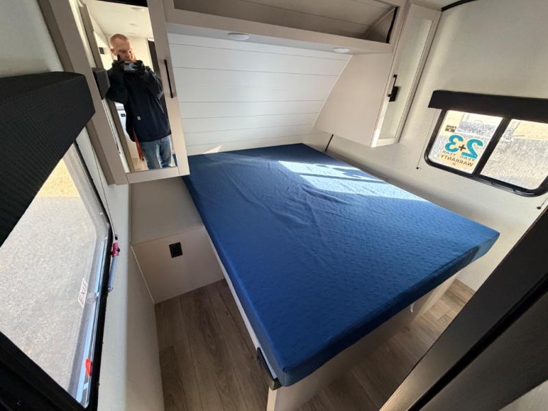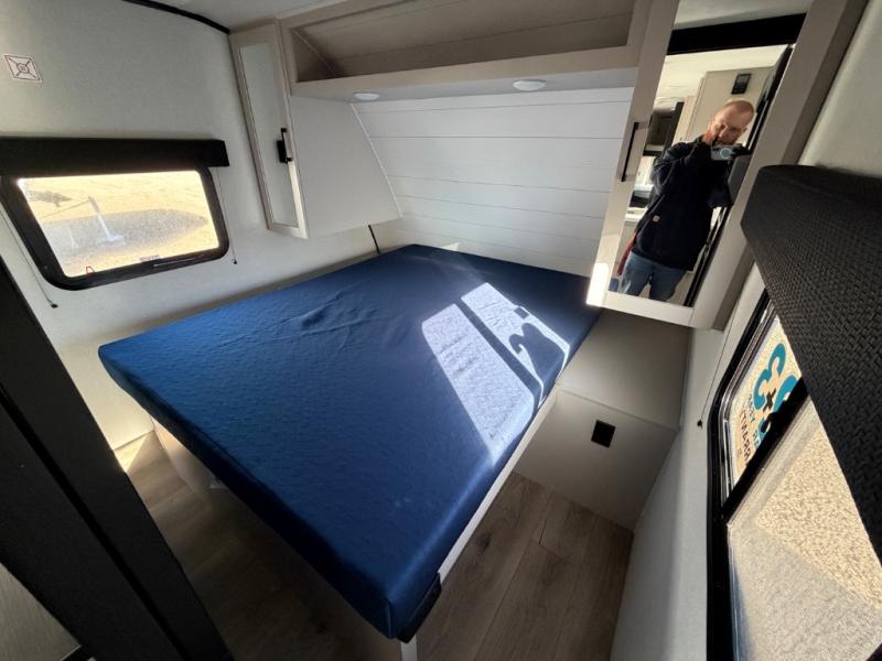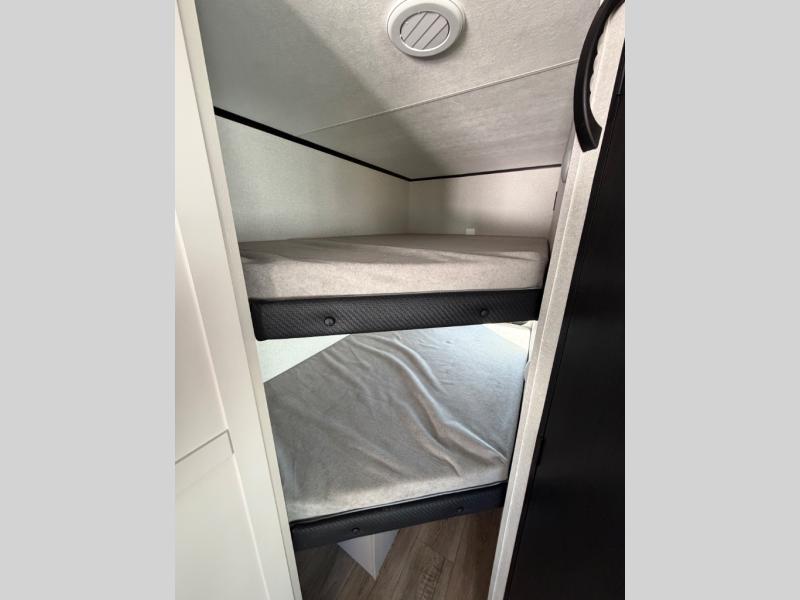 Camping with a larger group just got easier in this spacious travel trailer for eight! You'll have the front bedroom to yourselves which includes a walk-around queen bed with dual wardrobes and nightstands to keep your things tidy. The double-size bunks with storage below will be perfect for your guests or little ones, and the full bath adjacent to the bunks will let everyone freshen up each day. A booth dinette and jack-knife sofa within the large slide out provides a place to dine, play games, and convert to more sleeping space. And the chef of your group will find a full kitchen, complete with microwave oven, cooktop, pantry and 11 cu. ft. 12V refrigerator!