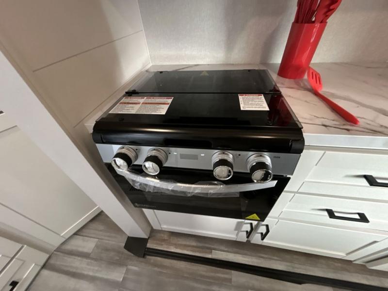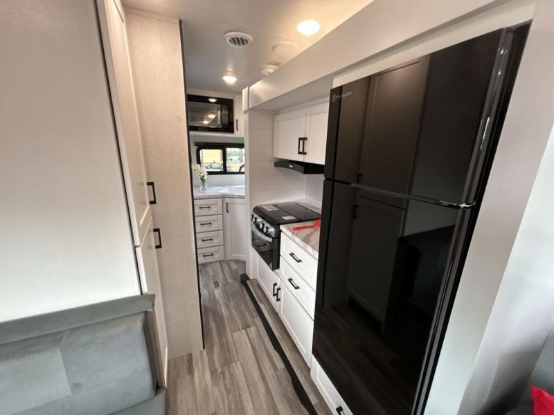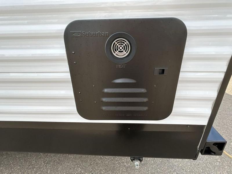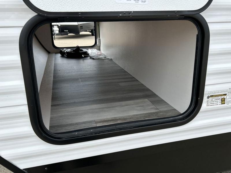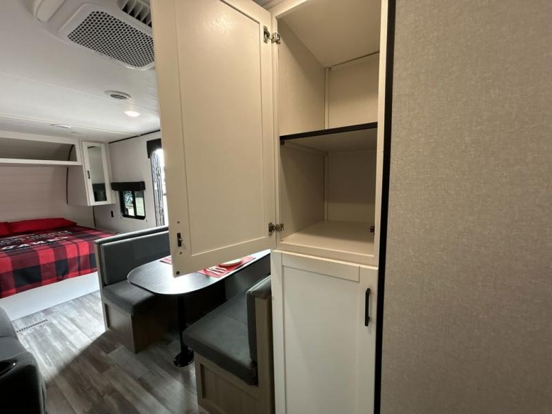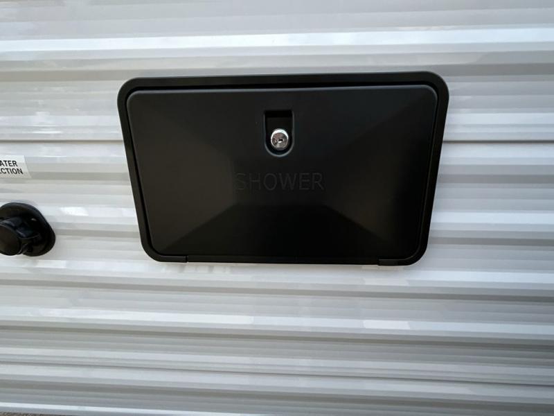 You will have a comfortable camping trip in this travel trailer! It offers full kitchen amenities including a pantry for snacks and such, plus a full rear corner bathroom for privacy and includes a shower. When you need a break, the semi-private bedroom up front offers a queen bed, dual wardrobes and a curtain to close, and the booth dinette can transform into a sleeping space as well. There is a 18' power awning with LED lights for you to enjoy this outdoor space into the night, plus exterior storage for your outdoor games and gear.