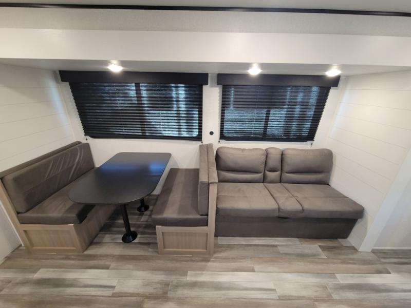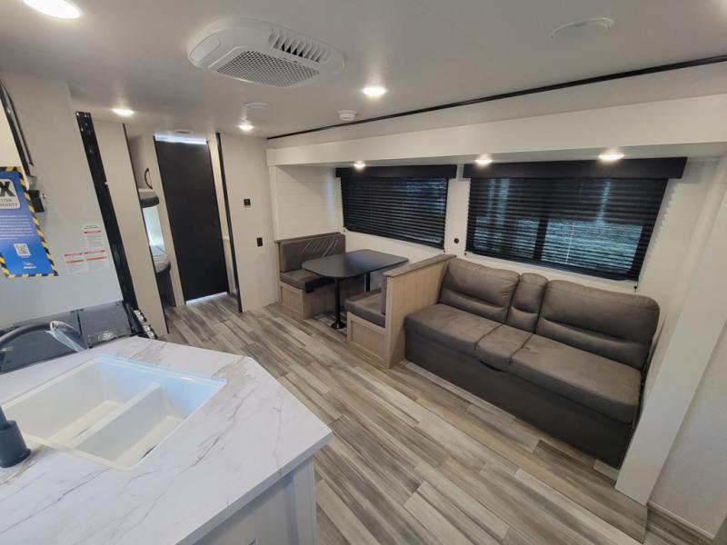 You can comfortably sleep up to ten people in this trailer thanks to the double-size bunks in back, the RV queen bed in the front bedroom, plus the booth dinette and jack-knife sofa in the main living area! The chef of your crew will have a three burner cooktop and microwave oven to prepare meals, and everyone can store their favorite drinks in the 8 cu. ft. 12V refrigerator inside, or in the outdoor refrigerator for convenience. The rear corner bathroom includes a shower and a toilet, with the sink just outside of this room so others can brush their teeth if one is taking a shower before bed. The outside storage is accessible on both sides of the unit and will easily allow you bring along camp chairs, yard games and more. A 16' powered awning with LED lights will create a nice place to gather in the evenings with family and friends!