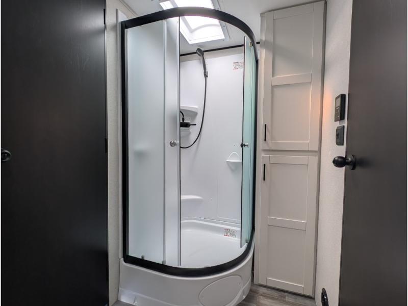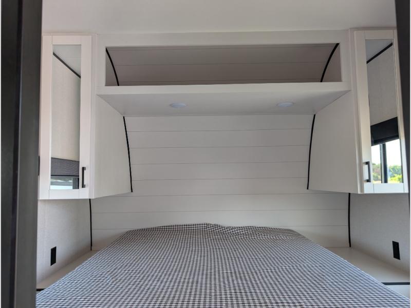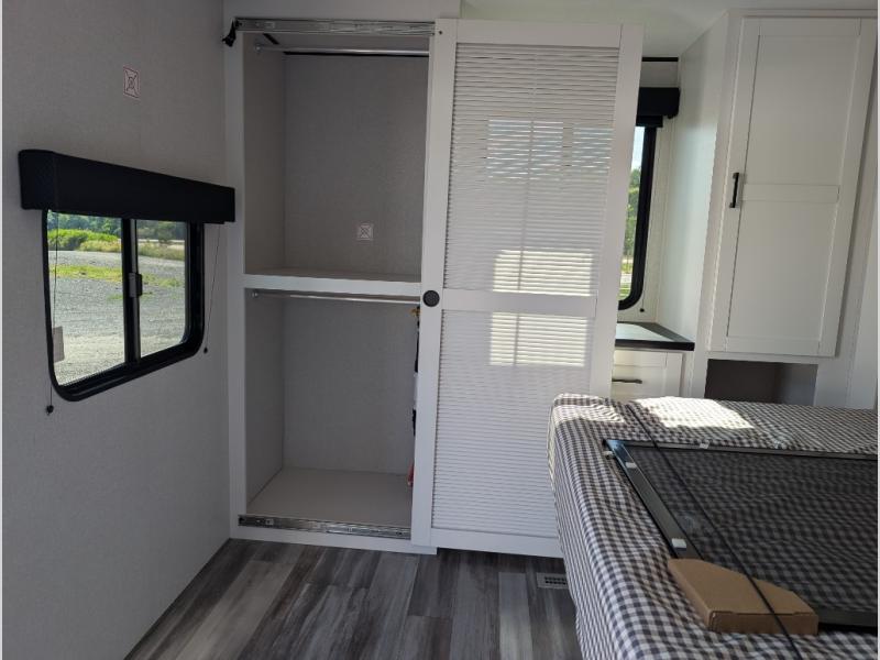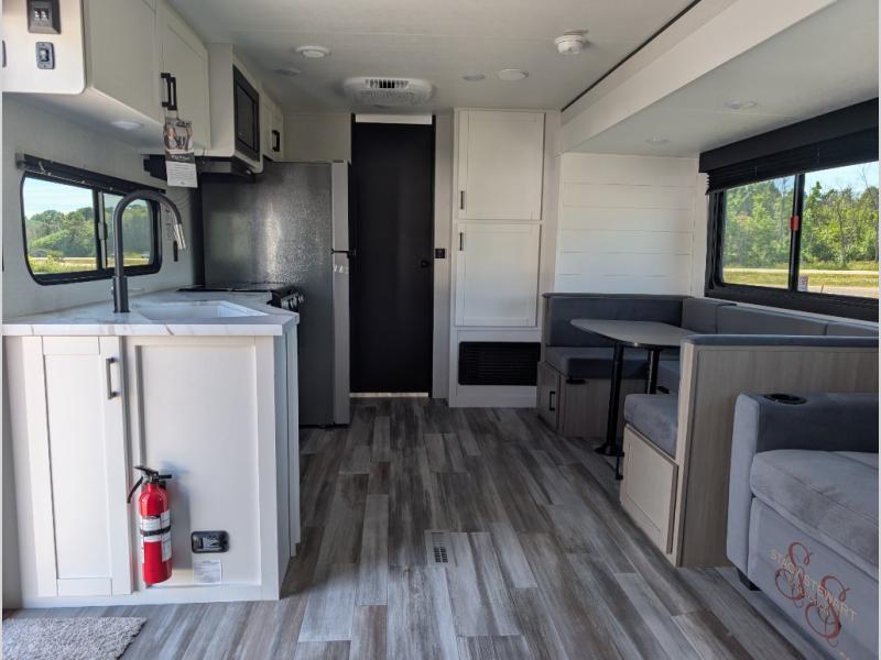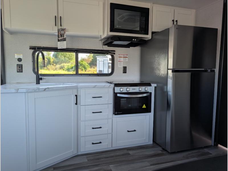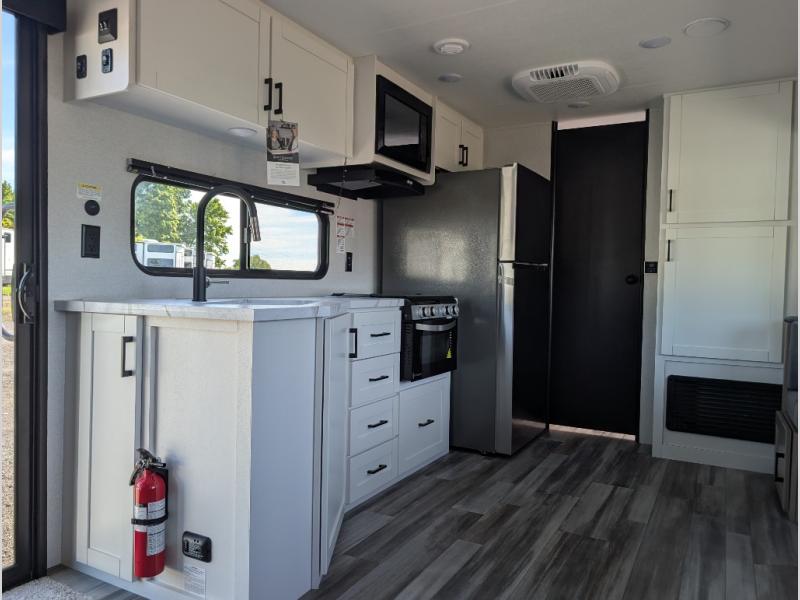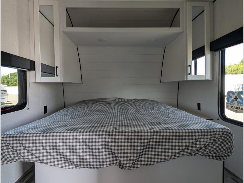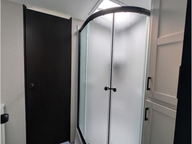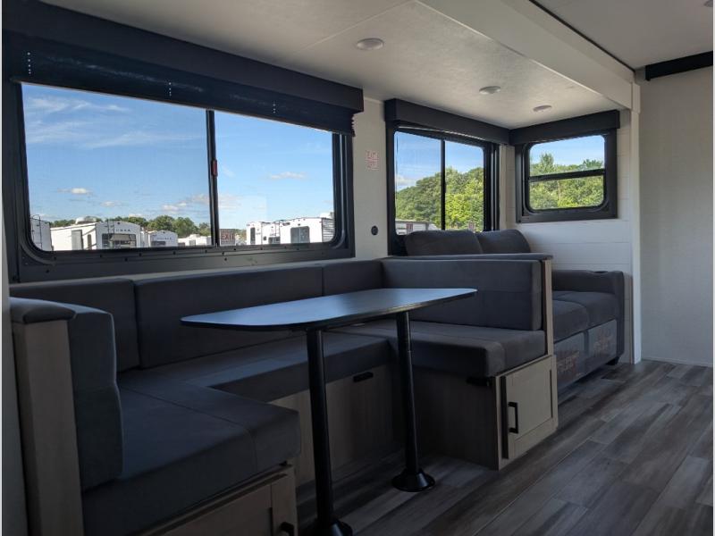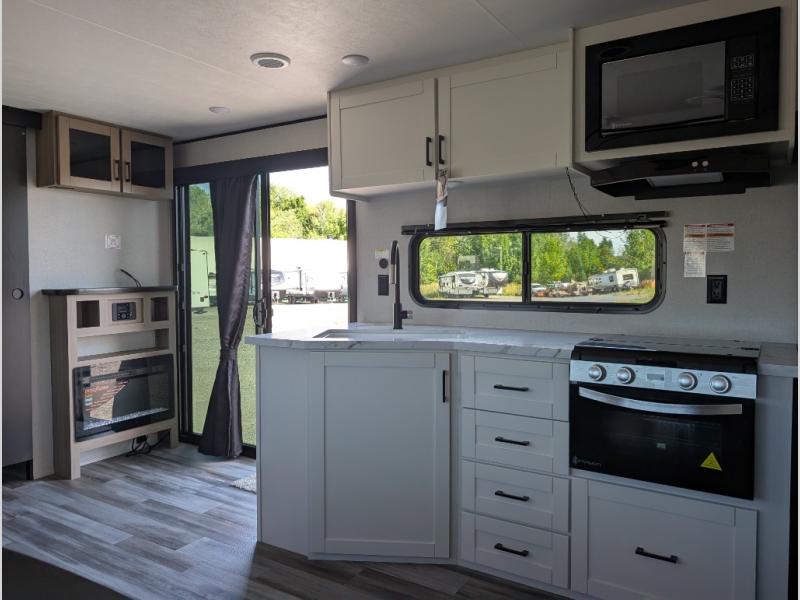 With two private bedrooms, everyone will have a comfortable place to sleep in this travel trailer! The front private bedroom has a 60" x 75" queen bed with wardrobes on either side and the rear private bedroom has a 60" x 80" queen bed slide with a dresser, a wardrobe, one of the exit/entrance doors, and an entrance into the walk-through bathroom which has a radius shower for everyone to stay squeaky clean. The patio doors not only make it easy to enter and exit the unit, but also bring in tons of natural lighting. After you have prepared a delicious home cooked meal, you can can head to the U-shaped dinette to enjoy it there comfortably then relax on the Jack-knife sofa across from the entertainment center!