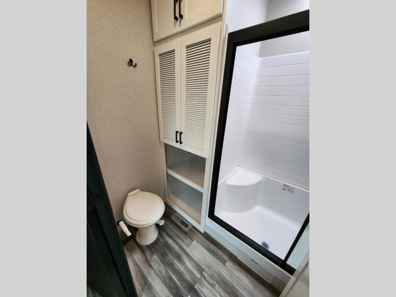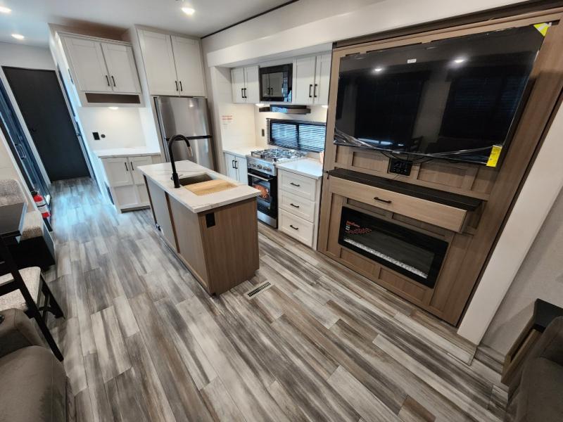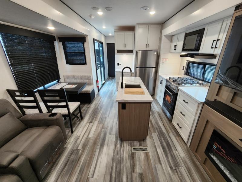 Your crew of four will love extended stays in this triple slide out trailer! Once you've unpacked your bags, you can head to the kitchen to prepare lunch on the cooktop and kitchen island. There is a table and chairs with a bench to dine at, and you can relax on the theater seat after your meal is cleaned up. A front tri-fold sofa will provide more seating space, along with sleeping space for guests. A full bath includes washer and dryer prep if you plan to add these appliances, and the rear private bedroom is sure to make you feel right at home. There is a queen bed slide, a wardrobe, vanity, and large dresser so nothing gets left behind!