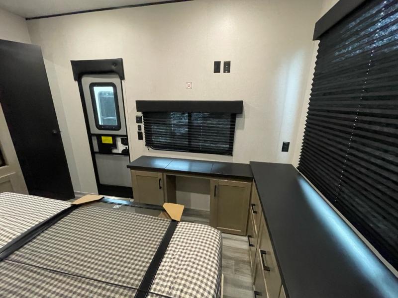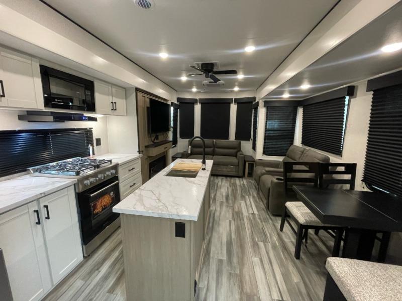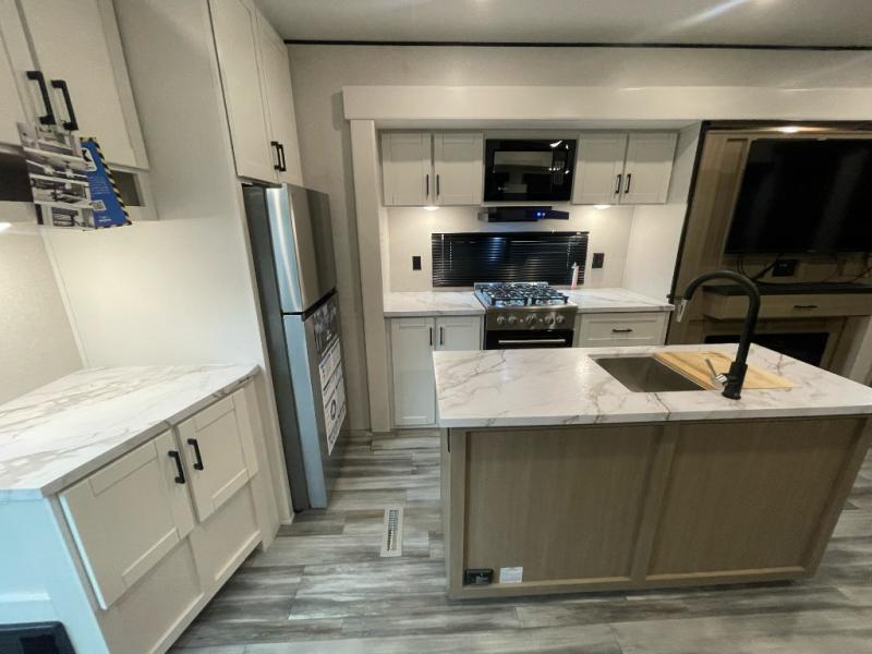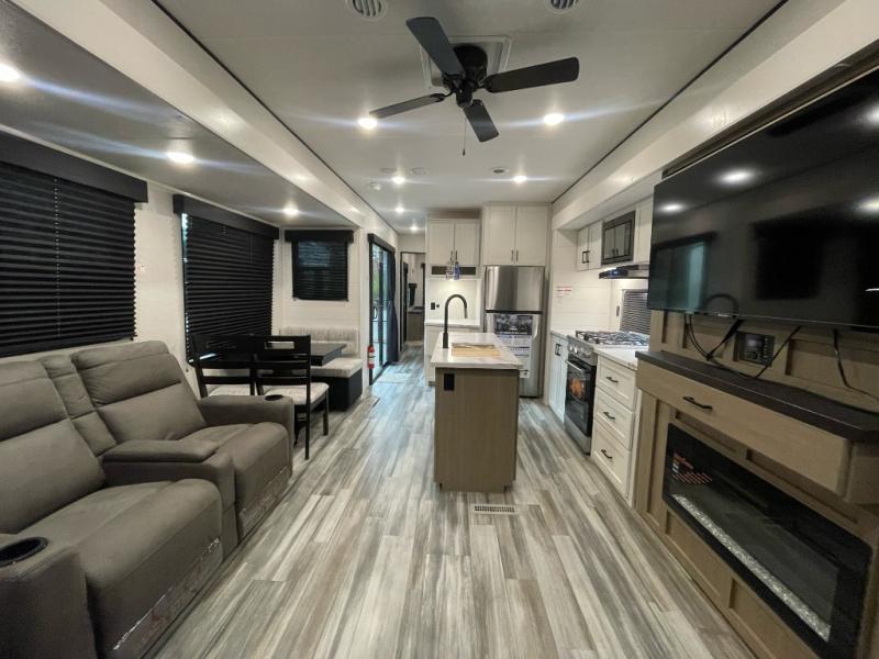Your crew of four will love extended stays in this triple slide out trailer! Once you've unpacked your bags, you can head to the kitchen to prepare lunch on the cooktop and kitchen island. There is a table and chairs with a bench to dine at, and you can relax on the theater seat after your meal is cleaned up. A front tri-fold sofa will provide more seating space, along with sleeping space for guests. A full bath includes washer and dryer prep if you plan to add these appliances, and the rear private bedroom is sure to make you feel right at home. There is a queen bed slide, a wardrobe, vanity, and large dresser so nothing gets left behind!