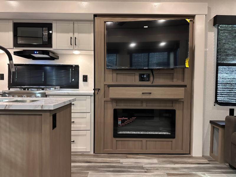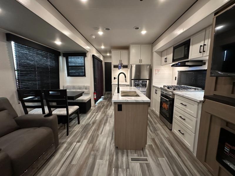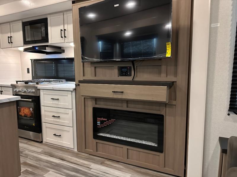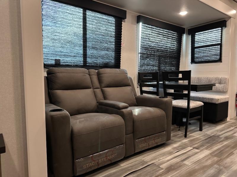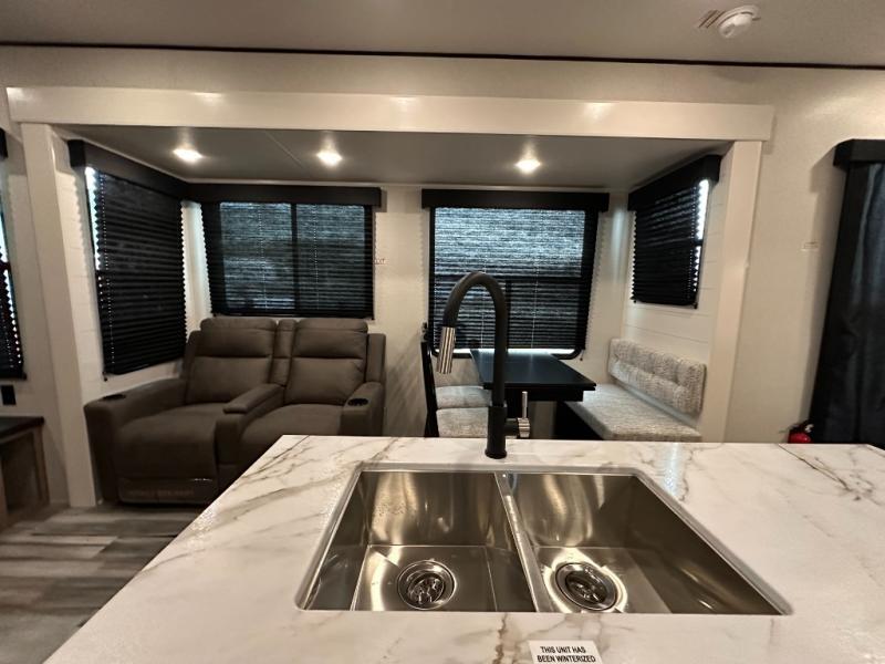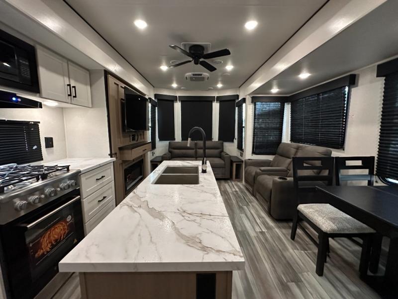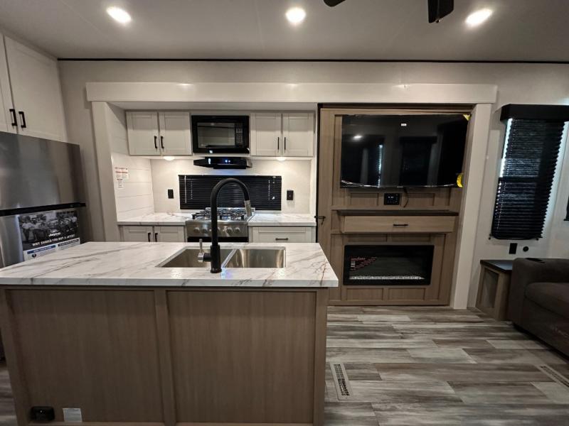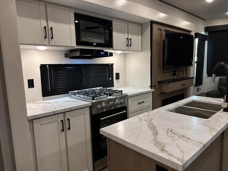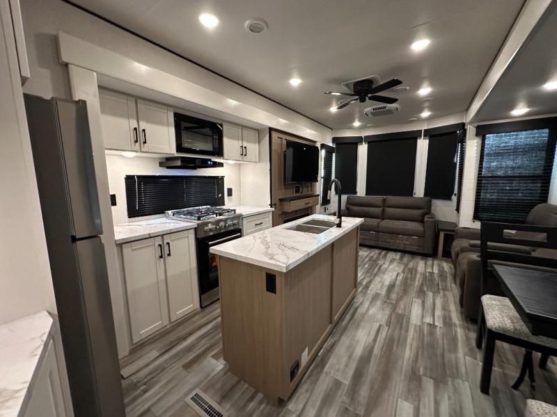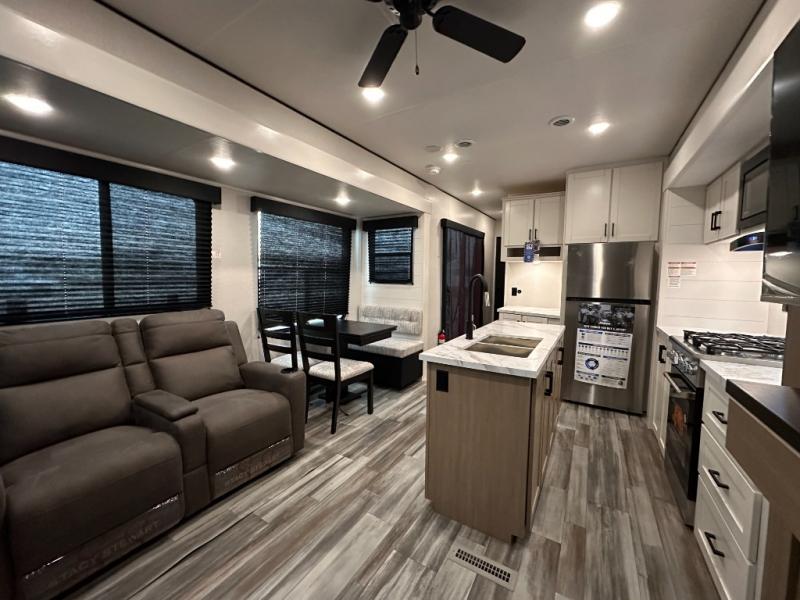 Your crew of four will love extended stays in this triple slide out trailer! Once you've unpacked your bags, you can head to the kitchen to prepare lunch on the cooktop and kitchen island. There is a table and chairs with a bench to dine at, and you can relax on the theater seat after your meal is cleaned up. A front tri-fold sofa will provide more seating space, along with sleeping space for guests. A full bath includes washer and dryer prep if you plan to add these appliances, and the rear private bedroom is sure to make you feel right at home. There is a queen bed slide, a wardrobe, vanity, and large dresser so nothing gets left behind!