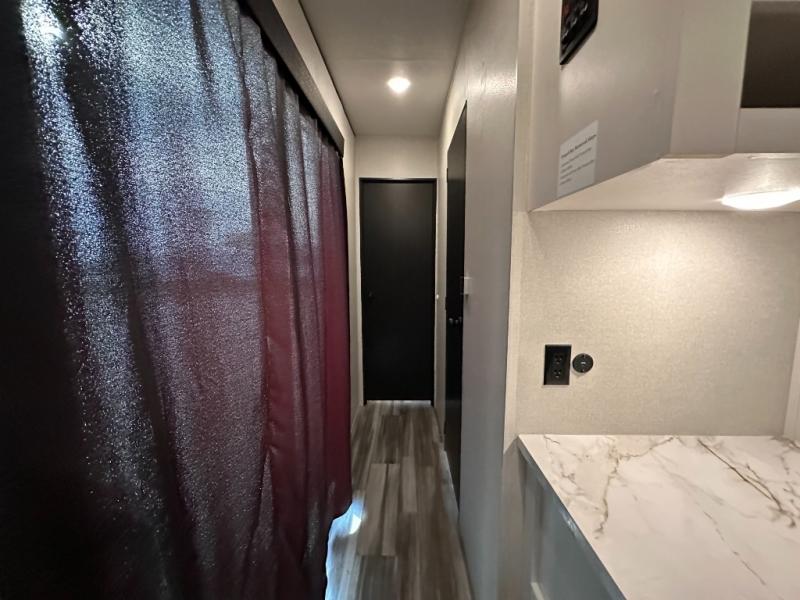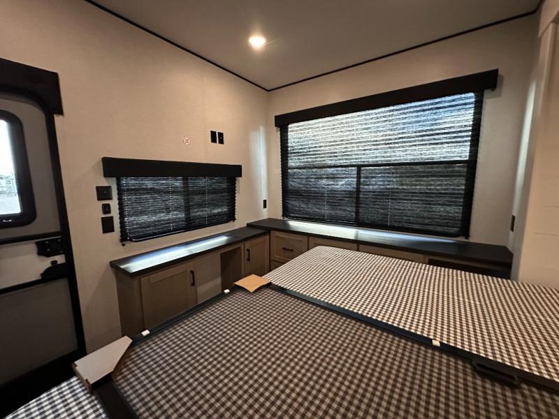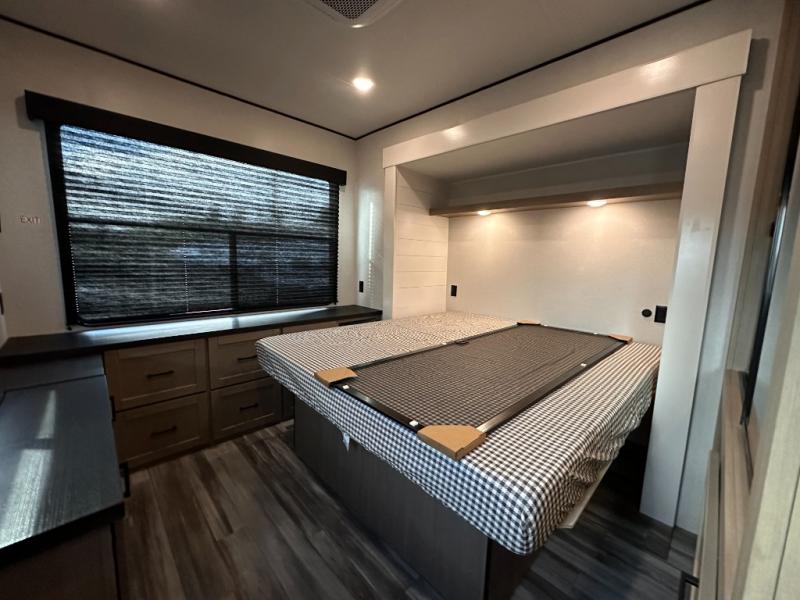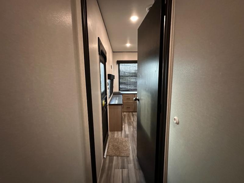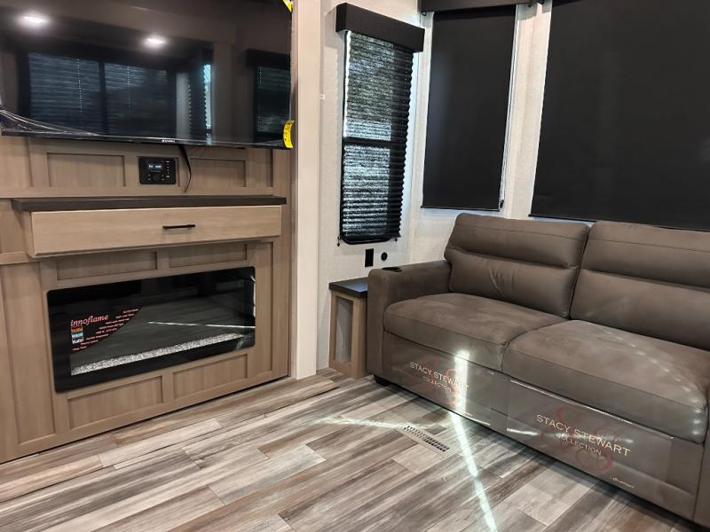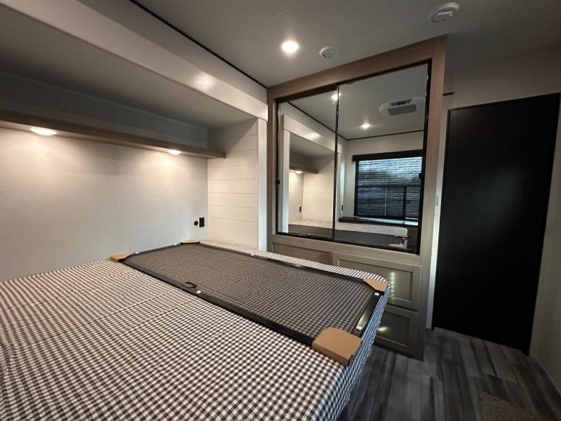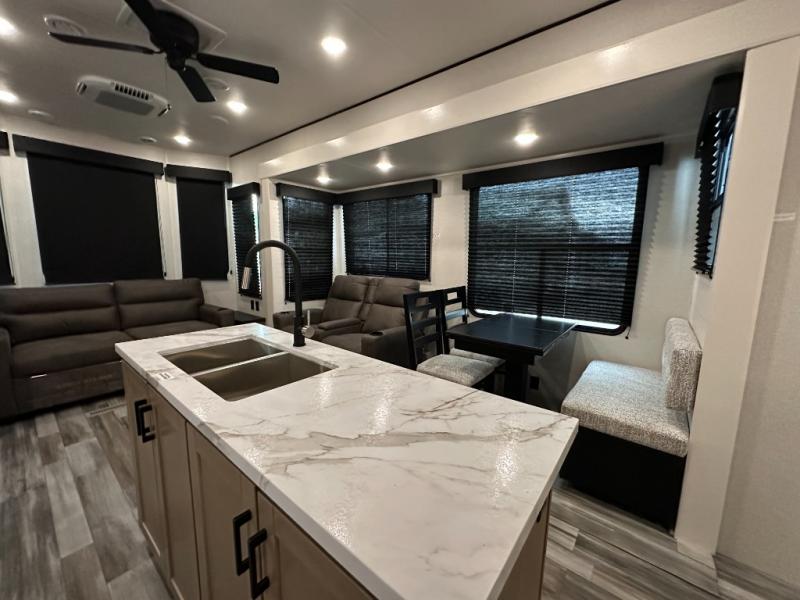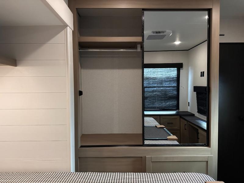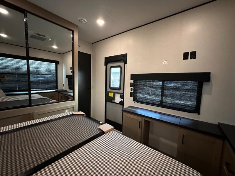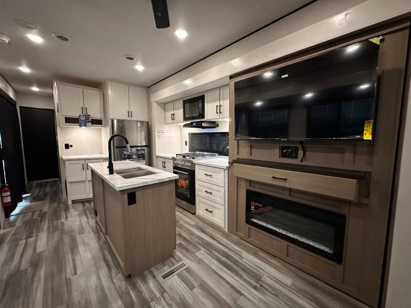 Your crew of four will love extended stays in this triple slide out trailer! Once you've unpacked your bags, you can head to the kitchen to prepare lunch on the cooktop and kitchen island. There is a table and chairs with a bench to dine at, and you can relax on the theater seat after your meal is cleaned up. A front tri-fold sofa will provide more seating space, along with sleeping space for guests. A full bath includes washer and dryer prep if you plan to add these appliances, and the rear private bedroom is sure to make you feel right at home. There is a queen bed slide, a wardrobe, vanity, and large dresser so nothing gets left behind!