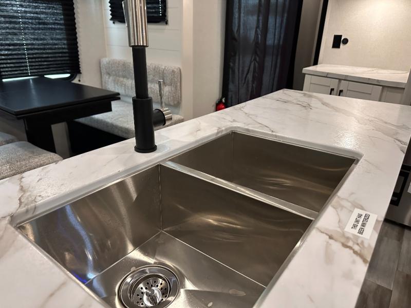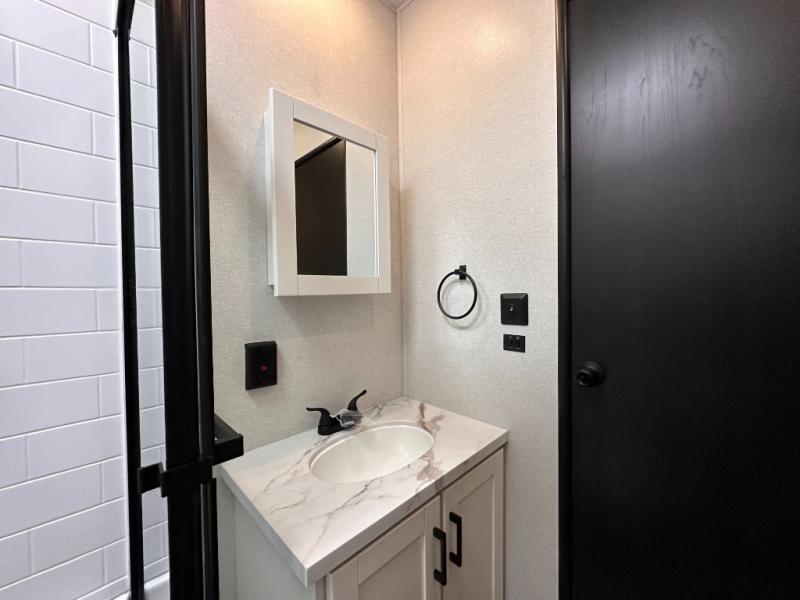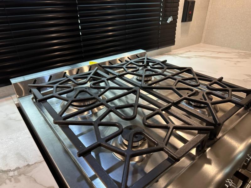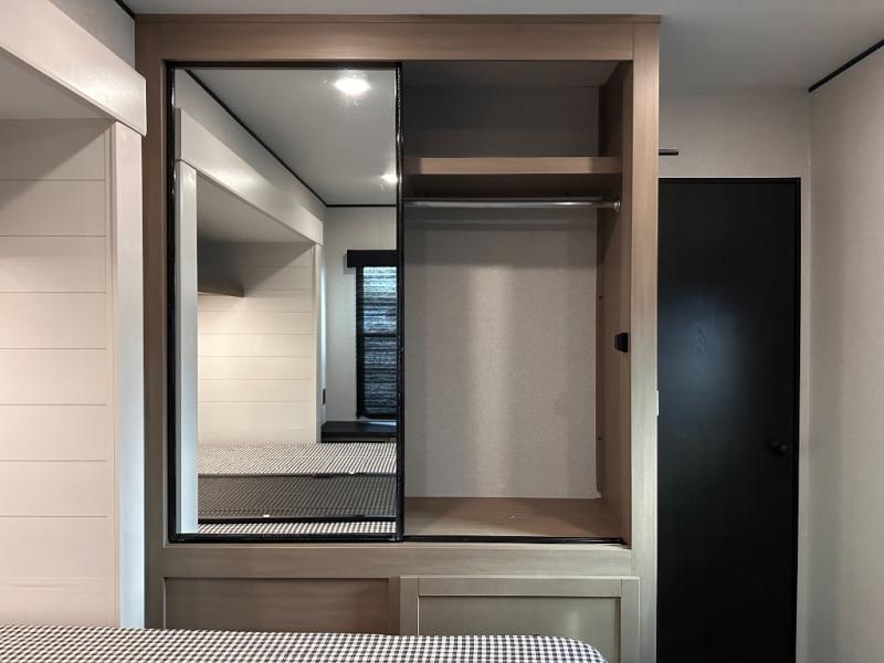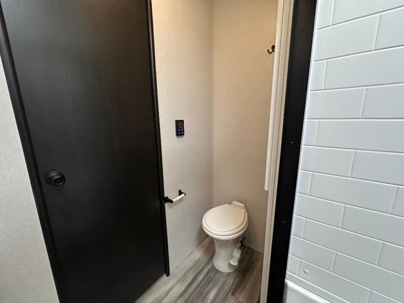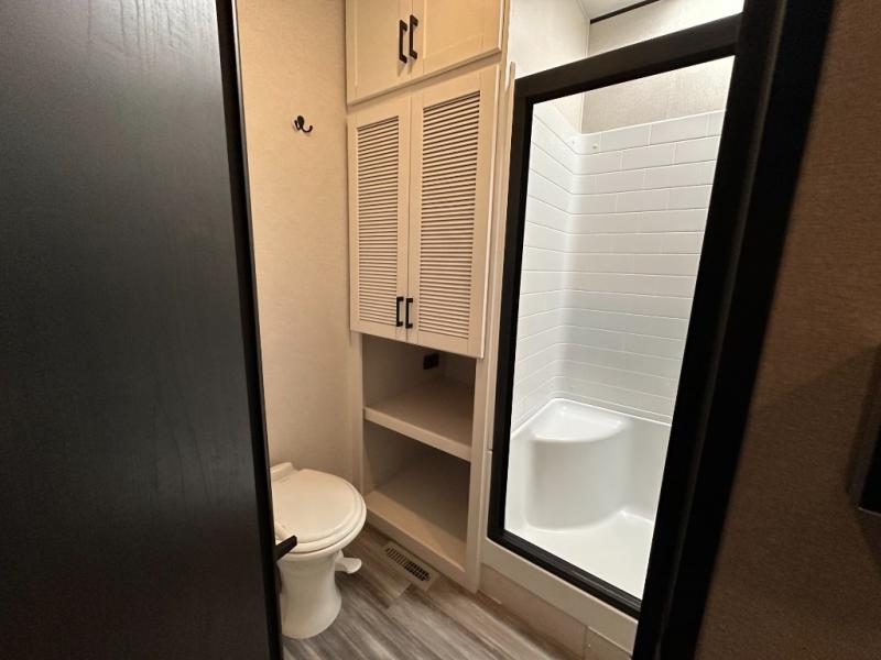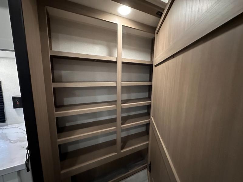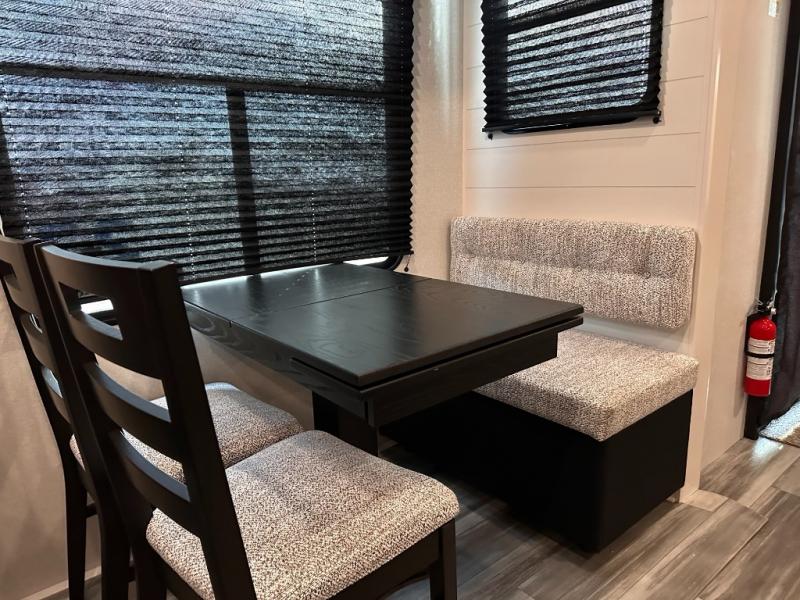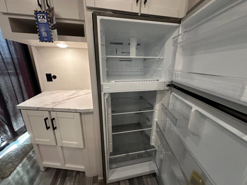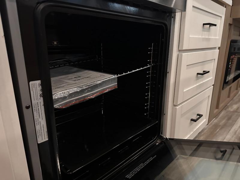 Your crew of four will love extended stays in this triple slide out trailer! Once you've unpacked your bags, you can head to the kitchen to prepare lunch on the cooktop and kitchen island. There is a table and chairs with a bench to dine at, and you can relax on the theater seat after your meal is cleaned up. A front tri-fold sofa will provide more seating space, along with sleeping space for guests. A full bath includes washer and dryer prep if you plan to add these appliances, and the rear private bedroom is sure to make you feel right at home. There is a queen bed slide, a wardrobe, vanity, and large dresser so nothing gets left behind!